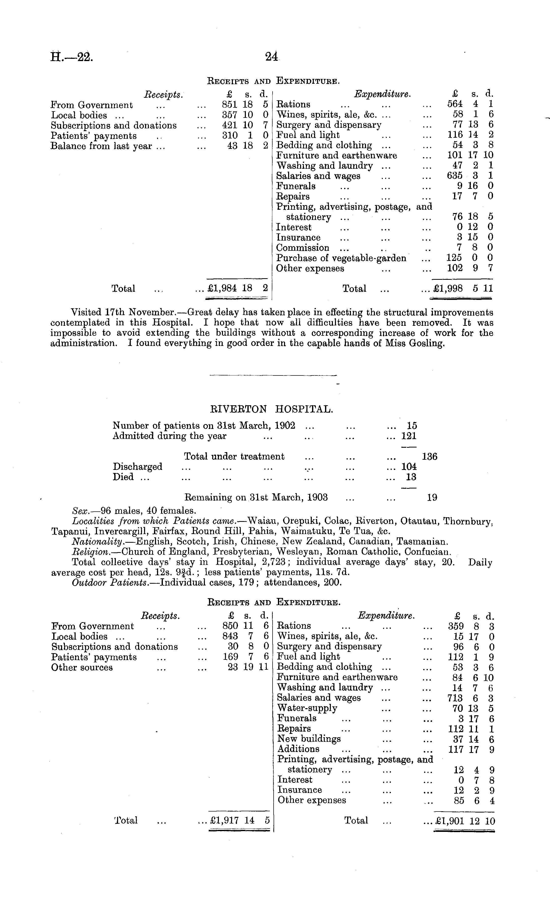 RIVEETON HOSPITAL. Number of patients on 31st March, 1902 ... ... ... 15 Admitted during the year ... .... ... ... 121 Total under treatment ... ... ... 136 Discharged ... ... ... ... ... ... 104 Died ... ... ... ... ... ... ... 13 Eemaining on 31st March, 1903 ... ... 19 Sex. —96 males, 40 females. Localities from which Patients came. —Waiau, Orepuki, Colac, Riverton, Otautau, Thornbury, Tapanui, Invercargill, Fairfax, Round Hill, Pahia, Waimatuku, Te Tua, &c. Nationality. —English, Scotch, Irish, Chinese, New Zealand, Canadian, Tasmanian. Religion. —Church of England, Presbyterian, Wesleyan, Roman Catholic, Confucian. Total collective days' stay in Hospital, 2,723; individual average days' stay, 20. Daily average cost per head, 12s. 9fd.; less patients' payments, lis. 7d. Outdoor Patients. —lndividual cases, 179 ; attendances, 200. Receipts and Expenditure. Receipts. £ s. d. Expenditure. £ s. d. From Government ... ... 850 11 6 Eations ... ... ... 359 8 3 Local bodies ... ... ... 843 7 6 Wines, spirits, ale, &c. ... 15 17 0 Subscriptions and donations ... 30 8 0 Surgery and dispensary ... 96 6 0 Patients'payments ... ... 169 7 6 Fuel and light ... ... 112 1 9 Other sources ... ... 23 19 11 Bedding and clothing ... ... 53 3 6 Furniture and earthenware ... 84 6 10 Washing and laundry ... ... 14 7 6 Salaries and wages ... ... 713 6 3 Water-supply ... ... 70 13 5 Funerals ... ... ... 3 17 6 Eepairs ... ... ... 112 11 1 New buildings ... ... 37 14 6 Additions ... ... ... 117 17 9 Printing, advertising, postage, and stationery ... ... ... 12 4 9 Interest ... ... ... 078 Insurance ... ... ... 12 2 9 Other expenses ... ... 85 6 4 Total ... ...£1,917 14 5 Total ... ...£1,901 12 10