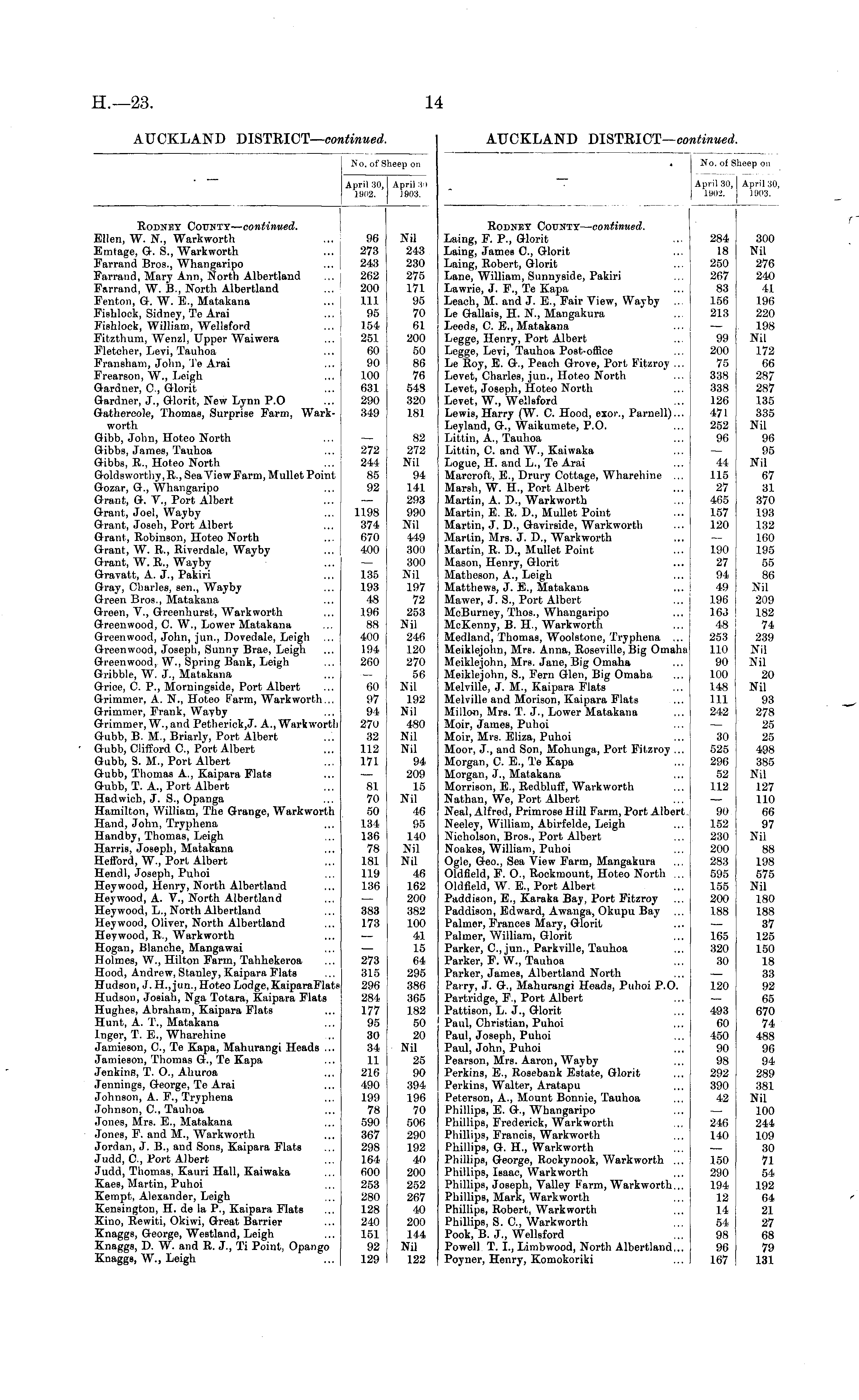 . No. of Sheep on April 30, April 31 1902. 1903. Rodney County— continued. Laing, F. P., Glorit Laing, James O, Glorit Laing, Robert, Glorit Lane, William, Sunnyside, Pakiri Lawrie, J. F., Te Kapa Leach, M. and J. E., Fair View, Wayby ... Le Gallais, H. N., Mangakura Leeds, C. E., Matakana Legge, Henry, Port Albert Legge, Levi, Tauhoa Post-office Le Roy, E. G., Peach Grove, Port Fitzroy ... Levet, Charles, jun., Hoteo North Levet, Joseph, Hoteo North Levet, W., Wellsford Lewis,Harry (W. C. Hood, exor., Parnell)... Leyland, G., Waikumete, P.O. Littin, A., Tauhoa Littin, C. and W., Kaiwaka Logue, H. and L., Te Arai Marcroft, E., Drury Cottage, Wharehine ... Marsh, W. H., Port Albert Martin, A. D., Warkworth Martin, E. R. D., Mullet Point Martin, J. D., Gavirside, Warkworth Martin, Mrs. J. D., Warkworth Martin, R. D., Mullet Point Mason, Henry, Glorit Matheson, A., Leigh Matthews, J. E., Matakana Mawer, J. S., Port Albert McBurney, Thos., Whangaripo McKenny, B. H., Warkworth Medland, Thomas, Woolstone, Tryphena ... Meiklejohn, Mrs. Anna, Roseville, Big Omaha Meiklejohn, Mrs. Jane, Big Omaha Meiklejohn, S., Fern Glen, Big Omaha Melville, J. M., Kaipara Flats Melville and Morison, Kaipara Flats Millon, Mrs. T. J., Lower Matakana Moir, James, Puhoi Moir, Mrs. Eliza, Puhoi Moor, J., and Son, Mohunga, Port Fitzroy ... Morgan, C. E., Te Kapa Morgan, J., Matakana Morrison, E., Redbluif, Warkworth Nathan, We, Port Albert Neal, Alfred, Primrose Hill Farm, Port Albert Neeley, William, Abirfelde, Leigh Nicholson, Bros., Port Albert Noakes, William, Puhoi Ogle, Geo., Sea View Farm, Mangakura Oldfield, F. O., Rockmount, Hoteo North ... Oldfield, W. E„ Port Albert Paddison, E., Karaka Bay, Port Fitzroy PaddiBon, Edward, Awanga, Okupu Bay ... Palmer, Frances Mary, Glorit Palmer, William, Glorit Parker, C, jun., Parkville, Tauhoa Parker, F. W., Tauhoa Parker, James, Albertland North Parry, J. G., Mahurangi Heads, Puhoi P.O. Partridge, F., Port Albert Pattison, L. J., Glorit Paul, Christian, Puhoi Paul, Joseph, Puhoi Paul, John, Puhoi Pearson, Mrs. Aaron, Wayby Perkins, E., Rosebank Estate, Glorit Perkins, Walter, Aratapu Peterson, A., Mount Bonnie, Tauhoa Phillips, E. G., Whangaripo Phillips, Frederick, Warkworth Phillips, Francis, Warkworth Phillips, G. H., Warkworth Phillips, George, Roekynook, Warkworth ... Phillips, Isaac, Warkworth Phillips, Joseph, Valley Farm, Warkworth... Phillips, Mark, Warkworth Phillips, Robert, Warkworth Phillips, S. C, Warkworth Pook, B. J., Wellsford Powell T. I., Limbwood, North Albertland... Poyner, Henry, Komokoriki 284 18 250 267 83 156 213 99 200 75 338 338 126 471 252 96 44 115 27 465 157 120 190 27 94 49 196 163 48 253 110 90 100 148 111 242 30 525 296 52 112 300 Nil 276 240 41 196 220 198 Nil 172 66 287 287 135 335 Nil 96 95 Nil 67 31 370 193 132 160 195 55 86 Nil 209 182 74 239 Nil Nil 20 Nil 93 278 25 25 498 385 Nil 127 110 66 97 Nil 88 198 575 Nil 180 188 37 125 150 18 33 92 65 670 74 488 96 94 289 381 Nil 100 244 109 30 71 54 192 64 21 27 68 79 131 90 152 230 200 283 595 155 200 188 165 320 30 120 493 60 450 90 98 292 390 42 246 140 150 290 194 12 14 54 98 96 167