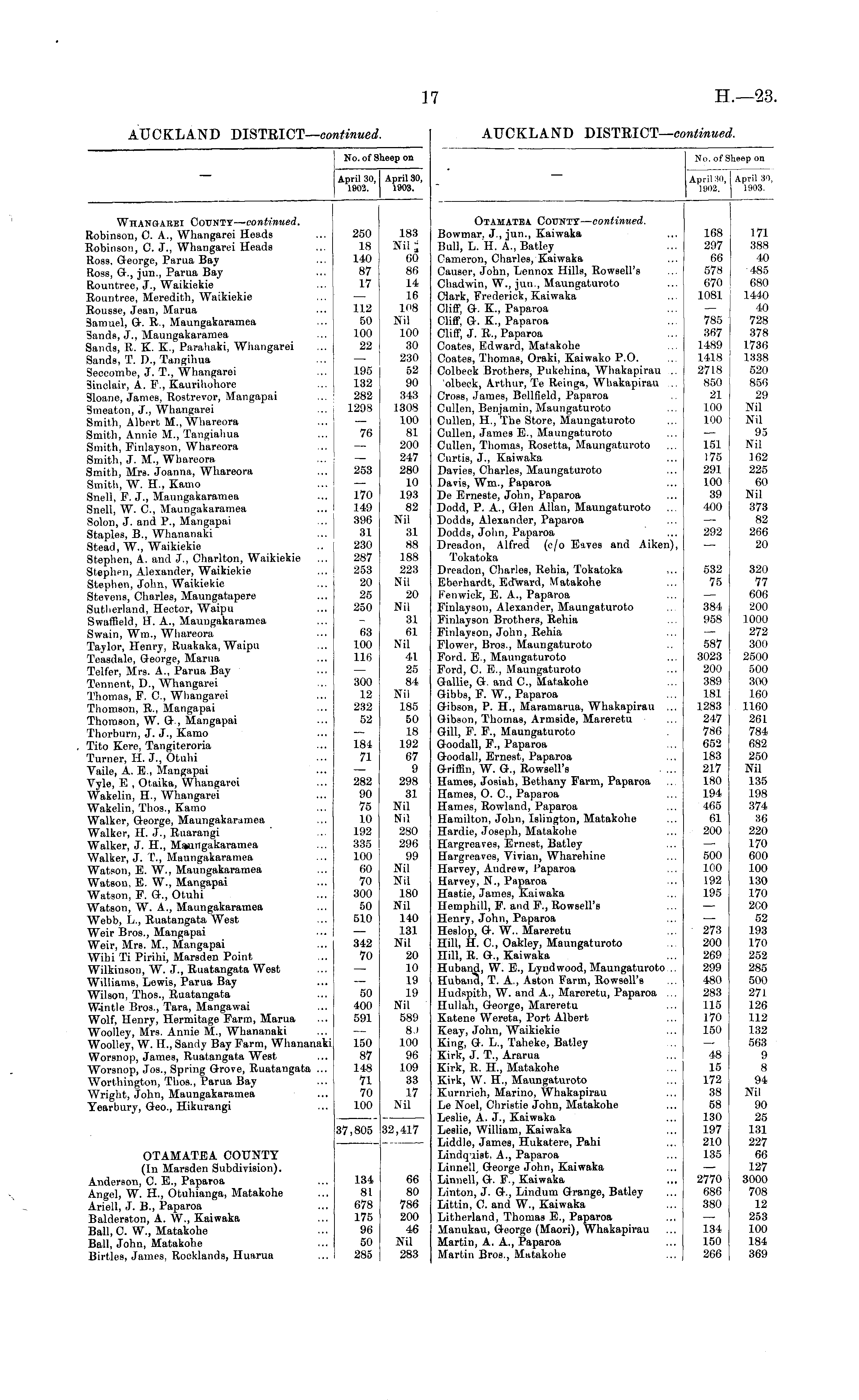 No. of Sheep on April 30, April 30, 11)02. 1903. Otamatea County— continued. Bowmar. J., jun., Kaiwaka Bull, L. H. A., Batley Cameron, Charles, Kaiwaka Causer, John, Lennox Hills, Rowsell's Chadwin, W., jun., Maungaturoto Clark, Frederick, Kaiwaka Cliff, G. K., Paparoa Cliff, G. K, Paparoa Cliff, J. R., Paparoa Coates, FLdward, Matakohe Coates, Thomas, Oraki, Kaiwako P.O. Colbeck Brothers, Pukehina, Whakapirau .. olbeck, Arthur, Te Reinga, Whakapirau ... Cross, Jamea, Bellfleld, Paparoa Cullen, Benjamin, Maungaturoto Cullen, H., The Store, Maungaturoto Cullen, James E., Maungaturoto Cullen, Thomas, Rosetta, Maungaturoto Curtis, J., Kaiwaka Davies, Charles, Maungaturoto Davis, Wm., Paparoa De Erneste, John, Paparoa Dodd, P. A., Glen Allan, Maungaturoto Dodds, Alexander, Paparoa Dodds, John, Paparoa Dreadon, Alfred (c/o Eaves and Aiken), Tokatoka Dreadon, Charles, Rehia, Tokatoka Eberhardt, Edward, Matakohe Fenwick, E. A., Paparoa Finlayson, Alexander, Maungaturoto Finlayson Brothers, Rehia Finlayson, John, Rehia Flower, Bros., Maungaturoto Ford. E., Maungaturoto Ford, C. E., Maungaturoto Gallie, G. and O, Matakohe Gibbs, F. W., Paparoa Gibson, P. H., Maramarua, Whakapirau ... Gibson, Thomas, Armside, Mareretu Gill, F. F., Maungaturoto Goodall, F., Paparoa Goodall, Ernest, Paparoa Griffin, W. G., Rowsell's Hames, Josiah, Bethany Farm, Paparoa Hames, 0. O, Paparoa Hames, Rowland, Paparoa Hamilton, John, Islington, Matakohe Hardie, Joseph, Matakohe Hargreaves, Ernest, Batley Hargreaves, Vivian, Wharehine Harvey, Andrew, Paparoa Harvey, N., Paparoa Hastie, James, Kaiwaka Hemphill, F. and F., Rowsell's Henry, John, Paparoa Heslop, G. W, Mareretu Hill, H. C, Oakley, Maungaturoto Hill, R. G., Kaiwaka Huband, W. E., Lyndwood, Maungaturoto .. Huband, T. A., Aston Farm, Rowsell's Hudspith, W. and A., Mareretu, Paparoa ... Hullah, George, Mareretu Katene Wereta, Port Albert Keay, John, Waikiekie King, G. L., Taheke, Batley Kirk, J. T., Ararua Kirk, R. H., Matakohe Kirk, W. H., Maungaturoto Kurnrich, Marino, Whakapirau Le Noel, Christie John, Matakohe Leslie, A. J., Kaiwaka Leslie, William, Kaiwaka Liddle, James, Hukatere, Pahi Lindqiist, A., Paparoa Linnell, George John, Kaiwaka Linnell, G. F., Kaiwaka Linton, J. G., Lindum Grange, Batley Littin, C. and W., Kaiwaka Litherland, Thomas E., Paparoa Manukau, George (Maori), Whakapirau Martin, A. A., Paparoa Martin Bros., Matakohe 168 297 66 578 670 1081 785 367 1489 1418 2718 850 21 100 100 151 175 291 100 39 400 292 532 75 384 958 587 3023 200 389 181 1283 247 786 652 183 217 180 194 '465 61 200 171 388 40 485 680 1440 40 728 378 1736 1338 520 856 29 Nil Nil 95 Nil 162 225 60 Nil 373 82 266 20 320 77 606 200 1000 272 300 2500 500 300 160 1160 261 784 682 250 Nil 135 198 374 36 220 170 600 100 130 170 200 52 193 170 252 285 500 271 126 112 132 563 9 8 94 Nil 90 25 131 227 66 127 3000 708 12 253 100 184 369 500 100 192 195 273 200 269 299 480 283 115 170 150 48 15 172 38 58 130 197 210 135 2770 686 380 134 150 266
