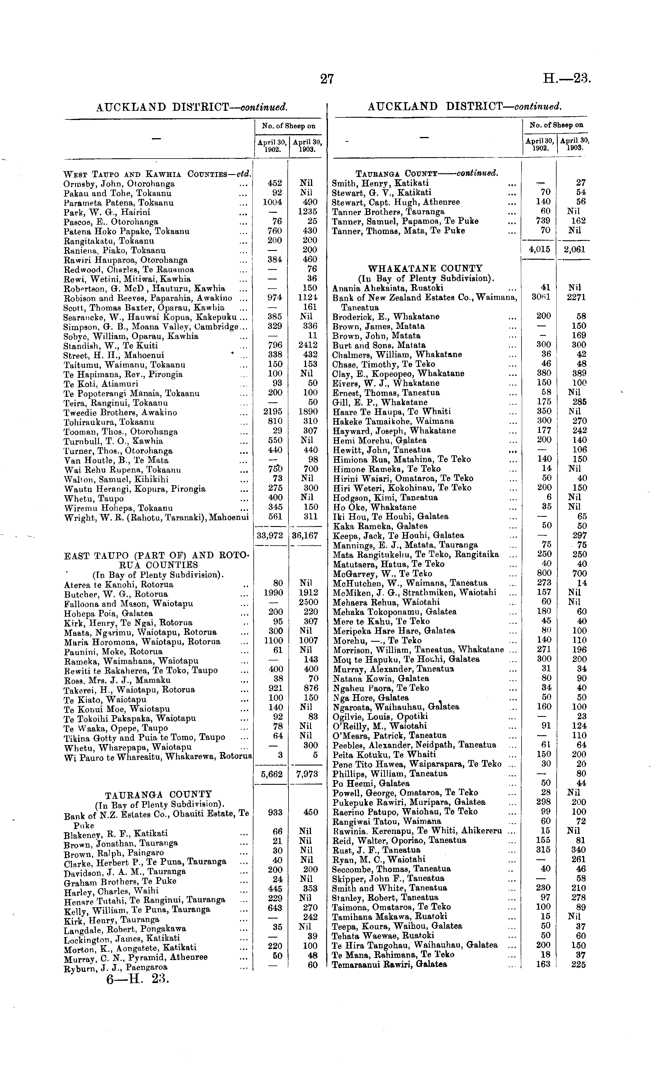 No. of Sheep on April 30, April 3i 1902. 1903. April 31 1903. Tauranga County continued. Smith, Henry, Katikati Stewart, G. V., Katikati Stewart, Capt. Hugh, Athenree Tanner Brothers, Tauranga Tanner, Samuel, Papamoa, Te Puke Tanner, Thomas, Mata, Te Puke 70 140 60 739 70 27 54 56 Nil 162 Nil 4,015 2,061 WHAKATANE COUNTY (In Bay of Plenty Subdivision). Anania Ahekaiata, Ruatoki Bank of New Zealand Estates Co., Waimana, Taneatua Broderick, E., Whakatane Brown, James, Matata Brown, John, Matata Burt and Sons, Matata Chalmers, William, Whakatane Chase, Timothy, Te Teko Clay, E., Kopeopeo, Whakatane Eivers, W. J., Whakatane ErneBt, Thomas, Taneatua Gill, E. P., Whakatane Haare Te Haupa, Te Whaiti Hakeke Tamaikohe, Waimana Hayward, Joseph, Whakatane Hemi Morehu, Galatea Hewitt, John, Taneatua Himiona Rua, Matahina, Te Teko Himone Rameka, Te Teko Hirini Waiari, Omataroa, Te Teko Hiri Weteri, Kokohinau, Te Teko Hodgson, Kimi, Taneatua Ho Oke, Whakatane Iki Hou, To Houhi, Galatea Kaka Rameka, Galatea Keepa, Jack, Te Houhi, Galatea Mannings, E. J., Matata, Tauranga Mata Rangitukeliu, Te Teko, Rangitaika ... Matutaera, Hatua, Te Teko McGarvey, W., Te Teko McHutehen, W., Waimana, Taneatua McMiken, J. G., Strathmiken, Waiotahi Mehaera Rehua, Waiotahi Mehaka Tokoponamu, Galatea Mere te Kahu, Te Teko Meripeka Hare Hare, Galatea Morehu,—., Te Teko Morrison, William, Taneatua, Whakatane ... Mon te Hapuku, Te Houhi, Galatea Murray, Alexander, Taneatua Natana Kowia, Galatea Ngaheu Paora, Te Teko N ga Hore, Galatea Ngaroata, Waihauhau, Galatea Ogilvie, Louis, Opotiki O'Reilly, M., Waiotahi O'Meara, Patrick, Taneatua Peebles, Alexander, Neidpath, Taneatua Peita Kotuku, Te Whaiti Pene Tito Hawea, Waiparapara, Te Teko .. Phillips, William, Taneatua Po Heemi, Galatea Powell, George, Omataroa, Te Teko Pukepuke Rawiri, Muripara, Galatea Raerino Patupo, Waiohau, Te Teko Rangiwai Tatou, Waimana Rawinia. Kerenapu, Te Whiti, Ahikereru ... Reid, Walter, Oporiao, Taneatua Rust, J. F., Taneatua Ryan, M. O, Waiotahi Seccombe, Thomas, Taneatua Skipper, John F., Taneatua Smith and White, Taneatua Stanley, Robert, Taneatua Taimona, Omataroa, Te Teko Tamihana Makawa, Ruatoki Teepa, Koura, Waihou, Galatea Tehata Waewae, Ruatoki Te Hira Tangohau, Waihauhau, Galatea ... Te Mana, Rahimana, Te Teko Temaraanui Rawiri, Galatea I 41 30H1 200 300 36 46 380 150 58 175 350 300 177 200 140 14 50 200 6 35 50 75 250 40 800 273 157 60 180 45 80 140 271 300 31 80 34 50 160 Nil 2271 58 150 169 300 42 48 389 100 Nil 285 Nil 270 242 140 106 150 Nil 40 150 Nil Nil 65 50 297 75 250 40 700 14 Nil Nil 60 40 100 110 196 200 34 90 40 50 100 23 124 110 64 200 20 80 44 Nil 200 100 72 Nil 81 340 261 46 58 210 278 89 Nil 37 60 150 37 225 91 61 150 30 50 28 298 99 60 15 155 315 40 230 97 100 15 50 50 200 18 163