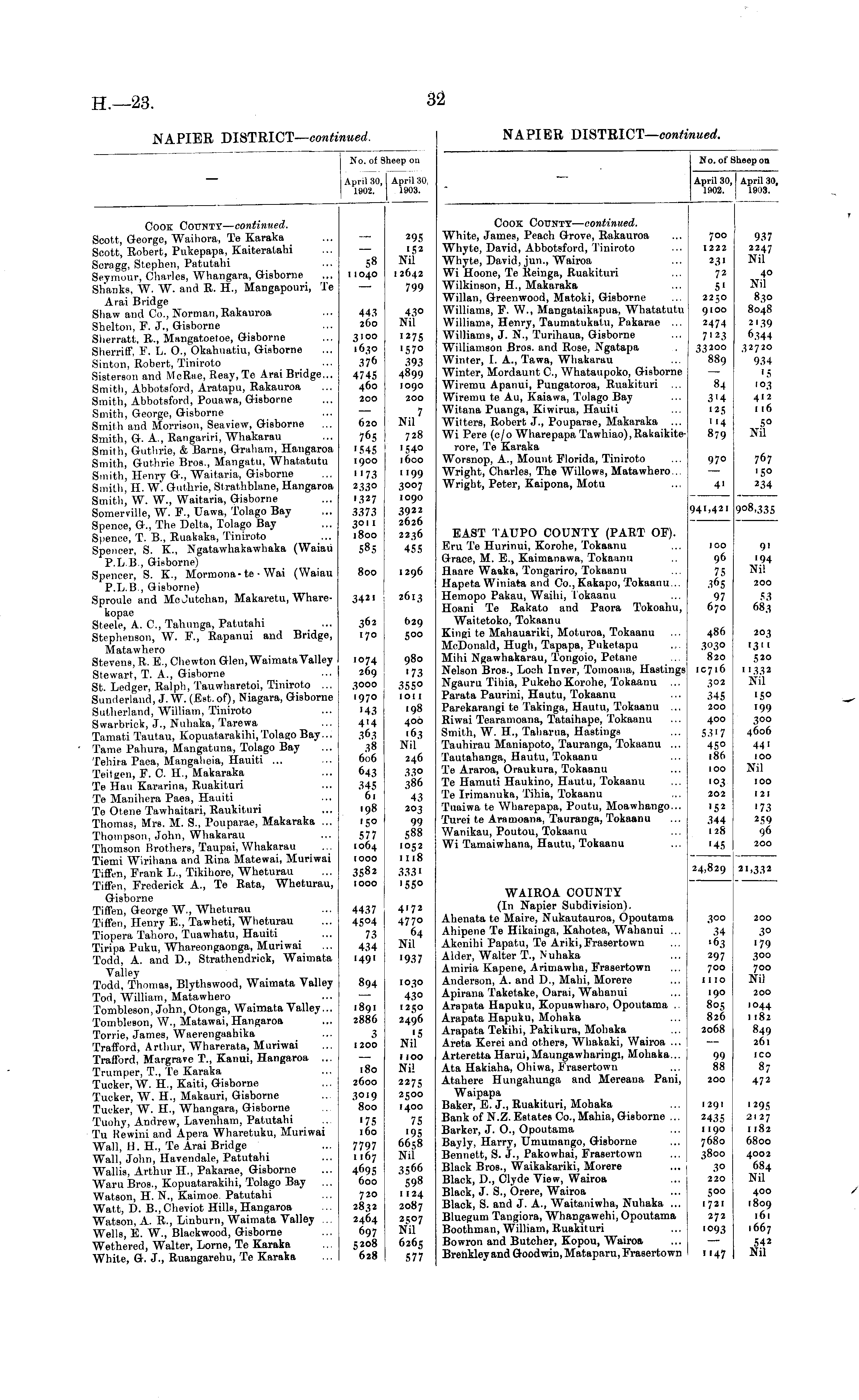 No. of Sheep on April 30,1 April 3' 1902. 1903. I April 30, 1903. Cook County— continued. White, James, Peach Grove, Rakauroa Whyte, David, Abbotsford, Tiniroto Whyte, David, jun., Wairoa Wi Hoone, Te Reiiiga, Ruakituri Wilkinson, H., Makaraka Willan, Greenwood, Matoki, Gisborne Williams, F. W., Mangataikapua, Whatatutu Williams, Henry, Taumatukatu, Pakarae ... Williams, J. N., Turihaua, Gisborne Williamson Bros, and Rose, Ngatapa Winter, I. A., Tawa, Whakarau Winter, Mordaunt C, Whataupoko, Gisborne Wiremu Apanui, Pungatoroa, Ruakituri Wiremu te Au, Kaiawa, Tolago Bay Witana Puanga, Kiwirua, Hauiti Witters, Robert J., Pouparae, Makaraka ... Wi Pere (c/o Wharepapa Tawhiao),Rakaikiterore, Te Karaka Worsnop, A., Mount Florida, Tiniroto Wright, Charles, The Willows, Matawhero.. Wright, Peter, Kaipona, Motu 700 1222 937 2247 Nil 231 72 5' 2250 9100 2474 7 12 3 33200 889 40 Nil 830 8048 2139 6.H4 32720 934 ■5 '°3 412 116 5° Nil 84 3'4 '25 114 8/9 970 4' 767 '5° 2.34 908,335 EAST TAUPO COUNTY (PART OF). Eru Te Hurinui, Korohe, Tokaanu Grace, M. E., Kaimanawa, Tokaanu Haare Waaka, Tongariro, Tokaanu Hapeta Winiata and Co., Kakapo, Tokaanu... Hemopo Pakau, Waihi, Tokaanu Hoani Te Rakato and Paora Tokoahu, Waitetoko, Tokaanu Kingi te Mahauariki, Moturoa, Tokaanu McDonald, Hugh, Tapapa, Puketapu Mihi Ngawhakarau, Tongoio, Petane Nelson Bros-, Loch Inver, Tomoana, Hastings Ngauru Tibia, Pukeho Korohe, Tokaanu Parata Paurini, Hautu, Tokaanu Parekarangi te Takinga, Hautu, Tokaanu ... Riwai Tearamoana, Tataihape, Tokaanu Smith, W. H., Taharua, Hastings Tauhirau Maniapoto, Tauranga, Tokaanu ... Tautahanga, Hautu, Tokaanu Te Araroa, Oraukura, Tokaanu Te Hamuli Haukino, Hautu, Tokaanu Te Irimanuka, Tihia, Tokaanu Tuaiwa te Wharepapa, Poutu, Moawhango... Turei te Aramoana, Tauranga, Tokaanu Wanikau, Poutou, Tokaanu Wi Tamaiwhana, Hautu, Tokaanu 941,421 IOO 96 75 365 97 670 9' '94 Nil 200 53 683 486 3030 820 10716 302 345 200 203 "3" 520 "332 Nil '5° 199 300 4606 44' too Nil 400 53'7 450 186 100 '°3 202 100 121 '52 344 128 '73 259 96 200 '45 24,829 21,332 WAIROA COUNTY (In Napier Subdivision). Ahenata te Maire, Nukautauroa, Opoutama Ahipene Te Hikainga, Kahotea, Wahanui ... Akenihi Papatu, Te Ariki, Frasertown Alder, Walter T., Nuhaka Amiria Kapene, Arimawha, Frasertown Anderson, A. and D., Mahi, Morere Apirana Taketake, Oarai, Wahanui Arapata Hapuku, Kopuawharo, Opoutama .. j Arapata Hapuku, Mohaka Arapata Tekihi, Pakikura, Mohaka Areta Kerei and others, Whakaki, Wairoa ... Arteretta Harui, Maungawharingi, Mohaka .. Ata Hakiaha, Ohiwa, Frasertown Atahere Hungahunga and Mereana Pani, Waipapa Baker, E. J., Ruakituri, Mohaka Bank of N.Z. Estates Co., Mahia, Gisborne ... Barker, J. O., Opoutama Bayly, Harry, Umumango, Gisborne Bennett, S. J., Pakowhai, Frasertown Black Bros., Waikakariki, Morere ... | Black, D., Clyde View, Wairoa Black, J. S., Orere, Wairoa Black, S. and J. A., Waitaniwha, Nuhaka ... Bluegum Tangiora, Whangawehi, Opoutama Boothman, William, Ruakituri Bowron and Butcher, Kopou, Wairoa Brenkley and Goodwin, Mataparu, Frasertown 300 34 163 297 700 1110 190 805 826 2068 99 88 200 200 3° '79 300 700 Nil 200 1044 1182 849 261 ico 87 472 1291 2435 1190 7680 3800 3° 220 500 1721 272 '093 '295 21 27 1182 6800 4002 684 Nil 400 1809 161 1667 542 Nil "47