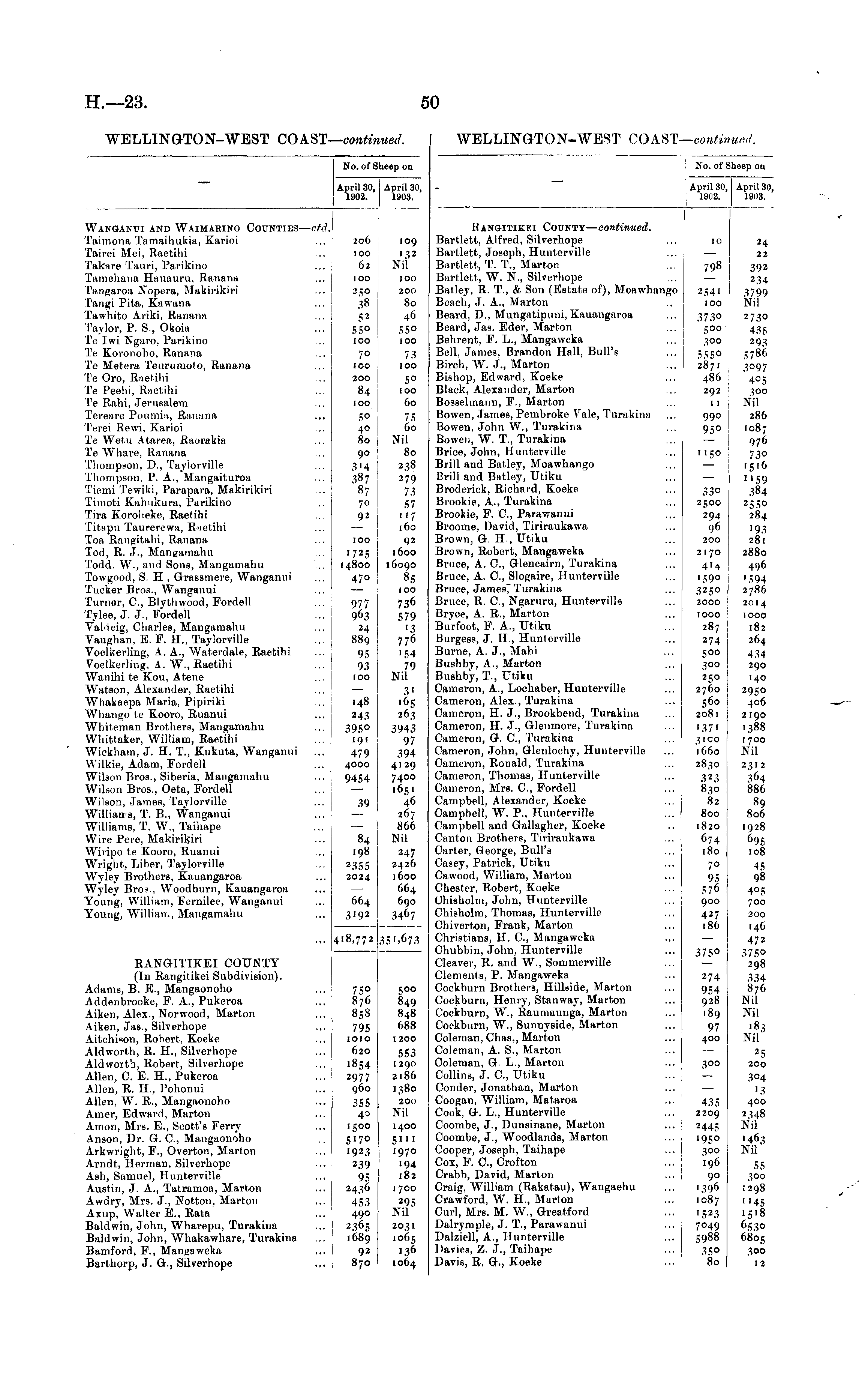 No. of Sheep on April 30, I April 30, 1902. 1903. Wanganui and Waimabino Counties — ctd. Taimona Tamaihukia, Karioi ... 206 Tairei Mei, Raetihi ... 100 Takare Tauri, Parikino ... 62 Tamehana Hauauru, Ranana ... 100 Tangaroa Nopera, Makirikiri ... 250 fungi Pita, Kawana ... 38 Tawhito Ariki, Ranana ... 52 Taylor, P. S., Okoia ... 5*50 Te Iwi Ngaro, Parikino ... 100 Te Koronoho, Ranana ... 70 Te Metera Teurumoto, Ranana ... 100 'le Oro, Raetihi ... 200 Te Peehi, Raetihi ... 84 Te Rahi, Jerusalem ... 100 Tereare Poumia, Ranana ... 50 Terei Rewi, Karioi ... 40 Te Wetu Atarea, Raorakia ... 80 Te Whare, Ranana ... 90 Thompson, D., Taylorville ... 314 Thompson, P. A., Mangaituroa ... 387 Tiemi Tewiki, Parapara, Makirikiri ... 87 Timoti Kahukura, Parikino ... 70 Tira Koroheke, Raetihi ... 92 Titapu Taurerewa, Raetihi ... — Toa Rangitahi, Ranana ... 100 Tod, R. J., Mangamahu ... 1725 Todd. W., and Sons, Mangamahu ... 14800 Towgood, S. H , GraBsmere, Wanganui ... 470 Tucker Bros., Wanganui ... — Turner, C, Blythwood, Fordell ... 977 Tylee, J. J., Fordell ... 963 Valieig, Charles, Mangamahu ... 24 Vaughan, E. F. H., Taylorville ... 889 Voelkerling, A. A., Waterdale, Raetihi ... 95 Voelkerling. A. W., Raetihi ... 93 Wanihi te Kou, Atene ... 100 Watson, Alexander, Raetihi ... — Whakaepa Maria, Pipiriki ... 148 Whango te Kooro, Ruanui ... 243 Whiteman Brothers, Mangamahu ... 3950 Whittaker, William, Raetihi ... 191 Wickham, J. H. T., Kukuta, Wanganui ... 479 Wilkie, Adam, Fordell ... 4000 Wilson Bros., Siberia, Mangamahu ... 9454 Wilson Bros., Oeta, Fordell ... — Wilson, James, Taylorville ... 39 Williams, T. B., Wanganui ... — Williams, T. W., Taihape ... — Wire Pere, Makirikiri •■• 84 Wiripo te Kooro, Ruanui ... 198 Wright, Liber, Taylorville ... 2355 Wyley Brothers, Kauangaroa ... 2024 Wyley Bros , Woodburn, Kauangaroa ... — Young, William, Fernilee, Wanganui ... 664 Young, William, Mangamahu ... 3192 ... 4'8,772 109 I 1,2 Nil IOO 200 80 46 55° IOO 73 100 5° 100 60 75 60 Nil 80 238 279 73 57 "7 160 92 1600 16090 85 100 736 579 '3 776 '54 79 Nil 3' '65 263 3943 97 394 4129 7400 .65. 46 267 866 Nil 247 2426 1600 664 690 3467 35'.673 RANGITIKEI COUNTY (In Rangitikei Subdivision). Adams, B. E., Mangaonoho ... 750 Addenbrooke, F. A., Pukeroa ... 876 Aiken, Alex., Norwood, Marton ... 85S Aiken, Jas., Silverhope ... 795 Aitchison, Robert, Koeke ... 1010 Aldworth, R. H., Silverhope ... 620 Aldwoitb, Robert, Silverhope ... 1854 Allen, C. E. H., Pukeroa ... 2977 Allen, R. H., Pohonui ... 960 Allen, W. R., Mangaonoho ... 355 Amer, Edward, Marton ... 40 Amon, Mrs. E., Scott's Ferry ... 1500 Anson, Dr. G. O, Mangaonoho 5'7° Arkwright, F., Overton, Marton ... 1923 Arndt, Herman, Silverhope ... 239 AbIi, Samuel, Hunterville ... 95 Austin, J. A., Tatramoa, Marton ... 2436 Awdry, Mrs. J., Norton, Marton ... 453 Axup, Walter E., Rata ... , 490 Baldwin, John, Wharepu, Turakina ... 2365 Baldwin, John, Whakawhare, Turakina ... 1689 Bamford, F., Mangaweka ... 92 Barthorp, J. G., Silverhope .,. i 870 500 849 848 688 1200 553 1290 2186 1380 200 Nil 1400 51 11 1970 194 182 1700 295 Nil 2031 1065 136 1064