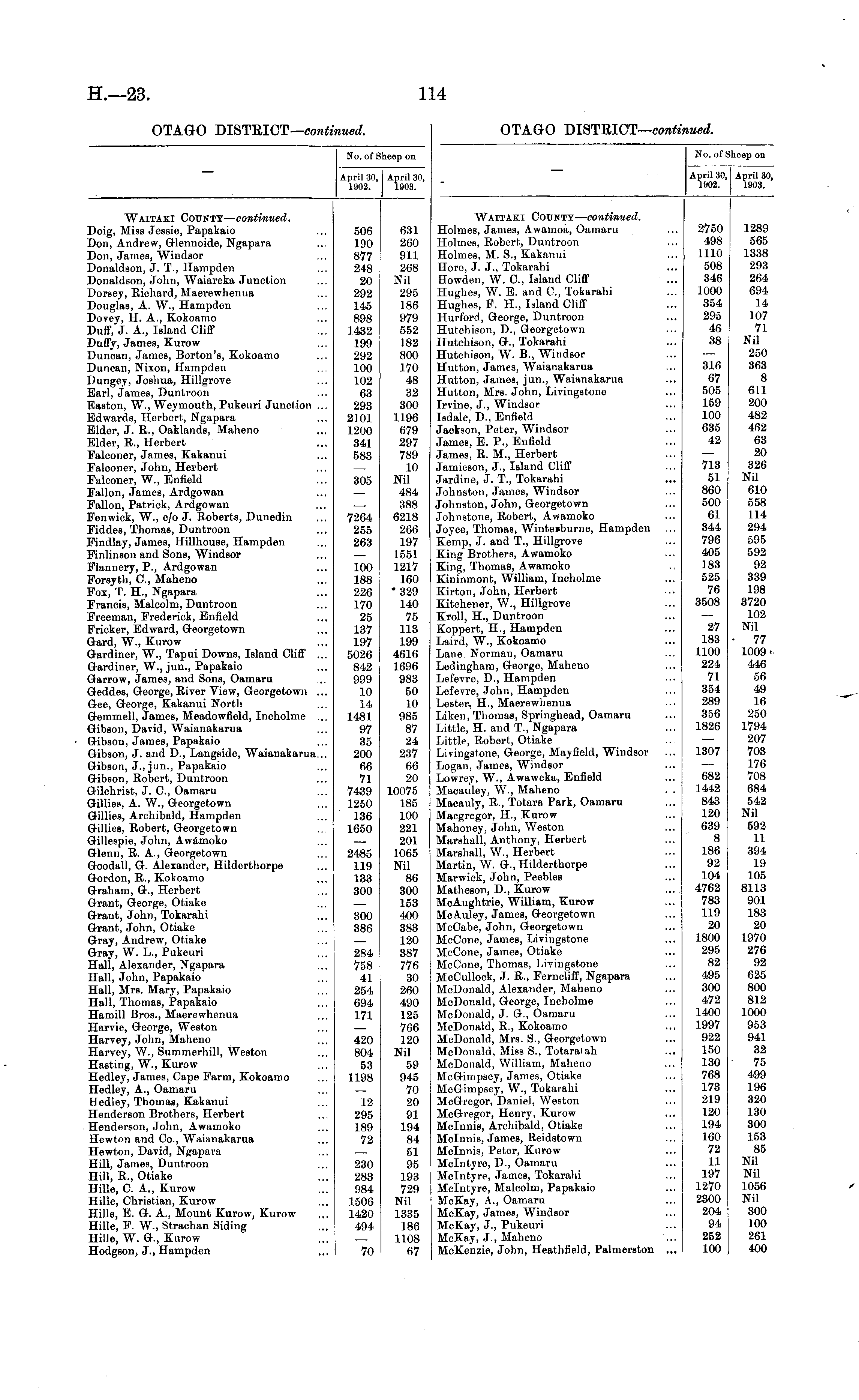 o.oi leep on April 30, 1902. April 30, 1903. Waitaki County— continued. Doig, Mies Jessie, Papakaio Don, Andrew, Glennoide, Ngapara Don, James, Windsor Donaldson, J. T., Hampden Donaldson, John, Waiareka Junction Dorsey, Richard, Maerewhenua Douglas, A. W., Hampden Dovey, H. A., Kokoamo Duff, J. A., Island Cliff Duffy, James, Kurow Duncan, Jamea, Borton's, Kokoamo Duncan, Nixon, Hampden Dungey, Joshua, Hillgrove Earl, James, Duntroon Easton, W., Weymouth, Pukeuri Junction ... Edwards, Herbert, Ngapara Elder, J. R., Oaklands, Maheno Elder, R., Herbert Falconer, James, Kakanui Falconer, John, Herbert Falconer, W., Enfield Fallon, James, Ardgowan Fallon, Patrick, Ardgowan Fenwick, W., c/o J. Roberts, Dunedin Fiddes, Thomas, Duntroon Findlay, James, Hillhouse, Hampden Finlinson and Sons, Windsor Flannery, P., Ardgowan Forsythj O, Maheno Fox, T. H., Ngapara Francis, Malcolm, Duntroon Freeman, Frederick, Enfield Fricker, Edward, Georgetown Gard, W, Kurow Gardiner, W., Tapui Downs, Island Cliff ... Gardiner, W., jun., Papakaio Garrow, James, and Sons, Oamaru Geddes, George, River View, Georgetown ... Gee, George, Kakanui North Gemmell, James, Meadowfield, Incholme ... Gibson, David, Waianakarua Gibson, James, Papakaio Gibson, J. and D., Langside, Waianakarua... Gibson, J., jun., Papakaio Gibson, Robert, Duntroon Gilchrist, J. C, Oamaru Gillies, A. W., Georgetown Gillies, Archibald, Hampden Gillies, Robert, Georgetown Gillespie, John, Awamoko Glenn, R. A., Georgetown Goodall, G. Alexander, Hilderthorpe Gordon, R., Kokoamo Graham, G., Herbert Grant, George, Otiake Grant, John, Tokarahi Grant, John, Otiake Gray, Andrew, Otiake Gray, W. L., Pukeuri Hall, Alexander, Ngapara Hall, John, Papakaio Hall, Mrs. Mary, Papakaio Hall, Thomas, Papakaio Hamill Bros., Maerewhenua Harvie, George, Weston Harvey, John, Maheno Harvey, W., Summerhill, Weston Hasting, W., Kurow Hedley, James, Cape Farm, Kokoamo Hedley, A., Oamaru Hedley, Thomas, Kakanui Henderson Brothers, Herbert Henderson, John, Awamoko Hewton and Co., Waianakarua Hewton, David, Ngapara Hill, James, Duntroon Hill, R., Otiake Hille, C. A., Kurow Hille, Christian, Kurow Hille, E. G. A., Mount Kurow, Kurow Hille, F. W., Strachan Siding Hille, W. G., Kurow Hodgson, J., Hampden 506 190 877 248 20 292 145 898 1432 199 292 100 102 63 293 2101 1200 341 583 305 7264 255 263 100 188 226 170 25 137 197 5026 812 999 10 14 1481 97 35 200 66 71 7439 1250 136 1650 631 260 911 268 Nil 295 186 979 552 182 800 170 48 32 300 1196 679 297 789 10 Nil 484 388 6218 266 197 1551 1217 160 *329 140 75 113 199 4616 1696 983 50 10 985 87 24 237 66 20 10075 185 100 221 201 1065 Nil 86 300 153 400 383 120 387 776 30 260 490 125 766 120 Nil 59 945 70 20 91 194 84 51 95 193 729 Nil 1335 186 1108 67 2485 119 133 300 300 386 284 758 41 254 694 171 420 804 53 1198 12 295 189 72 230 283 984 1506 1420 494 70