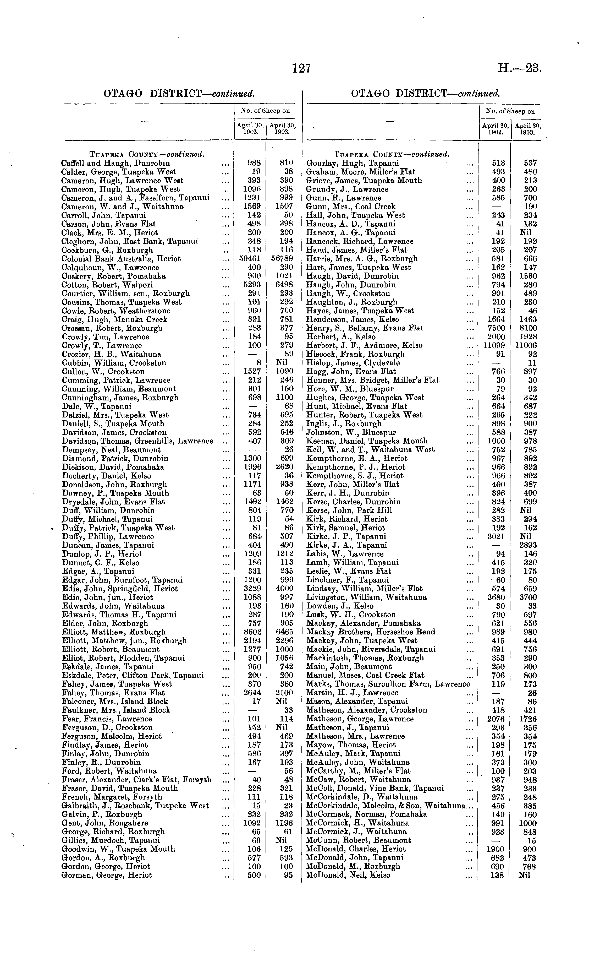 No. of Sheep on April 30, April 30, 1902. 1903. Tuapeka County— continued. Gourlay, Hugh, Tapanui Graham, Moore, Miller's Flat Grieve, James, Tuapeka Mouth Grundy, J., Lawrence Gunn, R., Lawrence Gunn, Mrs., Coal Creek Hall, John, Tuapeka West Hancox, A. D., Tapanui Hancox, A. G., Tapanui Hancock, Richard, Lawrence Hand, James, Miller's Flat Harris, Mrs. A. G., Roxburgh Hart, James, Tuapeka West Haugh, David, Dunrobin Haugh, John, Dunrobin Haugh, W., Crookston Haughton, J., Roxburgh Hayes, James, Tuapeka West Henderson, James, Kelso Henry, S., Bellamy, Evans Flat Herbert, A., Kelso Herbert, J. F., Ardmore, Kelso Hiscock, Frank, Roxburgh Hislop, James, Clydevale Hogg, John, Evans Flat Honner, Mrs. Bridget, Miller's Flat Hore, W. M., Bluespur Hughes, George, Tuapeka West Hunt, Michael, Evans Flat Hunter, Robert, Tuapeka West Inglis, J., Roxburgh Johnston, W., Bluespur Keenan, Daniel, Tuapeka Mouth Kell, W. and T., Waitahuna West Kempthorne, E. A., Heriot Kempthorne, P. J., Heriot Kempthorne, S. J., Heriot Kerr, John, Miller's Flat Kerr, J. H., Dunrobin Kerse, Charlee, Dunrobin Kerse, John, Park Hill Kirk, Richard, Heriot Kirk, Samuel, Heriot Kirke, J. P., Tapanui Kirke, J. A., Tapanui Labis, W., Lawrence Lamb, William, Tapanui Leslie, W., Evans Flat Linchner, F., Tapanui Lindsay, William, Miller's Flat Livingston, William, Waitahuna Lowden, J., Kelso Lusk, W. 11., Crookston Mackay, Alexander, Pomahaka Mackay Brothers, HorseBhoe Bend Mackay, John, Tuapeka West Mackie, John, Riversdale, Tapanui Mackintosh, Thomas, Roxburgh Main, John, Beaumont Manuel, Moses, Coal Creek Flat Marks, Thomas, Surcullion Farm, Lawrence Martin, H. J., Lawrence Mason, Alexander, Tapanui Matheson, Alexander, Crookston Matheson, George, Lawrence MatheBon, J., Tapanui Matheson, Mrs., Lawrence Mayow, Thomas, Heriot McAuley, Mark, Tapanui McAuley, John, Waitahuna McCarthy, M., Miller's Flat MeCaw, Robert, Waitahuna McColl, Donald, Vine Bank, Tapanui McCorkindale, D., Waitahuna McCorkindale, Malcolm, & Son, Waitahuna... McCormack, Norman, Pomahaka McCormick, H., Waitahuna McCormick, J., Waitahuna McCunn, Robert, Beaumont McDonald, Charles, Heriot McDonald, John, Tapanui McDonald, M., Roxburgh McDonald, Neil, Kelso 513 493 400 263 585 243 41 41 192 205 581 162 962 794 901 210 152 1664 7500 2000 11099 91 766 30 79 264 664 265 898 588 1000 752 967 966 966 490 396 824 282 383 192 3021 537 480 213 200 700 190 234 132 Nil 192 207 666 147 1560 280 489 230 46 1463 8100 1928 11006 92 11 897 30 92 342 687 222 900 387 978 785 892 892 892 387 400 699 Nil 294 162 Nil 2893 146 320 175 80 659 3700 33 597 556 980 444 756 290 300 800 173 26 86 421 1726 356 354 175 179 300 203 948 233 248 385 160 1000 848 15 900 473 768 Nil 94 415 192 60 574 3680 30 790 621 989 415 691 353 250 706 119 187 418 2076 293 354 198 161 373 100 937 237 275 456 140 991 923 1900 682 690 138