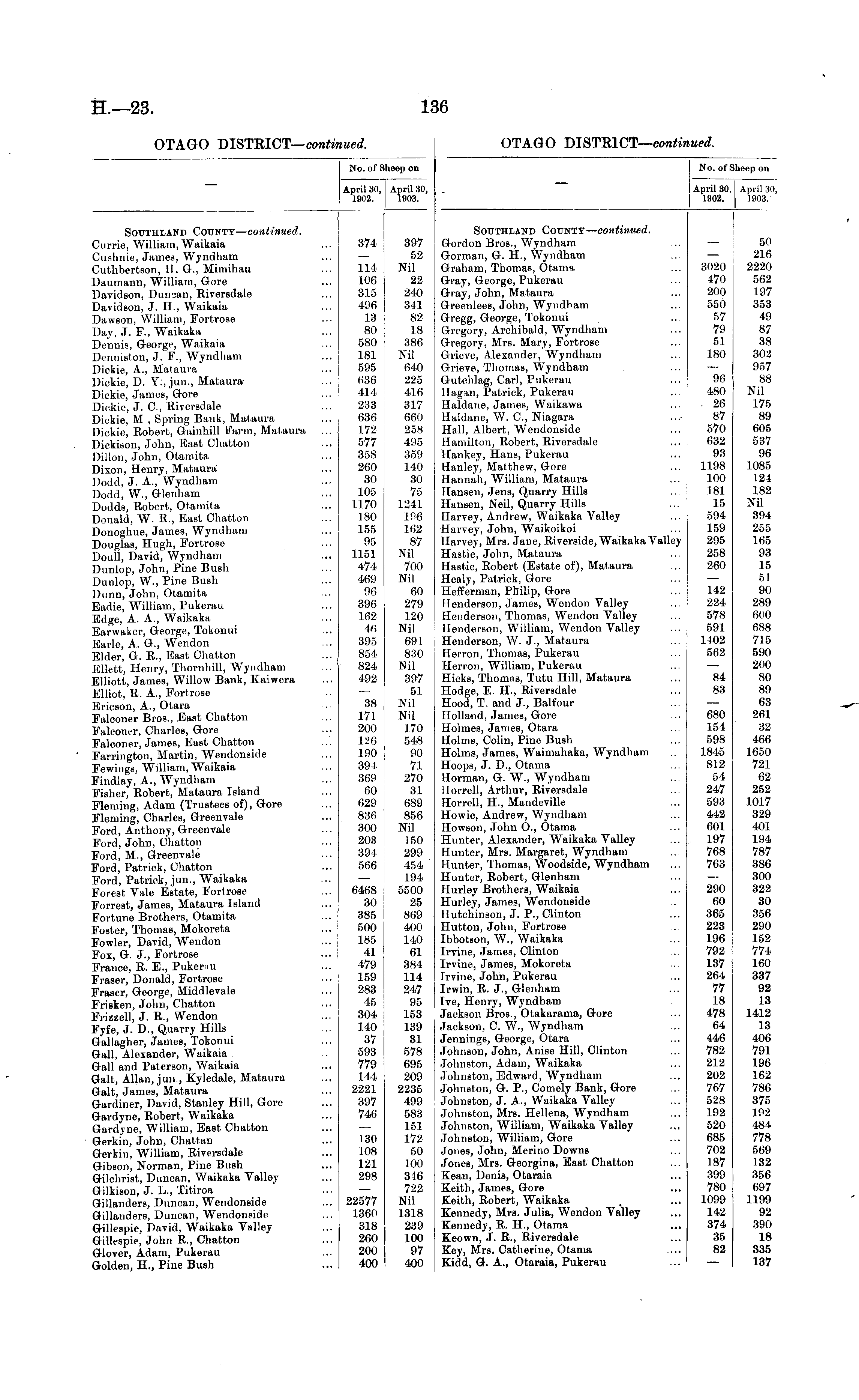 No. of Sheep on April 30, April 30, 1902. 1903. Southland County— continued, Gordon Bros., Wyndham Gorman, G. H., Wyndham Graham, Thomas, Otama Gray, George, Pukerau Gray, John, Mataura Greenlees, John, Wyndham Gregg, George, Tokonui Gregory, Archibald, Wyndham Gregory, Mrs. Mary, Fortrose Grieve, Alexander, Wyndham Grieve, Thomas, Wyndham Gutchlag, Carl, Pukerau Hogan, Patrick, Pukerau Haldane, James, Waikawa Haldane, W. C, Niagara Hall, Albert, Wendonside Hamilton, Robert, Riversdale Hankey, Hans, Pukerau Hanley, Matthew, Gore Hannah, William, Mataura Hansen, Jena, Quarry Hills Hansen, Neil, Quarry Hills Harvey, Andrew, Waikaka Valley Harvey, John, Waikoikoi Harvey, Mrs. Jane, Riverside, Waikaka Valley Haatie, John, Mataura Hastie, Robert (Estate of), Mataura Healy, Patrick, Gore Hefferman, Philip, Gore Henderson, James, Wendon Valley Henderson, Thomas, Wendon Valley Henderson, William, Wendon Valley Henderson, W. J., Mataura Uerron, Thomas, Pukerau Herron, William, Pukerau Hicks, Thomas, Tutu Hill, Mataura Hodge, E. H., Riversdale Hood, T. and J., Balfour Holland, James, Gore Holmes, James, Otara Holms, Colin, Pine Bush Holms, James, Waimahaka, Wyndham Hoops, J. D., Otama Hornian, G. W., Wyndhani Horrell, Arthur, Riversdale Horrell, H., Mandeville Howie, Andrew, Wyndham Howson, John O., Otama Hunter, Alexander, Waikaka Valley Hunter, Mrs. Margaret, Wyndham Hunter, Thomas, Woodside, Wyndham Hunter, Robert, Glenham Hurley Brothers, Waikaia Hurley, James, Wendonside Hutchinson, J. P., Clinton Hutton, John, Fortrose Ibbotson, W., Waikaka Irvine, James, Clinton Irvine, James, Mokoreta Irvine, John, Pukerau Irwin, R. J., Glenham Ive, Henry, Wyndham Jackson Bros., Otakarama, Gore Jackson, C. W., Wyndham Jenninga, George, Otara Johnaon, John, Anise Hill, Clinton Johnaton, Adam, Waikaka Johnston, Edward, Wyndham Johnston, G. P., Comely Bank, Gore Johnston, J. A., Waikaka Valley Johnston, Mrs. Hellena, Wyndham JohiiBton, William, Waikaka Valley Johnston, William, Gore Jones, John, Merino Downs Jones, Mrs. Georgina, East Chatton Kean, Denis, Otaraia Keith, James, Gore Keith, Robert, Waikaka Kennedy, Mrs. Julia, Wendon Valley Kennedy, R. H., Otama Keown, J. R., Riversdale Key, Mrs. Catherine, Otama Kidd, G. A., Otaraia, Pukerau 3020 470 200 550 57 79 51 180 96 480 26 87 570 632 93 1198 100 181 15 594 159 295 258 260 142 224 578 591 1102 562 84 83 680 154 598 1845 812 54 247 593 442 601 197 768 763 50 216 2220 562 197 353 49 87 38 302 957 88 Nil 175 89 605 537 96 1085 124 182 Nil 394 255 165 93 15 51 90 289 600 688 715 590 200 80 89 63 261 32 466 1650 721 62 252 1017 329 401 194 787 386 300 322 30 356 290 152 774 160 337 92 13 1412 13 406 791 196 162 786 375 192 484 778 569 132 356 697 1199 92 390 18 335 137 290 60 365 223 196 792 137 264 77 18 478 64 446 782 212 202 767 528 192 520 685 702 187 399 780 1099 142 374 35 82