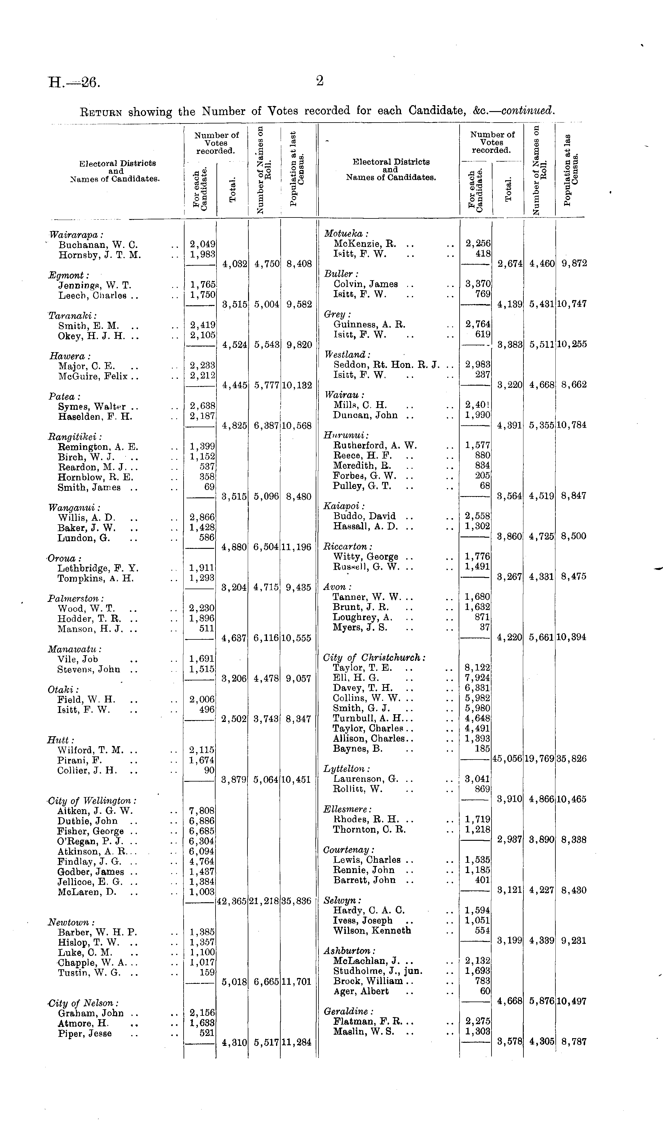 Electoral Districts and Names of Candidates. Number of Votes recorded. «2 J h? O a o CO CD .a i «-: o h a 3 CO g| 3 a o a Electoral Districts and Names of Candidates. Num Vo recoi .as <o2 "2 o a w o iber of )tes rded. O H a o CO CD 3 Xd <n o OB |H CD 3 3 «3 a 3 O co .2 a "5 °> .SO 3 ft O CM Wairarapa: Buchanan, W. C. Hornsby, J. T. M. 2,049 1,983 Motueka: McKenzie, R. .. Pitt, P. W. 2,256 418 Egmont: Jennings, W. T. Leech, Charles .. 4,032 4,750 8,408 Buller: Colvin, James Isitt, F. W. 2,674 4,460 9,87! 1,765 1,750 9,582 3,370 769 3,515 5,0041 Grey: Guinness, A. R. Isitt, F. W. 4,139 5,431 10,74' Taranaki: Smith, E. M. .. Okey, H. J. H. 2,419 2,105 9,820 2,764 619 4,524 5,543 Westland: Seddon, Rt. Hon. R. J. Isitt, P. W. 3,383 5,511 10,25! Hawera: Major, C. E. McGuire, Felix .. 2,233 2,212 2,983 237 4,445 5,777| |10,132 Wairau : Mills, C. H. Duncan, John 3,220! 4,608l 8,662 Patea: Symes, Walter .. Haselden, F. H. 2,638 2,187 10,568 2,40! 1,990 4,825 6,387 Hurunui: Rutherford, A. W. Reece, H. F. .. Meredith, R. .. Forbes, G. W. .. Pulley, G. T. 4,391 5,355 ;10,784 Rangitikei : Remington, A. E. Birch, W.J. .. Reardon, M. J. .. Hornblow, R. E. Smith, James .. 1,399 1,152 537 358 69 1,577 880 834 205 68 3,515 5,096 8,480 Kaiapoi: Buddo, David Hassall, A. D. .. 3,564 4,519! 8,847 Wanganui: Willis, A. D. .. Baker, J. W. Lundon, G. 2,866 1,428 586 2,558 1,302 3,8601 4,725 8,500 Oroua : Lethbridge, F. Y. Tompkins, A. H. 1,911 1,293 4,880 6,504 11,196 Riccarton: Witty, George Russell, G. W. .. 1,776 1,491 3,267 4,331 8,475 Palmerston: Wood, W. T. .. Hodder, T. R. .. Manson, H. J. .. 2,230 1,896 511 3,204 4,715 9,435 Avon: Tanner, W. W. .. Brunt, J. R. Loughrey, A. Myers, J. S. 1,680 1,632 871 37 Manawatu: Vile, Job Stevens, John .. 4,637 6,116 10,555 City of Christchurch: Taylor, T. E. Ell, H. G. Davey, T. H. Collins, W. W. .. Smith, G. J. Turnbull, A. H... Taylor, Charles Allison, Charles.. Baynes, B. 4,221 5,661 10,394 1,691 1,515 9,057 8,122 7,924 6,331 5,982 5,980 4,648 4,491 1,393 185 3,206 4,478 Otaki : Field, W. H. .. Isitt, F. W. 2,006 496 8,347 2,502| 3,743 Hutt: Wilford, T. M. .. Pirani, F. Collier, J. H. .. 2,115 1,674 90 45,056 19,769 J35,826 3,879 5,064, 10,451 Lyttelton: Laurenson, G. .. Rollitt, W. 3,041 869 City of Wellington: Aitken, J. G. W. Duthie, John Fisher, George .. O'Regan, P. J. Atkinson, A. R... Pindlay, J. G. Godber, James .. Jellicoe, E.G. McLaren, D. 7,808 6,886 6,685 6,304 6,094 4,764 1,437 1,384 1,003 Ellesmere: Rhodes, R. H. .. Thornton, C. R. 8,910 4,866! 110,465 1,719 1,218 Gourtenay: Lewis, Charles Rennie, John Barrett, John 2,937 3,8! 8,338 1,535 1,185 401 3,121 4,227 8,430 Newtown: Barber, W. H. P. Hislop, T. W. Luke, C. M. Chappie, W. A. .. Tustin, W. G. 42,365! 21,218 35,836 Selwyn: Hardy, C. A. C. Ivess, Joseph Wilson, Kenneth 1,594 1,051 554 1,385 1,357 1,100 1,017 159 Ashburton: McLachlan, J. .. Studholme, J., jun. Brock, William Ager, Albert 3,199j 4,339 9,231 2,132 1,693 783 60 5,018| 6,665| 11,701 City of Nelson: Graham, John .. Atmore, H. Piper, Jesse 2,156 1,633 521 Geraldine: Flatman, F. R. .. Maslin, W. S. .. 2,275 1,303 4,668 5,876 10,497 4,310; 5,517 11,284 3,578 4,305! 8,787