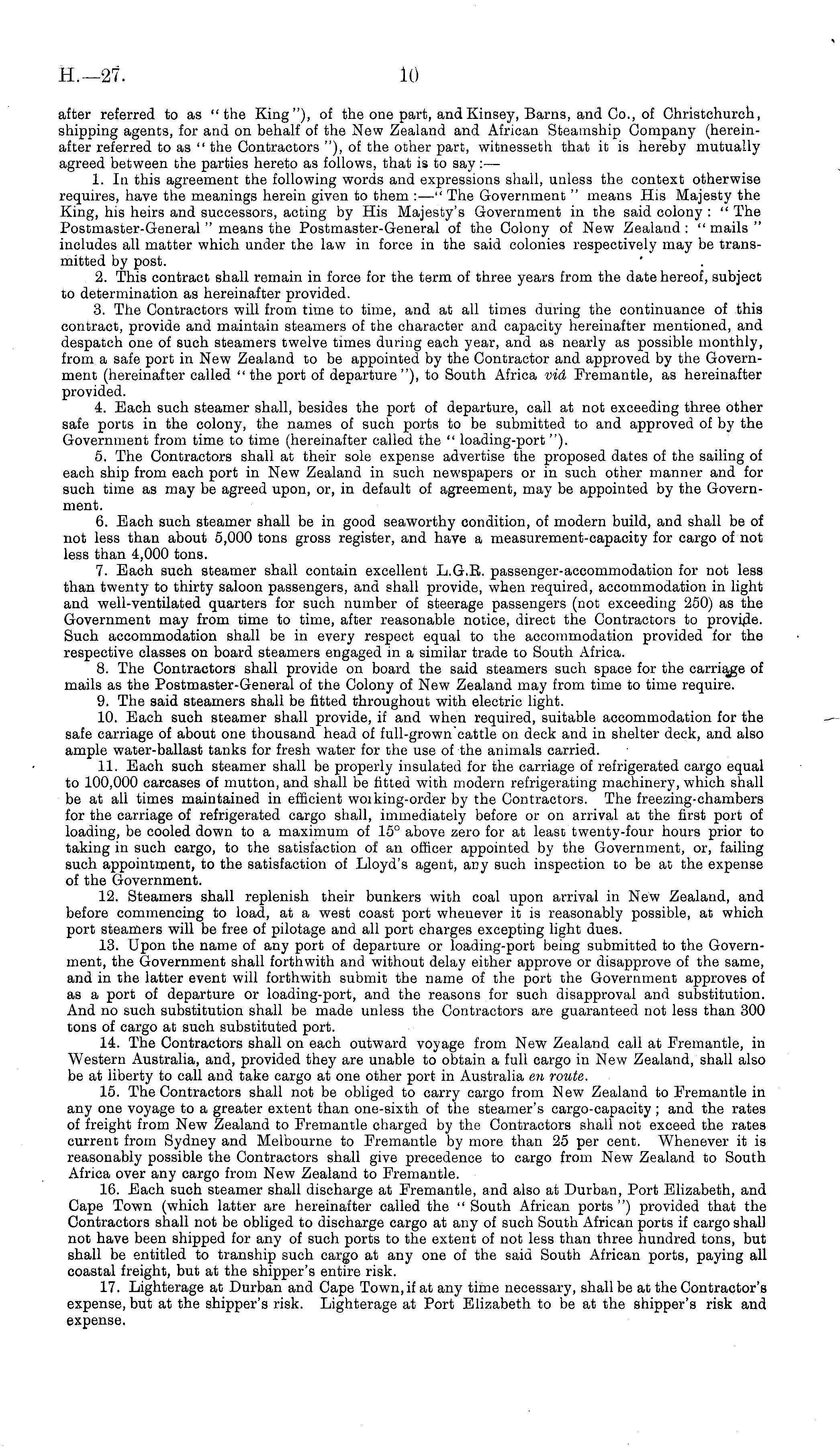 after referred to as "the King"), of the one part, and Kinsey, Barns, and Co., of Christchurch, shipping agents, for and on behalf of the New Zealand and African Steamship Company (hereinafter referred to as " the Contractors "), of the other part, witnesseth that it is hereby mutually agreed between the parties hereto as follows, that is to say:— 1. In this agreement the following words and expressions shall, unless the context otherwise requires, have the meanings herein given to them : —" The Government " means His Majesty the King, his heirs and successors, acting by His Majesty's Government in the said colony : " The Postmaster-General " means the Postmaster-General of the Colony of New Zealand : " mails " includes all matter which under the law in force in the said colonies respectively may be transmitted by post. 2. This contract shall remain in force for the term of three years from the date hereof, subject to determination as hereinafter provided. 3. The Contractors will from time to time, and at all times during the continuance of this contract, provide and maintain steamers of the character and capacity hereinafter mentioned, and despatch one of such steamers twelve times during each year, and as nearly as possible monthly, from a safe port in New Zealand to be appointed by the Contractor and approved by the Government (hereinafter called "the port of departure"), to South Africa via Fremantle, as hereinafter provided. 4. Each such steamer shall, besides the port of departure, call at not exceeding three other safe ports in the colony, the names of such ports to be submitted to and approved of by the Government from time to time (hereinafter called the " loading-port "). 5. The Contractors shall at their sole expense advertise the proposed dates of the sailing of each ship from each port in New Zealand in such newspapers or in such other manner and for such time as may be agreed upon, or, in default of agreement, may be appointed by the Government. 6. Each such steamer shall be in good seaworthy condition, of modern build, and shall be of not less than about 5,000 tons gross register, and have a measurement-capacity for cargo of not less than 4,000 tons. 7. Each such steamer shall contain excellent L.G.E. passenger-accommodation for not less than twenty to thirty saloon passengers, and shall provide, when required, accommodation in light and well-ventilated quarters for such number of steerage passengers (not exceeding 250) as the Government may from time to time, after reasonable notice, direct the Contractors to provide. Such accommodation shall be in every respect equal to the accommodation provided for the respective classes on board steamers engaged in a similar trade to South Africa. 8. The Contractors shall provide on board the said steamers such space for the carriage of mails as the Postmaster-General of the Colony of New Zealand may from time to time require. 9. The said steamers shall be fitted throughout with electric light. 10. Each such steamer shall provide, if and when required, suitable accommodation for the safe carriage of about one thousand head of full-grown cattle on deck and in shelter deck, and also ample water-ballast tanks for fresh water for the use of the animals carried. 11. Each such steamer shall be properly insulated for the carriage of refrigerated cargo equal to 100,000 carcases of mutton, and shall be fitted with modern refrigerating machinery, which shall be at all times maintained in efficient woiking-order by the Contractors. The freezing-chambers for the carriage of refrigerated cargo shall, immediately before or on arrival at the first port of loading, be cooled down to a maximum of 15° above zero for at least twenty-four hours prior to taking in such cargo, to the satisfaction of an officer appointed by the Government, or, failing such appointment, to the satisfaction of Lloyd's agent, any such inspection to be at the expense of the Government. 12. Steamers shall replenish their bunkers with coal upon arrival in New Zealand, and before commencing to load, at a west coast port whenever it is reasonably possible, at which port steamers will be free of pilotage and all port charges excepting light dues. 13. Upon the name of any port of departure or loading-port being submitted to the Government, the Government shall forthwith and without delay either approve or disapprove of the same, and in the latter event will forthwith submit the name of the port the Government approves of as a port of departure or loading-port, and the reasons for such disapproval and substitution. And no such substitution shall be made unless the Contractors are guaranteed not less than 300 tons of cargo at such substituted port. 14. The Contractors shall on each outward voyage from New Zealand call at Fremantle, in Western Australia, and, provided they are unable to obtain a full cargo in New Zealand, shall also be at liberty to call and take cargo at one other port in Australia en route. 15. The Contractors shall not be obliged to carry cargo from New Zealand to Fremantle in any one voyage to a greater extent than one-sixth of the steamer's cargo-capacity ; and the rates of freight from New Zealand to Fremantle charged by the Contractors shall not exceed the rates current from Sydney and Melbourne to Fremantle by more than 25 per cent. Whenever it is reasonably possible the Contractors shall give precedence to cargo from New Zealand to South Africa over any cargo from New Zealand to Fremantle. 16. Each such steamer shall discharge at Fremantle, and also at Durban, Port Elizabeth, and Cape Town (which latter are hereinafter called the " South African ports ") provided that the Contractors shall not be obliged to discharge cargo at any of such South African ports if cargo shall not have been shipped for any of such ports to the extent of not less than three hundred tons, but shall be entitled to tranship such cargo at any one of the said South African ports, pay