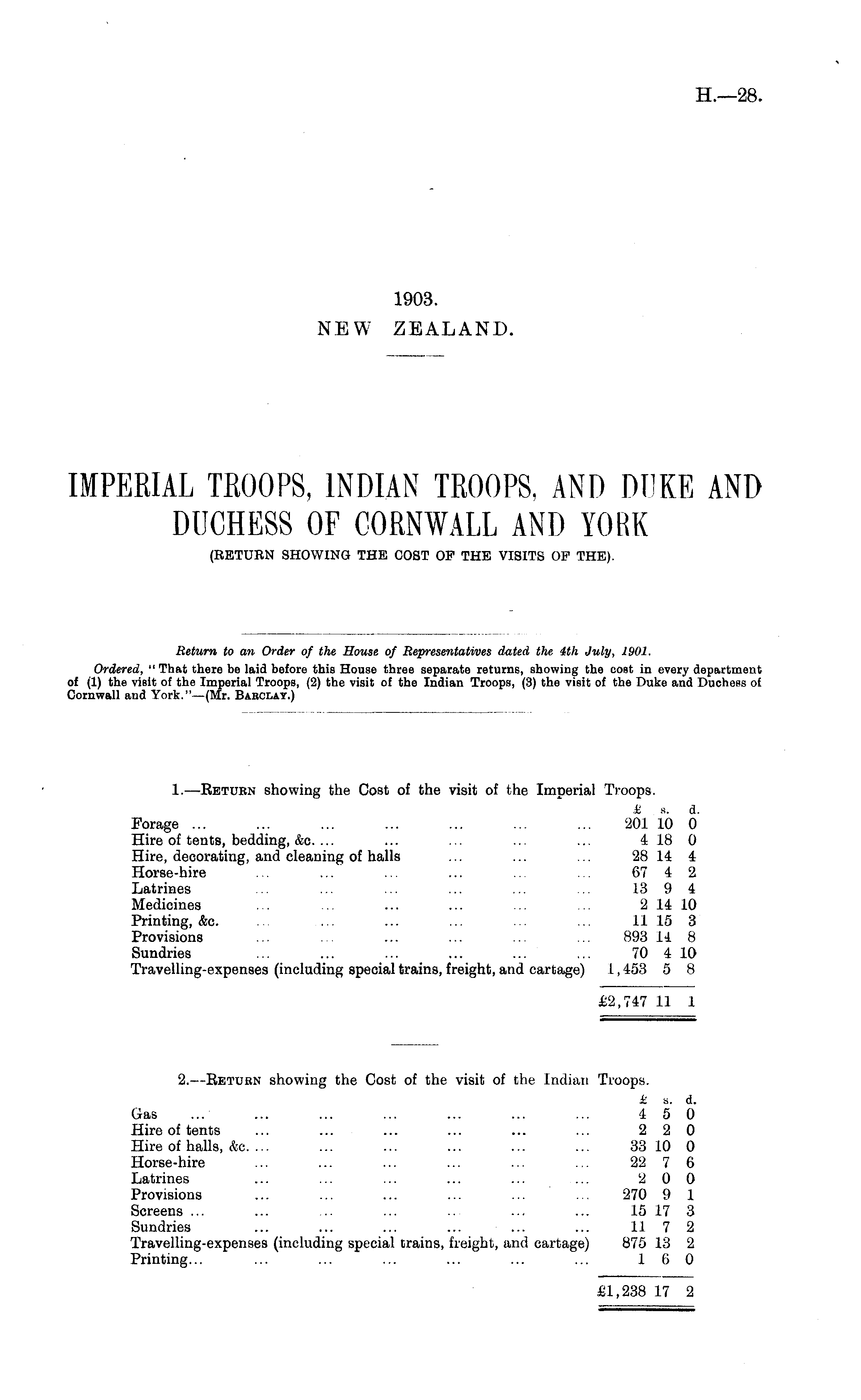 Return to an Order of the House of Representatives dated the 4th July, 1901. Ordered, " That there be laid before this House three separate returns, showing the cost in every department of (1) the visit of the Imperial Troops, (2) the visit of the Indian Troops, (3) the visit of the Duke and Duchess of Cornwall and York." —(Mr. Barclay.)