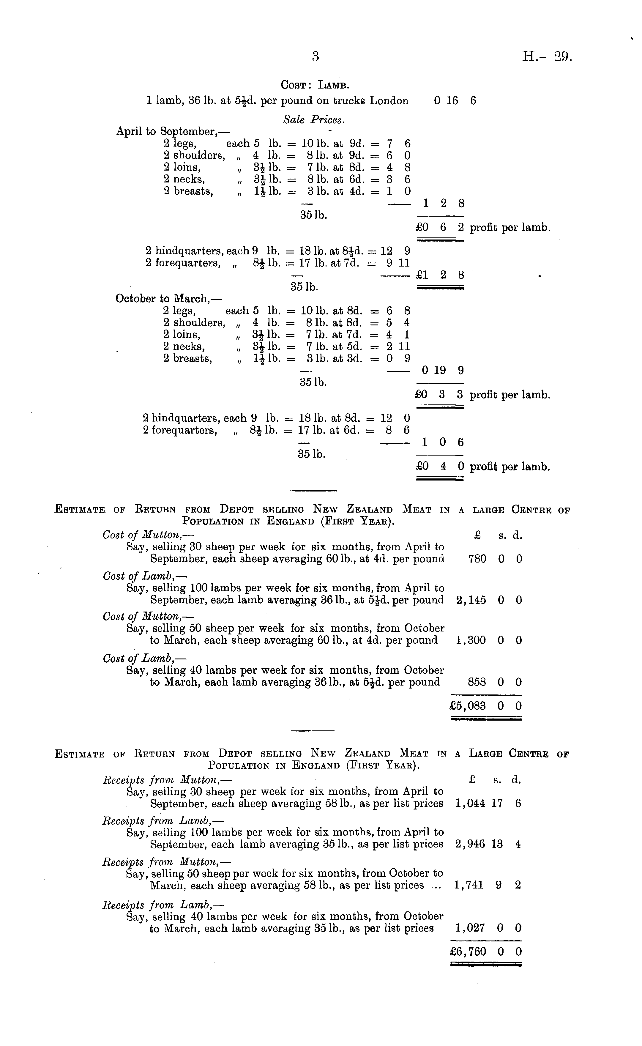 Estimate of Beturn from Depot selling New Zealand Meat in a Large Centre of Population in England (First Year). Receipts from Mutton, — £ s. d. Say, selling 30 sheep per week for six months, from April to September, each sheep averaging 581b., as per list prices 1,044 17 6 Receipts from Lamb, — Say, selling 100 lambs per week for six months, from April to September, each lamb averaging 351b., as per list prices 2,946 13 4 Receipts from Mutton, — Say, selling 50 sheep per week for six months, from October to March, each sheep averaging 581b., as per list prices ... 1,741 9 2 Receipts from Lamb, — Say, selling 40 lambs per week for six months, from October to March, each lamb averaging 351b., as per list prices 1,027 0 0 £6,760 0 0