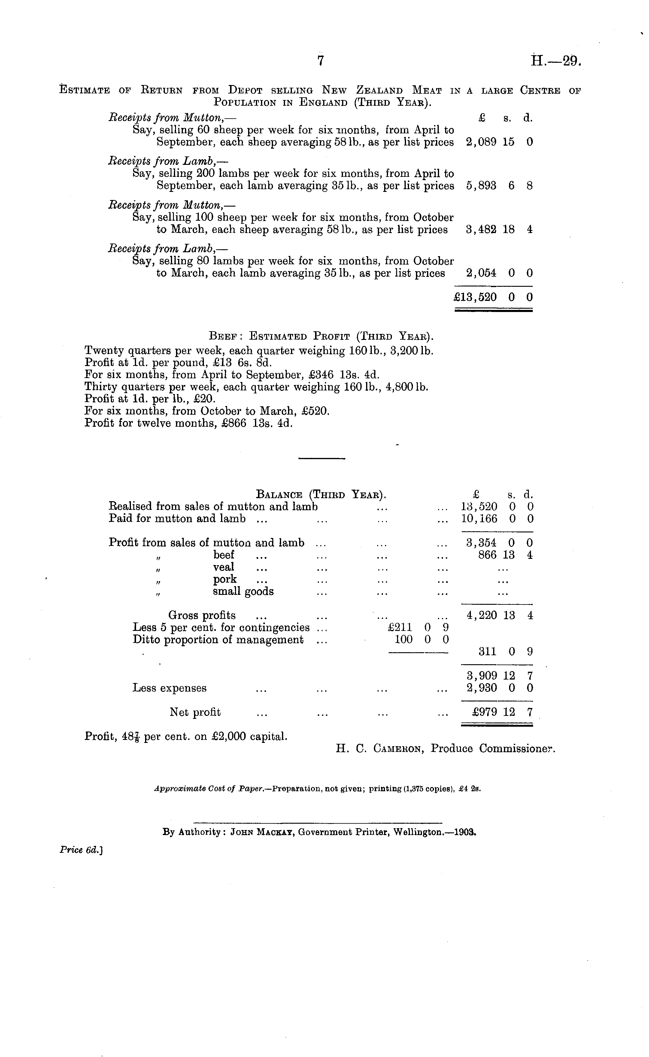 Balance (Third Year). £ s. d. Bealised from sales of mutton and lamb ... ... 13,520 0 0 Paid for mutton and lamb ... ... ... ... 10,166 0 0 Profit from sales of mutton and lamb ... ... ... 3,354 0 0 beef ... ... ... ... 866 13 4 „ veal pork „ small goods Gross profits ... ... ... ... 4,220 13 4 Less 5 per cent, for contingencies ... £211 0 9 Ditto proportion of management ... 100 0 0 311 0 9 3,909 12 7 Less expenses ... ... ... ... 2,930 0 0 Net profit ... ... ... ... £979 12 7 Profit, 48| per cent, on £2,000 capital. H. C. Cameron, Produce Commissioner.