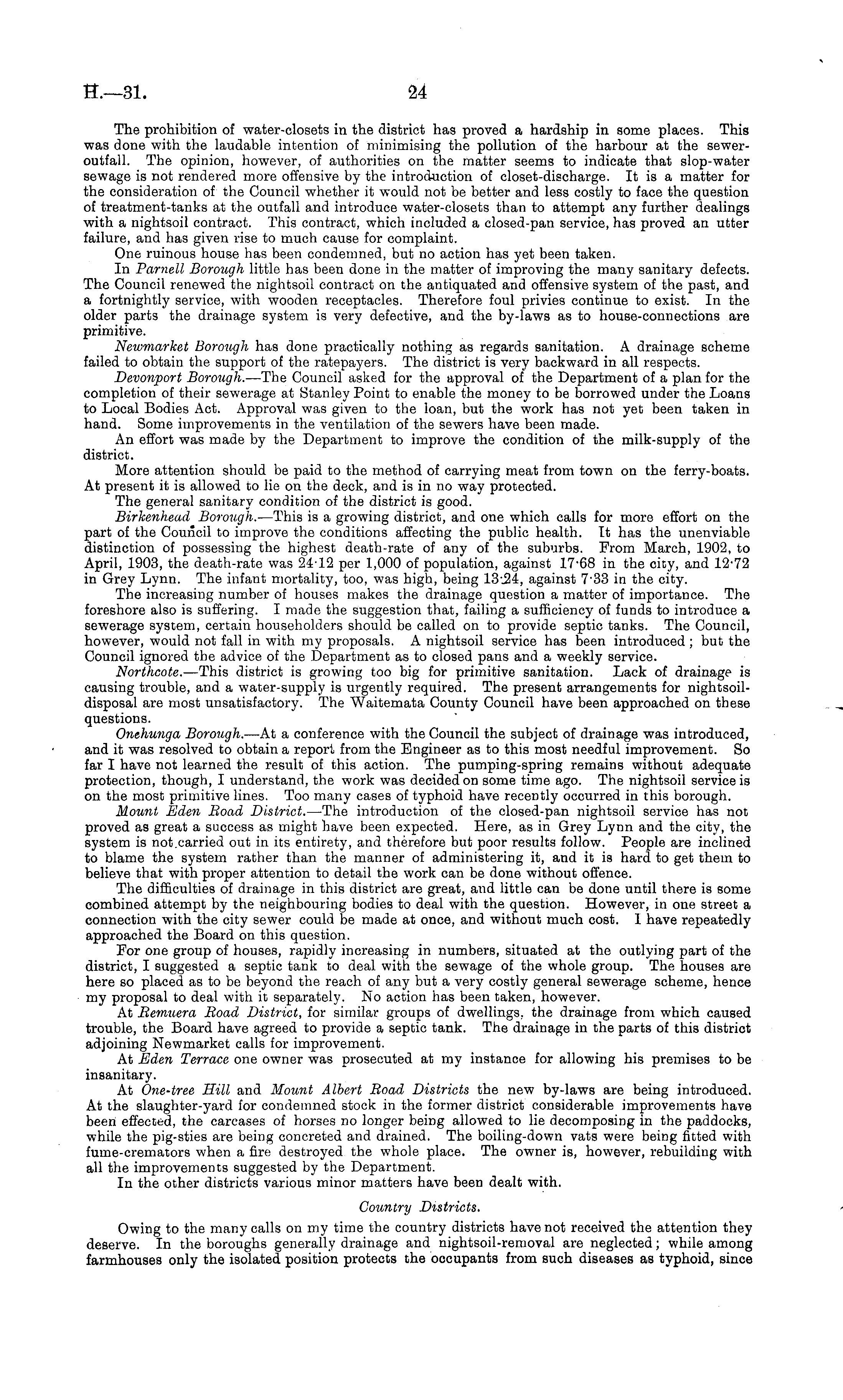 The prohibition of water-closets in the district has proved a hardship in some places. This was done with the laudable intention of minimising the pollution of the harbour at the seweroutfall. The opinion, however, of authorities on the matter seems to indicate that slop-water sewage is not rendered more offensive by the introduction of closet-discharge. It is a matter for the consideration of the Council whether it would not be better and less costly to face the question of treatment-tanks at the outfall and introduce water-closets than to attempt any further dealings with a nightsoil contract. This contract, which included a closed-pan service, has proved an utter failure, and has given rise to much cause for complaint. One ruinous house has been condemned, but no action has yet been taken. In Parnell Borough little has been done in the matter of improving the many sanitary defects. The Council renewed the nightsoil contract on the antiquated and offensive system of the past, and a fortnightly service, with wooden receptacles. Therefore foul privies continue to exist. In the older parts the drainage system is very defective, and the by-laws as to house-connections are primitive. Newmarket Borough has done practically nothing as regards sanitation. A drainage scheme failed to obtain the support of the ratepayers. The district is very backward in all respects. Devonport Borough. —The Council asked for the approval of the Department of a plan for the completion of their sewerage at Stanley Point to enable the money to be borrowed under the Loans to Local Bodies Act. Approval was given to the loan, but the work has not yet been taken in hand. Some improvements in the ventilation of the sewers have been made. An effort was made by the Department to improve the condition of the milk-supply of the district. More attention should be paid to the method of carrying meat from town on the ferry-boats. At present it is allowed to lie on the deck, and is in no way protected. The general sanitary condition of the district is good. Birkenhead Borough. —This is a growing district, and one which calls for more effort on the part of the Council to improve the conditions affecting the public health. It has the unenviable distinction of possessing the highest death-rate of any of the suburbs. From March, 1902, to April, 1903, the death-rate was 24-12 per 1,000 of population, against 17-68 in the city, and 12-72 in Grey Lynn. The infant mortality, too, was high, being 13:24, against 733 in the city. The increasing number of houses makes the drainage question a matter of importance. The foreshore also is suffering. I made the suggestion that, failing a sufficiency of funds to introduce a sewerage system, certain householders should be called on to provide septic tanks. The Council, however, would not fall in with my proposals. A nightsoil service has been introduced ; but the Council ignored tbe advice of the Department as to closed pans and a weekly service. Northcote. —This district is growing too big for primitive sanitation. Lack of drainage is causing trouble, and a water-supply is urgently required. The present arrangements for nightsoildisposal are most unsatisfactory. The Waitemata County Council have been approached on these questions. Onehunga Borough. —At a conference with the Council the subject of drainage was introduced, and it was resolved to obtain a report from the Engineer as to this most needful improvement. So far I have not learned the result of this action. The pumping-spring remains without adequate protection, though, I understand, the work was decided on some time ago. The nightsoil service is on the most primitive lines. Too many cases of typhoid have recently occurred in this borough. Mount Eden Road District. —The introduction of the closed-pan nightsoil service has not proved as great a success as might have been expected. Here, as in Grey Lynn and the city, the system is not.carried out in its entirety, and therefore but poor results follow. People are inclined to blame the system rather than the manner of administering it, and it is hard to get them to believe that with proper attention to detail the work can be done without offence. The difficulties of drainage in this district are great, and little can be done until there is some combined attempt by the neighbouring bodies to deal with the question. However, in one street a connection with the city sewer could be made at once, and without much cost. 1 have repeatedly approached the Board on this question. For one group of houses, rapidly increasing in numbers, situated at the outlying part of the district, I suggested a septic tank to deal with the sewage of the whole group. The houses are here so placed as to be beyond the reach of any but a very costly general sewerage scheme, hence my proposal to deal with it separately. No action has been taken, however. At Remuera Road District, for similar groups of dwellings, the drainage from which caused trouble, the Board have agreed to provide a septic tank. The drainage in the parts of this district adjoining Newmarket calls for improvement. At Eden Terrace one owner was prosecuted at my instance for allowing his premises to be insanitary. At One-tree Hill and Mount Albert Road Districts the new by-laws are being introduced. At the slaughter-yard for condemned stock in the former district considerable improvements have been effected, the carcases of horses no longer being allowed to lie decomposing in the paddocks, while the pig-sties are being concreted and drained. The boiling-down vats were being fitted with fume-cremators when a fire destroyed the whole place. The owner is, however, rebuilding with all the improvements suggested by the Department. In the other districts various minor matters have been dealt with. Country Districts. Owing to the many calls on my time the country districts have not received the attention they deserve. In the boroughs generally drainage