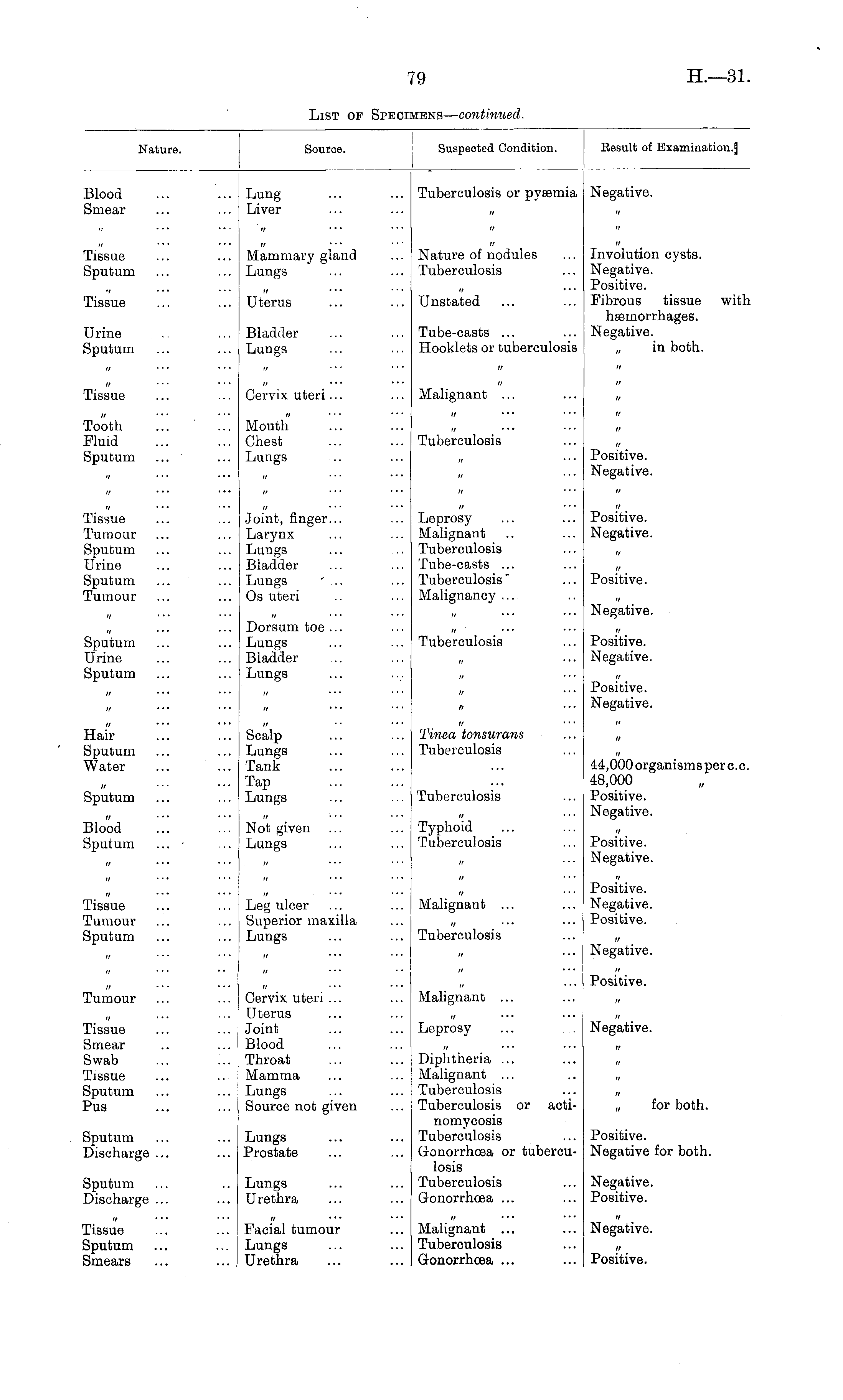 Nature. Source. Suspected Condition. Result of Examination.^ Blood Smear Lung Liver Tuberculosis or pyaemia Negative. a a a a Tissue Sputum Tissue a ••• Mammary gland Lungs « • • ■ Uterus Nature of nodules Tuberculosis tt Unstated Involution cysts. Negative. Positive. Fibrous tissue with haemorrhages. Negative. „ in both. Urine Sputum Bladder Lungs Tube-casts ... Booklets or tuberculosis „ ... n n a Tissue Cervix uteri... Malignant ... it Tooth Fluid Sputum Mouth Chest Lungs a . • • Tuberculosis a Positive. Negative. „ ... a » it Tissue Tumour Sputum Urine Sputum Tumour Joint, finger... Larynx Lungs Bladder Lungs ' ... Os uteri Leprosy Malignant Tuberculosis Tube-casts ... Tuberculosis Malignancy ... n Positive. Negative. Positive. Negative. it a ... Sputum Urine Sputum Dorsum toe ... Lungs Bladder Lungs a • • • • ■ • Tuberculosis Positive. Negative. „ ... Positive. Negative. a Hair Sputum Water Scalp Lungs Tank Tap Lungs it Tinea tonsurans Tuberculosis u Sputum Tuberculosis 44,000 organisms per c.c. 48,000 Positive. Negative. Blood Sputum ... • Not given Lungs Typhoid Tuberculosis Positive. Negative. Tissue Leg ulcer Superior maxilla Lungs Malignant ... Positive. Negative. Positive. Tumour Sputum it • ■ • Tuberculosis Negative. „ ... a „ ... a „ ... Positive. Tumour Tissue Smear Swab Tissue Sputum Pus Cervix uteri ... Uterus Joint Blood Throat Mamma Lungs Source not given Malignant ... tr ••• Leprosy Diphtheria ... Malignant ... Tuberculosis Tuberculosis or actinomycosis Tuberculosis Gonorrhoea or tuberculosis Tuberculosis Gonorrhoea ... a Negative. a a „ for both. Sputum Discharge ... Lungs Prostate Positive. Negative for both. Sputum Discharge ... Lungs Urethra Negative. Positive. Tissue Sputum Smears Facial tumour Lungs Urethra „ ... ... Malignant ... Tuberculosis Gonorrhoea ... Negative. tr Positive.