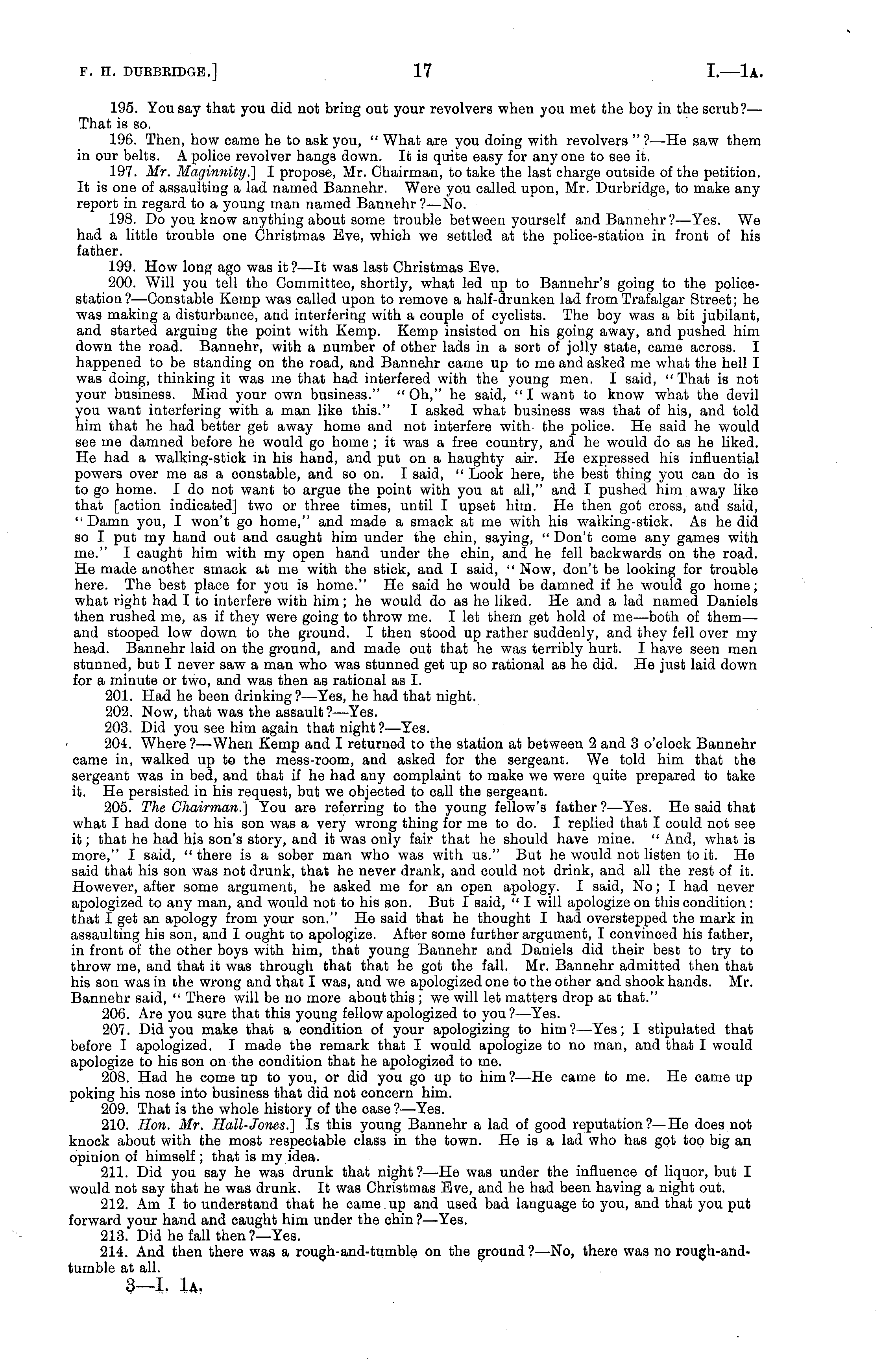195. You say that you did not bring out your revolvers when you met the boy in the scrub?— That is so. 196. Then, how came he to ask you, " What are you doing with revolvers " ?—He saw them in our belts. A police revolver hangs down. It is quite easy for anyone to see it. 197. Mr. Maginnity.] I propose, Mr. Chairman, to take the last charge outside of the petition. It is one of assaulting a lad named Bannehr. Were you called upon, Mr. Durbridge, to make any report in regard to a young man named Bannehr?—No. 198. Do you know anything about some trouble between yourself and Bannehr?—Yes. We had a little trouble one Christmas Eve, which we settled at the police-station in front of his father. 199. How long ago was it?—lt was last Christmas Eve. 200. Will you tell the Committee, shortly, what led up to Bannehr's going to the policestation? —Constable Kemp was called upon to remove a half-drunken lad from Trafalgar Street; he was making a disturbance, and interfering with a couple of cyclists. The boy was a bit jubilant, and started arguing the point with Kemp. Kemp insisted on his going away, and pushed him down the road. Bannehr, with a number of other lads in a sort of jolly state, came across. I happened to be standing on the road, and Bannehr came up to me and asked me what the hell I was doing, thinking it was me that had interfered with the young men. I said, "That is not your business. Mind your own business." " Oh," he said, " I want to know what the devil you want interfering with a man like this." I asked what business was that of his, and told him that he had better get away home and not interfere with- bhe police. He said he would see me damned before he would go home ; it was a free country, and he would do as he liked. He had a walking-stick in his hand, and put on a haughty air. He expressed his influential powers over me as a constable, and so on. I said, " Look here, the best thing you can do is to go home. I do not want to argue the point with you at all," and I pushed him away like that [action indicated] two or three times, until I upset him. He then got cross, and said, " Damn you, I won't go home," and made a smack at me with his walking-stick. As he did so I put my hand out and caught him under the chin, saying, " Don't come any games with me." I caught him with my open hand under the chin, and he fell backwards on the road. He made another smack at me with the stick, and I said, " Now, don't be looking for trouble here. The best place for you is home." He said he would be damned if he would go home; what right had Ito interfere with him; he would do as he liked. He and a lad named Daniels then rushed me, as if they were going to throw me. I let them get hold of me —both of them— and stooped low down to the ground. I then stood up rather suddenly, and they fell over my head. Bannehr laid on the ground, and made out that he was terribly hurt. I have seen men stunned, but I never saw a man who was stunned get up so rational as he did. He just laid down for a minute or two, and was then as rational as I. 201. Had he been drinking?— Yes, he had that night. 202. Now, that was the assault ? —Yes. 203. Did you see him again that night?— Yes. 204. Where ?—When Kemp and I returned to the station at between 2 and 3 o'clock Bannehr came in, walked up to the mess-room, and asked for the sergeant. We told him that the sergeant was in bed, and that if he had any complaint to make we were quite prepared to take it. He persisted in his request, but we objected to call the sergeant. 205. The Chairman.] You are referring to the young fellow's father ?—Yes. He said that what I had done to his son was a very wrong thing for me to do. I replied that I could not see it; that he had his son's story, and it was only fair that he should have mine. " And, what is more," I said, "there is a sober man who was with us." But he would not listen to it. He said that his son was not drunk, that he never drank, and could not drink, and all the rest of it. However, after some argument, he asked me for an open apology. I said, No; I had never apologized to any man, and would not to his son. But I said, " I will apologize on this condition : that I get an apology from your son." He said that he thought I had overstepped the mark in assaulting his son, and I ought to apologize. After some further argument, I convinced his father, in front of the other boys with him, that young Bannehr and Daniels did their best to try to throw me, and that it was through that that he got the fall. Mr. Bannehr admitted then that his son was in the wrong and that I was, and we apologized one to the other and shook hands. Mr. Bannehr said, " There will be no more about this ; we will let matters drop at that." 206. Are you sure that this young fellow apologized to you ? —Yes. 207. Did you make that a condition of your apologizing to him ?—Yes; I stipulated that before I apologized. I made the remark that I would apologize to no man, and that I would apologize to his son on the condition that he apologized to me. 208. Had he come up to you, or did you go up to him ?—-He came to me. He came up poking his nose into business that did not concern him. 209. That is the whole history of the case ?—Yes. 210. Hon. Mr. Hall-Jones.] Is this young Bannehr a lad of good reputation?—He does not knock about with the most respectable class in the town. He is a lad who has got too big an opinion of himself ; that is my idea. 211. Did you say he was drunk that night?—He was under the influence of liquor, but I would not say that he was drunk. It was Christmas Eve, and he had been having a night out. 212. Am I to understand that he came up and used bad language to you, and that you put forward your hand and caught him under the chin ?—Yes. 213. Did he fall then?— Yes. 214. And then there was a rough-and-tumble on the ground ?—No, there was no rough-and-tumble at all. 3—l. n,