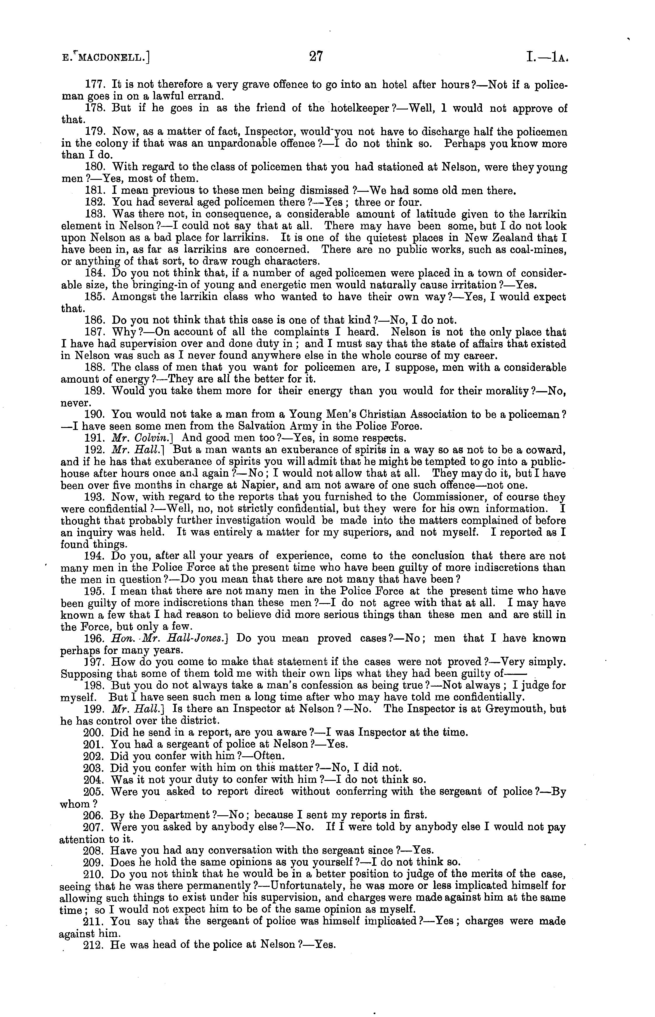 177. It is not therefore a very grave offence to go into an hotel after hours?— Not if a policeman goes in on a lawful errand. 178. But if he goes in as the friend of the hotelkeeper?—Well, 1 would not approve of that. 179. Now, as a matter of fact, Inspector, would'you not have to discharge half the policemen in the colony if that was an unpardonable offence ?—I do not think so. Perhaps you know more than I do. 180. With regard to the class of policemen that you had stationed at Nelson, were they young men ?—Yes, most of them. 181. I mean previous to these men being dismissed ? —We had some old men there. 182. You had several aged policemen there ?—Yes ; three or four. 183. Was there not, in consequence, a considerable amount of latitude given to the larrikin element in Nelson ? —I could not say that at all. There may have been some, but Ido not look upon Nelson as a bad place for larrikins. It is one of the quietest places in New Zealand that I have been in, as far as larrikins are concerned. There are no public works, such as coal-mines, or anything of that sort, to draw rough characters. 184. Do you not think that, if a number of aged policemen were placed in a town of considerable size, the bringing-in of young and energetic men would naturally cause irritation ?—Yes. 185. Amongst the larrikin class who wanted to have their own way?— Yes, I would expect that. 186. Do you not think that this case is one of that kind ?—No, I do not. 187. Why?—On account of all the complaints I heard. Nelson is not the only place that I have had supervision over and done duty in ; and I must say that the state of affairs that existed in Nelson was such as I never found anywhere else in the whole course of my career. 188. The class of men that you want for policemen are, I suppose, men with a considerable amount of energy ?—They are all the better for it. 189. Would you take them more for their energy than you would for their morality ?—No, never. 190. You would not take a man from a Young Men's Christian Association to be a policeman? —I have seen some men from the Salvation Army in the Police Force. 191. Mr. Colvin.] And good men too?—-Yes, in some respects. 192. Mr. Hall.] But a man wants an exuberance of spirits in a way so as not to be a coward, and if he has that exuberance of spirits you will admit that he might be tempted to go into a publichouse after hours once and again ?—No; I would not allow that at all. They may do it, but I have been over five months in charge at Napier, and am not aware of one such offence—not one. 193. Now, with regard to the reports that you furnished to the Commissioner, of course they were confidential ?—Well, no, not strictly confidential, but they were for his own information. I thought that probably further investigation would be made into the matters complained of before an inquiry was held. It was entirely a matter for my superiors, and not myself. I reported as I found things. 194. Do you, after all your years of experience, come to the conclusion that there are not many men in the Police Force at the present time who have been guilty of more indiscretions than the men in question ?—Do you mean that there are not many that have been ? 195. I mean that there are not many men in the Police Force at the present time who have been guilty of more indiscretions than these men ? —I do not agree with that at all. I may have known a few that I had reason to believe did more serious things than these men and are still in the Force, but only a few. 196. Hon. Mr. Hall-Jones.] Do you mean proved cases?—No; men that I have known perhaps for many years. 197. How do you come to make that statement if the cases were not proved?— Very simply. Supposing that some of them told me with their own lips what they had been guilty of 198. But you do not always take a man's confession as being true?— Not always ; I judge for myself. But I have seen such men a long time after who may have told me confidentially. 199. Mr. Hall.] Is there an Inspector at Nelson ? —No. The Inspector is at Greymouth, but he has control over the district. 200. Did he send in a report, are you aware ?—I was Inspector at the time. 201. You had a sergeant of police at Nelson ? —Yes. 202. Did you confer with him?— Often. 203. Did you confer with him on this matter?—No, I did not. 204. Was it not your duty to confer with him ?—I do not think so. 205. Were you asked to report direct without conferring with the sergeant of police ?—By whom ? 206. By the Department ?—No; because I sent my reports in first. 207. Were you asked by anybody else?— No. If I were told by anybody else I would not pay attention to it. 208. Have you had any conversation with the sergeant since ? —Yes. 209. Does he hold the same opinions as you yourself ?—I do not think so. 210. Do you not think that he would be in a better position to judge of the merits of the case, seeing that he was there permanently ?—Unfortunately, he was more or less implicated himself for allowing such things to exist under his supervision, and charges were made against him at the same time; so I would not expect him to be of the same opinion as myself. 211. You say that the sergeant of police was himself implicated?— Yes; charges were made against him. 212. He was head of the police at Nelson ?—Yes.