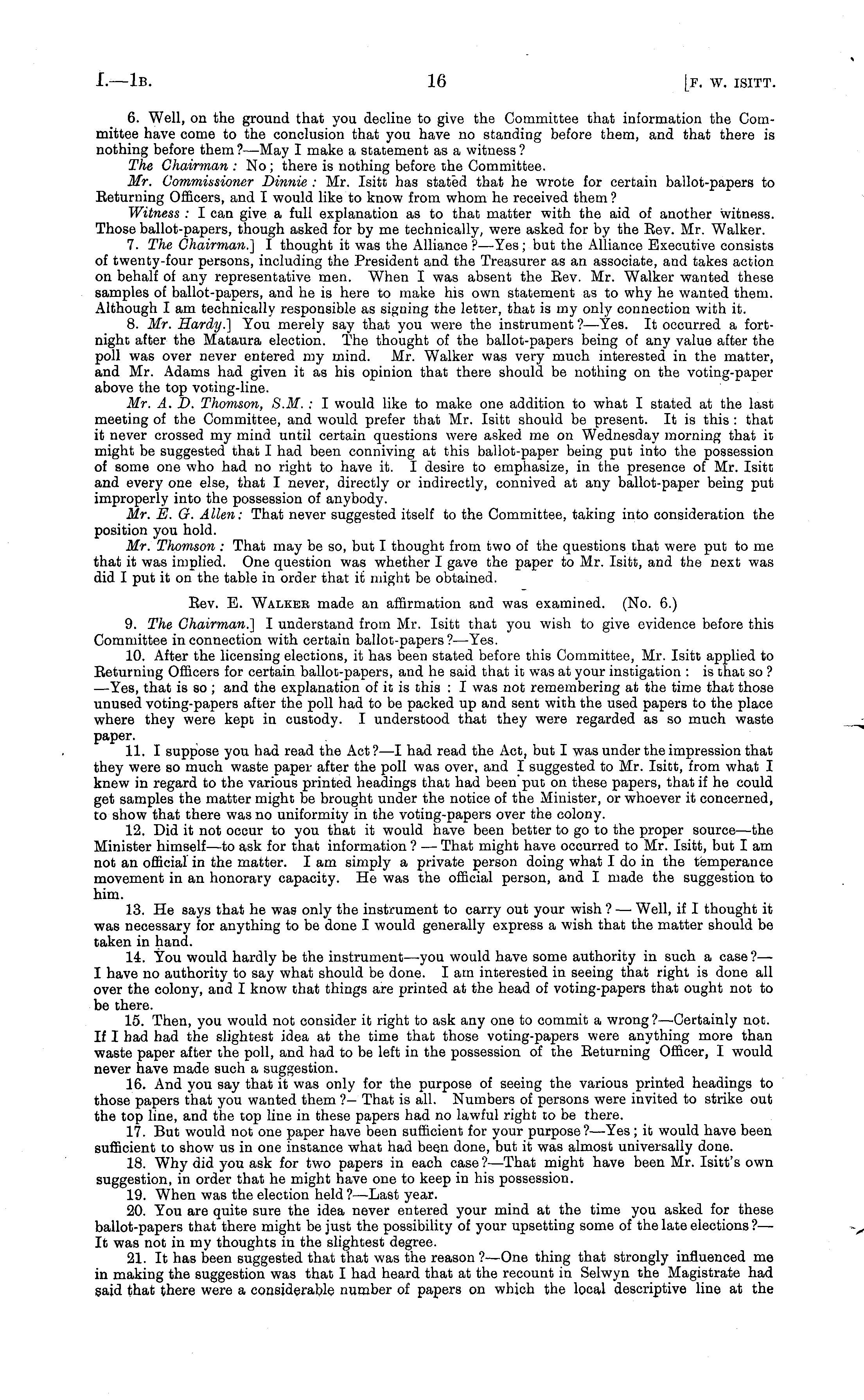 6. Well, on the ground that you decline to give the Committee that information the Committee have come to the conclusion that you have no standing before them, and that there is nothing before them ?—May I make a statement as a witness ? The Chairman : No; there is nothing before the Committee. Mr. Commissioner Dinnie : Mr. Isitt has stated that he wrote for certain ballot-papers to Returning Officers, and I would like to know from whom he received them ? Witness : I can give a full explanation as to that matter with the aid of another witness. Those ballot-papers, though asked for by me technically, were asked for by the Rev. Mr. Walker. 7. The Chairman.] I thought it was the Alliance ? —Yes; but the Alliance Executive consists of twenty-four persons, including the President and the Treasurer as an associate, and takes action on behalf of any representative men. When I was absent the Rev. Mr. Walker wanted these samples of ballot-papers, and he is here to make his own statement as to why he wanted them. Although I am technically responsible as signing the letter, that is my only connection with it. 8. Mr. Hardy.] You merely say that you were the instrument ? —Yes. It occurred a fortnight after the Mataura election. The thought of the ballot-papers being of any value after the poll was over never entered my mind. Mr. Walker was very much interested in the matter, and Mr. Adams had given it as his opinion that there should, be nothing on the voting-paper above the top voting-line. Mr. A. D. Thomson, S.M. : I would like to make one addition to what I stated at the last meeting of the Committee, and would prefer that Mr. Isitt should be present. It is this : that it never crossed my mind until certain questions were asked me on Wednesday morning that it might be suggested that I had been conniving at this ballot-paper being put into the possession of some one who had no right to have it. I desire to emphasize, in the presence of Mr. Isitt and every one else, that I never, directly or indirectly, connived at any ballot-paper being put improperly into the possession of anybody. Mr. E. G. Allen: That never suggested itself to the Committee, taking into consideration the position you hold. Mr. Thomson : That may be so, but I thought from two of the questions that were put to me that it was implied. One question was whether I gave the paper to Mr. Isitt, and the next was did I put it on the table in order that it might be obtained. Rev. E. Walkee made an affirmation and was examined. (No. 6.) 9. The Chairman.] I understand from Mr. Isitt that you wish to give evidence before this Committee in connection with certain ballot-papers?— Yes. 10. After the licensing elections, it has been stated before this Committee, Mr. Isitt applied to Returning Officers for certain ballot-papers, and he said that it was at your instigation : is that so ? —Yes, that is so ; and the explanation of it is this : I was not remembering at the time that those unused voting-papers after the poll had to be packed up and sent with the used papers to the place where they were kept in custody. I understood that they were regarded as so much waste paper. 11. I suppose you had read the Act?—l had read the Act, but I was under the impression that they were so much waste paper after the poll was over, and I suggested to Mr. Isitt, from what I knew in regard to the various printed headings that had been put on these papers, that if he could get samples the matter might be brought under the notice of the Minister, or whoever it concerned, to show that there was no uniformity in the voting-papers over the colony. 12. Did it not occur to you that it would have been better to go to the proper source—the Minister himself—to ask for that information ? — That might have occurred to Mr. Isitt, but I am not an official in the matter. lam simply a private person doing what Ido in the temperance movement in an honorary capacity. He was the official person, and I made the suggestion to him. 13. He says that he was only the instrument to carry out your wish ? — Well, if I thought it was necessary for anything to be done I would generally express a wish that the matter should be taken in hand. 14. You would hardly be the instrument—you would have some authority in such a case ? — I have no authority to say what should be done. lam interested in seeing that right is done all over the colony, and I know that things are printed at the head of voting-papers that ought not to be there. 15. Then, you would not consider it right to ask any one to commit a wrong ?—Certainly not. If I had had the slightest idea at the time that those voting-papers were anything more than waste paper after the poll, and had to be left in the possession of the Returning Officer, I would never have made such a suggestion. 16. And you say that it was only for the purpose of seeing the various printed headings to those papers that you wanted them ?— That is all. Numbers of persons were invited to strike out the top line, and the top line in these papers had no lawful right to be there. 17. But would not one paper have been sufficient for your purpose? —Yes; it would have been sufficient to show us in one instance what had been done, but it was almost universally done. 18. Why did you ask for two papers in each case?— That might have been Mr. Isitt's own suggestion, in order that he might have one to keep in his possession. 19. When was the election held ? —Last year. 20. You are quite sure the idea never entered your mind at the time you asked for these ballot-papers that there might be just the possibility of your upsetting some of the late elections ?— It was not in my thoughts in the slightest degree. 21. It has been suggested that that was the reason?— One thing that strongly influenced me in making the suggestion was that I had heard that at the recount in Selwyn the Magistrate had said that there were a considerable number of paper