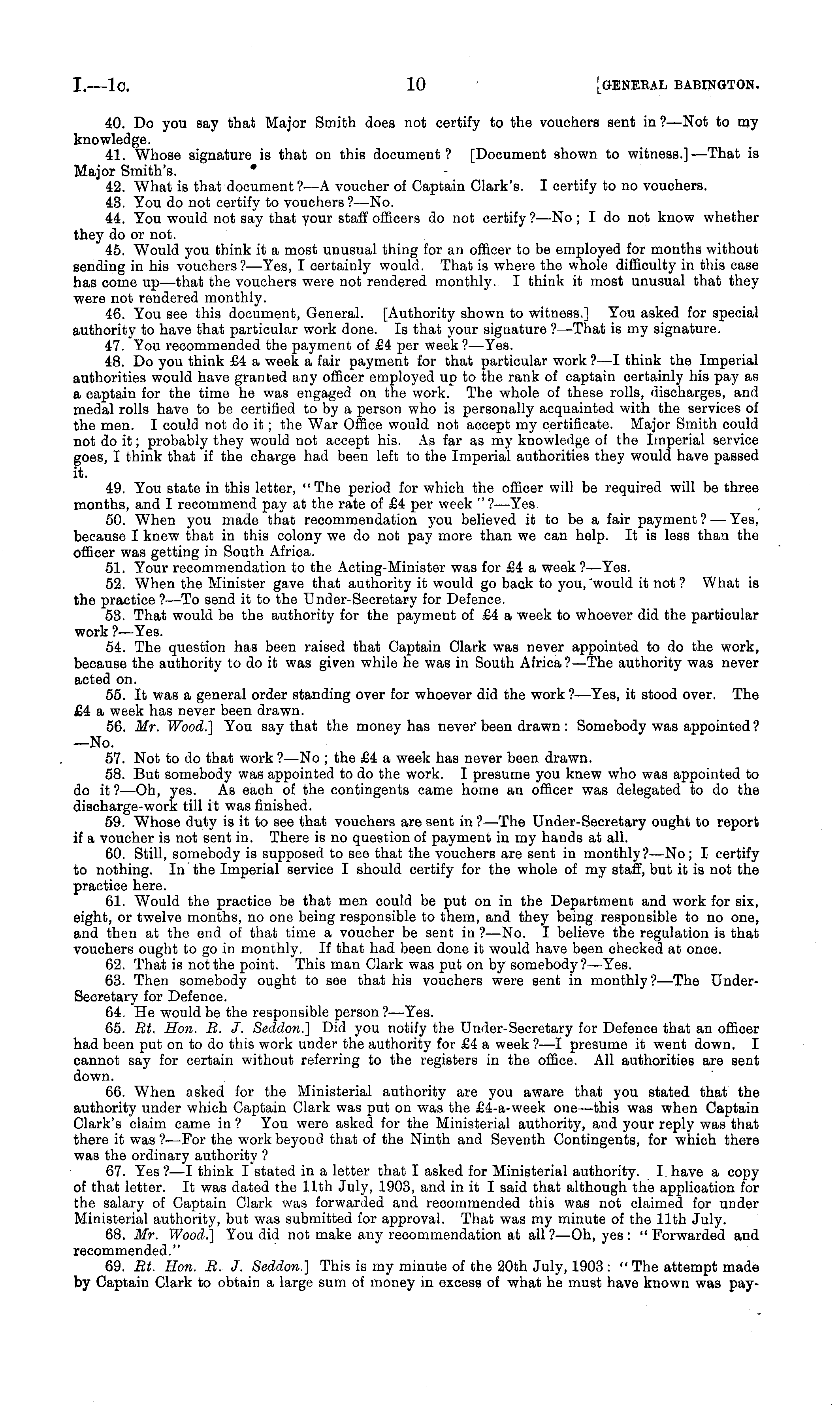 40. Do you say that Major Smith does not certify to the vouchers sent in ? —Not to my knowledge. 41. Whose signature is that on this document? [Document shown to witness.] —That is Major Smith's. 42. What is that document? —A voucher of Captain Clark's. I certify to no vouchers. 43. You do not certify to vouchers? —No. 44. You would not say that your staff officers do not certify?—No; I do not know whether they do or not. 45. Would you think it a most unusual thing for an officer to be employed for months without sending in his vouchers? —Yes, I certainly would. That is where the whole difficulty in this case has come vp —that the vouchers were not rendered monthly. I think it most unusual that they were not rendered monthly. 46. You see this document, General. [Authority shown to witness.] You asked for special authority to have that particular work done. Is that your signature ?—That is my signature. 47. You recommended the payment of £4 per week ? —Yes. 48. Do you think £4 a week a fair payment for that particular work ? —I think the Imperial authorities would have granted any officer employed up to the rank of captain certainly his pay as a captain for the time he was engaged on the work. The whole of these rolls, discharges, and medal rolls have to be certified to by a person who is personally acquainted with the services of the men. I could not do it; the War Office would not accept my certificate. Major Smith could not do it; probably they would not accept his. As far as my knowledge of the Imperial service goes, I think that if the charge had been left to the Imperial authorities they would have passed it. 49. You state in this letter, " The period for which the officer will be required will be three months, and I recommend pay at the rate of £4 per week " ?—Yes. 50. When you made that recommendation you believed it to be a fair payment? — Yes, because I knew that in this colony we do not pay more than we can help. It is less than the officer was getting in South Africa. 51. Your recommendation to the Acting-Minister was for £4 a week ?—Yes. 52. When the Minister gave that authority it would go back to you, would it not? What is the practice ?—To send it to the Under-Secretary for Defence. 53. That would be the authority for the payment of £4 a week to whoever did the particular work ?—Yes. 54. The question has been raised that Captain Clark was never appointed to do the work, because the authority to do it was given while he was in South Africa?— The authority was never acted on. 55. It was a general order standing over for whoever did the work ? —Yes, it stood over. The £4 a week has never been drawn. 56. Mr. Wood.] You say that the money has never been drawn : Somebody was appointed ? —No. 57. Not to do that work ?—No ; the £4 a week has never been drawn. 58. But somebody was appointed to do the work. I presume you knew who was appointed to do it?—Oh, yes. As each of the contingents came home an officer was delegated to do the discharge-work till it was finished. 59. Whose duty is it to see that vouchers are sent in ?—The Under-Secretary ought to report if a voucher is not sent in. There is no question of payment in my hands at all. 60. Still, somebody is supposed to see that the vouchers are sent in monthly?—No; I certify to nothing. In the Imperial service I should certify for the whole of my staff, but it is not the practice here. 61. Would the practice be that men could be put on in the Department and work for six, eight, or twelve months, no one being responsible to them, and they being responsible to no one, and then at the end of that time a voucher be sent in ?—No. I believe the regulation is that vouchers ought to go in monthly. If that had been done it would have been checked at once. 62. That is not the point. This man Clark was put on by somebody?— Yes. 63. Then somebody ought to see that his vouchers were sent in monthly? —The UnderSecretary for Defence. 64. He would be the responsible person ? —Yes. 65. Bt. Hon. B. J. Seddon.] Did you notify the Under-Secretary for Defence that an officer had been put on to do this work under the authority for £4 a week ?—I presume it went down. I cannot say for certain without referring to the registers in the office. All authorities are sent down. 66. When asked for the Ministerial authority are you aware that you stated that the authority under which Captain Clark was put on was the £4-a-week one—this was when Captain Clark's claim came in ? You were asked for the Ministerial authority, and your reply was that there it was?-—For the work beyond that of the Ninth and Seventh Contingents, for which there was the ordinary authority ? 67. Yes ?—I think I stated in a letter that I asked for Ministerial authority. I have a copy of that letter. It was dated the 11th July, 1903, and in it I said that although the application for the salary of Captain Clark was forwarded and recommended this was not claimed for under Ministerial authority, but was submitted for approval. That was my minute of the 11th July. 68. Mr. Wood.] You did not make any recommendation at all ?—Oh, yes : " Forwarded and recommended." 69. Bt. Hon. B. J. Seddon.] This is my minute of the 20th July, 1903 : " The attempt made by Captain Clark to obtain a large sum of money in excess of what he must have known was pay-