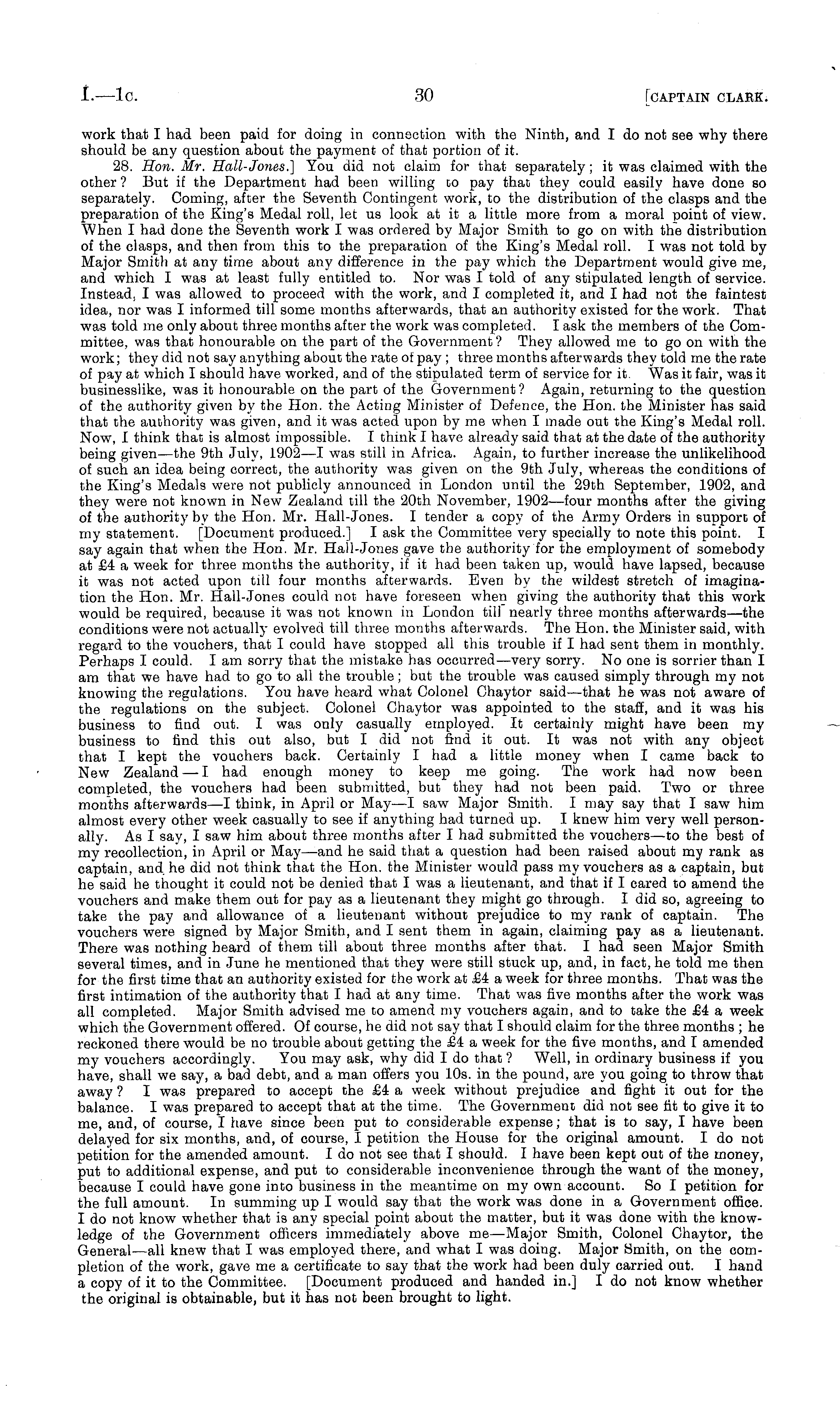work that I had been paid for doing in connection with the Ninth, and I do not see why there should be any question about the payment of that portion of it. 28. Hon. Mr. Hall-Jones.] You did not claim for that separately; it was claimed with the other ? But if the Department had been willing co pay that they could easily have done so separately. Coming, after the Seventh Contingent work, to the distribution of the clasps and the preparation of the King's Medal roll, let us look at it a little more from a moral point of view. When I had done the Seventh work I was ordered by Major Smith to go on with the distribution of the clasps, and then from this to the preparation of the King's Medal roll. I was not told by Major Smith at any time about any difference in the pay which the Department would give me, and which I was at least fully entitled to. Nor was I told of any stipulated length of service. Instead, I was allowed to proceed with the work, and I completed it, and I had not the faintest idea, nor was I informed till some months afterwards, that an authority existed for the work. That was told me only about three months afcer the work was completed. I ask the members of the Committee, was that honourable on the part of the Government ? They allowed me to go on with the work; they did not say anything about the rate of pay ; three months afterwards they told me the rate of pay at which I should have worked, and of the stipulated term of service for it. Was it fair, was it businesslike, was it honourable on the part of the Government? Again, returning to the question of the authority given by the Hon. the Acting Minister of Defence, the Hon. the Minister has said that the authority was given, and it was acted upon by me when I made out the King's Medal roll. Now, I think that is almost impossible. I think I have already said that at the date of the authority being given—the 9th July, 1902—1 was still in Africa. Again, to further increase the unlikelihood of such an idea being correct, the authority was given on the 9th July, whereas the conditions of the King's Medals were not publicly announced in London until the 29th September, 1902, and they were not known in New Zealand till the 20th November, 1902—four months after the giving of the authority by the Hon. Mr. Hall-Jones. I tender a copy of the Army Orders in support of my statement. [Document produced.] I ask the Committee very specially to note this point. I say again that when the Hon. Mr. Hall-Jones gave the authority for the employment of somebody at £4 a week for three months the authority, if it had been taken up, would have lapsed, because it was not acted upon till four months afterwards. Even by the wildest stretch of imagination the Hon. Mr. Hall-Jones could not have foreseen when giving the authority that this work would be required, because it was not known in London till nearly three months afterwards—the conditions were not actually evolved till three months afterwards. The Hon. the Minister said, with regard to the vouchers, that I could have stopped all this trouble if I had sent them in monthly. Perhaps I could. lam sorry that the mistake has occurred—very sorry. No one is sorrier than I am that we have had to go to all the trouble; but the trouble was caused simply through my not knowing the regulations. You have heard what Colonel Chaytor said—that he was not aware of the regulations on the subject. Colonel Chaytor was appointed to the staff, and it was his business to find out. I was only casually employed. It certainly might have been my business to find this out also, but I did not find it out. It was not with any object that I kept the vouchers back. Certainly I had a little money when I came back to New Zealand — I had enough money to keep me going. The work had now been completed, the vouchers had been submitted, but they had not been paid. Two or three months afterwards —I think, in April or May —I saw Major Smith. I may say that I saw him almost every other week casually to see if anything had turned up. I knew him very well personally. As I say, I saw him about three months after I had submitted the vouchers—to the best of my recollection, in April or May—and he said that a question had been raised about my rank as captain, and. he did not think that the Hon. the Minister would pass my vouchers as a captain, but he said he thought it could not be denied that I was a lieutenant, and that if I cared to amend the vouchers and make them out for pay as a lieutenant they might go through. I did so, agreeing to take the pay and allowance of a lieutenant without prejudice to my rank of captain. The vouchers were signed by Major Smith, and I sent them in again, claiming pay as a lieutenant. There was nothing heard of them till about three months after that. I had seen Major Smith several times, and in June he mentioned that they were still stuck up, and, in fact, he told me then for the first time that an authority existed for the work at £4 a week for three months. That was the first intimation of the authority that I had at any time. That was five months after the work was all completed. Major Smith advised me to amend my vouchers again, and to take the £4 a week which the Government offered. Of course, he did not say that I should claim for the three months ; he reckoned there would be no trouble about getting the £4 a week for the five months, and I amended my vouchers accordingly. You may ask, why did Ido that ? Well, in ordinary business if you have, shall we say, a bad debt, and a man offers you 10s. in the pound, are you going to throw that away ? I was prepared to accept the £4 a week without prejudice and fight it out for the balance. I was prepared to accept that at the time. The Government did not see fit to give it to me, and, of course, I have since been put to considerable expense; that is to say, I have been delayed for six months, and, of course, I petition the House for