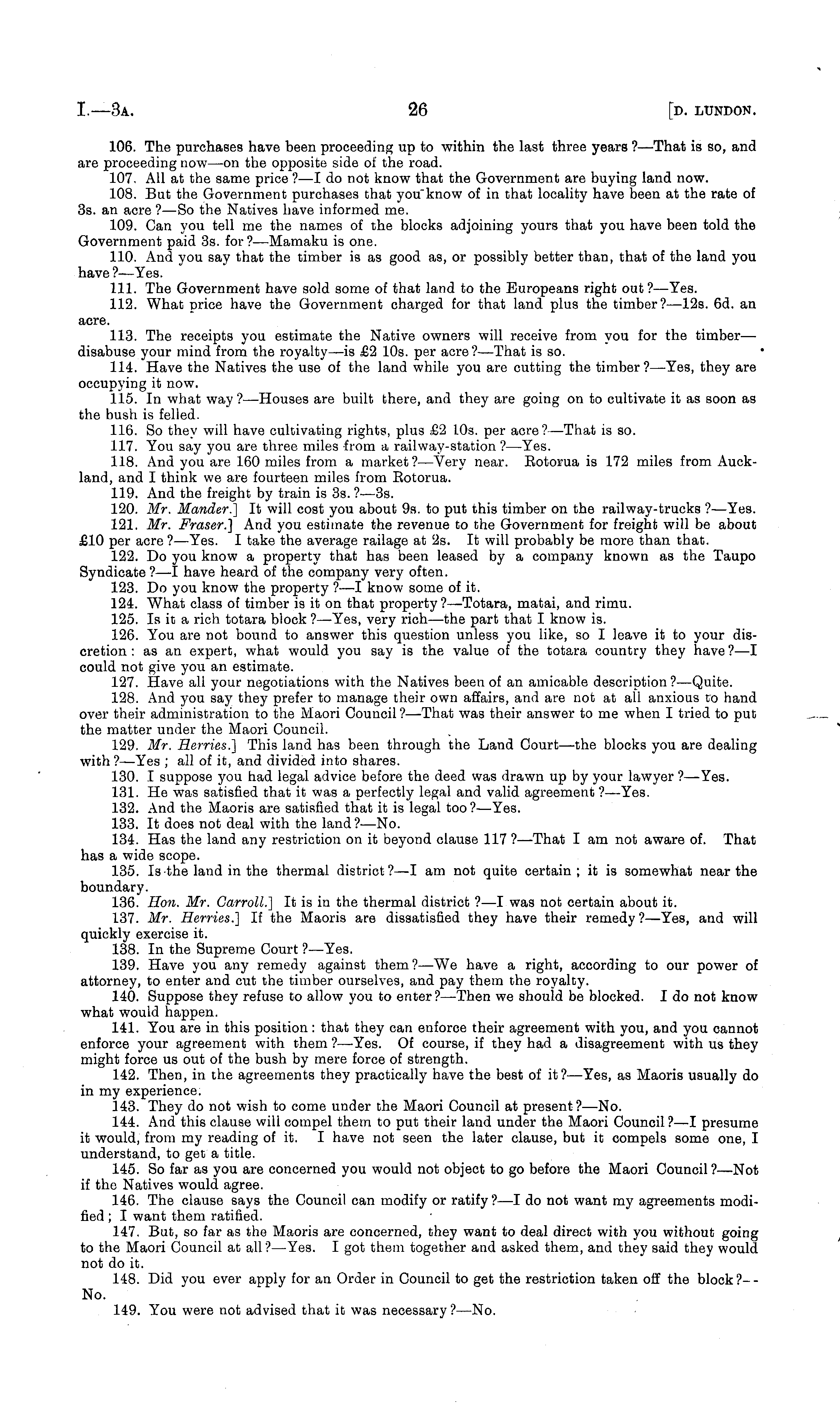 106. The purchases have been proceeding up to within the last three years ?—That is so, and are proceeding now —on the opposite side of the road. 107. All at the same price ? —I do not know that the Government are buying land now. 108. But the Government purchases that you'know of in that locality have been at the rate of 3s. an acre ?—So the Natives have informed me. 109. Can you tell me the names of the blocks adjoining yours that you have been told the Government paid 3s. for?—Mamaku is one. 110. And you say that the timber is as good as, or possibly better than, that of the land you have ?—Yes. 111. The Government have sold some of that land to the Europeans right out? —Yes. 112. What price have the Government charged for that land plus the timber?—l2s. 6d. an acre. 113. The receipts you estimate the Native owners will receive from you for the timber— disabuse your mind from the royalty—is £2 10s. per acre? —That is so. 114. Have the Natives the use of the land while you are cutting the timber?— Yes, they are occupying it now. 115. In what way? —Houses are built there, and they are going on to cultivate it as soon as the bush is felled. 116. So they will have cultivating rights, plus £2 10s. per acre? —That is so. 117. You say you are three miles from a railway-station ?—Yes. 118. And you are 160 miles from a market?— Very near. Botorua is 172 miles from Auckland, and I think we are fourteen miles from Botorua. 119. And the freight by train is 3s. ?—3s. 120. Mr. Mander.] It will cost you about 9s. to put this timber on the railway-trucks ?—Yes. 121. Mr. Fraser.] And you estimate the revenue to the Government for freight will be about £10 per acre? —Yes. I take the average railage at 2s. It will probably be more than that. 122. Do you know a property that has been leased by a company known as the Taupo Syndicate ?—I have heard of the company very often. 123. Do you know the property ?—I know some of it. 124. What class of timber is it on that property?—Totara, matai, and rimu. 125. Is it a rich totara block ?—Yes, very rich—the part that I know is. 126. You are not bound to answer this question unless you like, so I leave it to your discretion : as an expert, what would you say is the value of the totara country they have?—l could not give you an estimate. 127. Have all your negotiations with the Natives been of an amicable description?— Quite. 128. And you say they prefer to manage their own affairs, and are not at all anxious to hand over their administration to the Maori Council ?—That was their answer to me when I tried to put the matter under the Maori Council. 129. Mr. Herries.] This land has been through the Land Court—the blocks you are dealing with ?—Yes ; all of it, and divided into shares. 130. I suppose you had legal advice before the deed was drawn up by your lawyer ?—Yes. 131. He was satisfied that it was a perfectly legal and valid agreement ?—Yes. 132. And the Maoris are satisfied that it is legal too ?—Yes. 133. It does not deal with the land ?—No. 134. Has the land any restriction on it beyond clause 117 ?—That I am not aware of. That has a wide scope. 135. Is the land in the thermal district?—l am not quite certain ; it is somewhat near the boundary. 136. Hon. Mr. Carroll.] It is in the thermal district ?—I was not certain about it. 137. Mr. Herries.] If the Maoris are dissatisfied they have their remedy?— Yes, and will quickly exercise it. 138. In the Supreme Court ?—Yes. 139. Have you any remedy against them ?—We have a right, according to our power of attorney, to enter and cut the timber ourselves, and pay them the royalty. 140. Suppose they refuse to allow you to enter?— Then we should be blocked. Ido not know what would happen. 141. You are in this position : that they can enforce their agreement with you, and you cannot enforce your agreement with them ?—Yes. Of course, if they had a disagreement with us they might force us out of the bush by mere force of strength. 142. Then, in the agreements they practically have the best of it?— Yes, as Maoris usually do in my experience. 143. They do not wish to come under the Maori Council at present?— No. 144. And this clause will compel them to put their land under the Maori Council ?—I presume it would, from my reading of it. I have not seen the later clause, but it compels some one, I understand, to get a title. 145. So far as you are concerned you would not object to go before the Maori Council?— Not if the Natives would agree. 146. The clause says the Council can modify or ratify ? —I do not want my agreements modified ; I want them ratified. 147. But, so far as the Maoris are concerned, they want to deal direct with you without going to the Maori Council at all ? —Yes. I got them together and asked them, and they said they would not do it. 148. Did you ever apply for an Order in Council to get the restriction taken off the block ?-- No. 149. You were not advised that it was necessary ?—No.