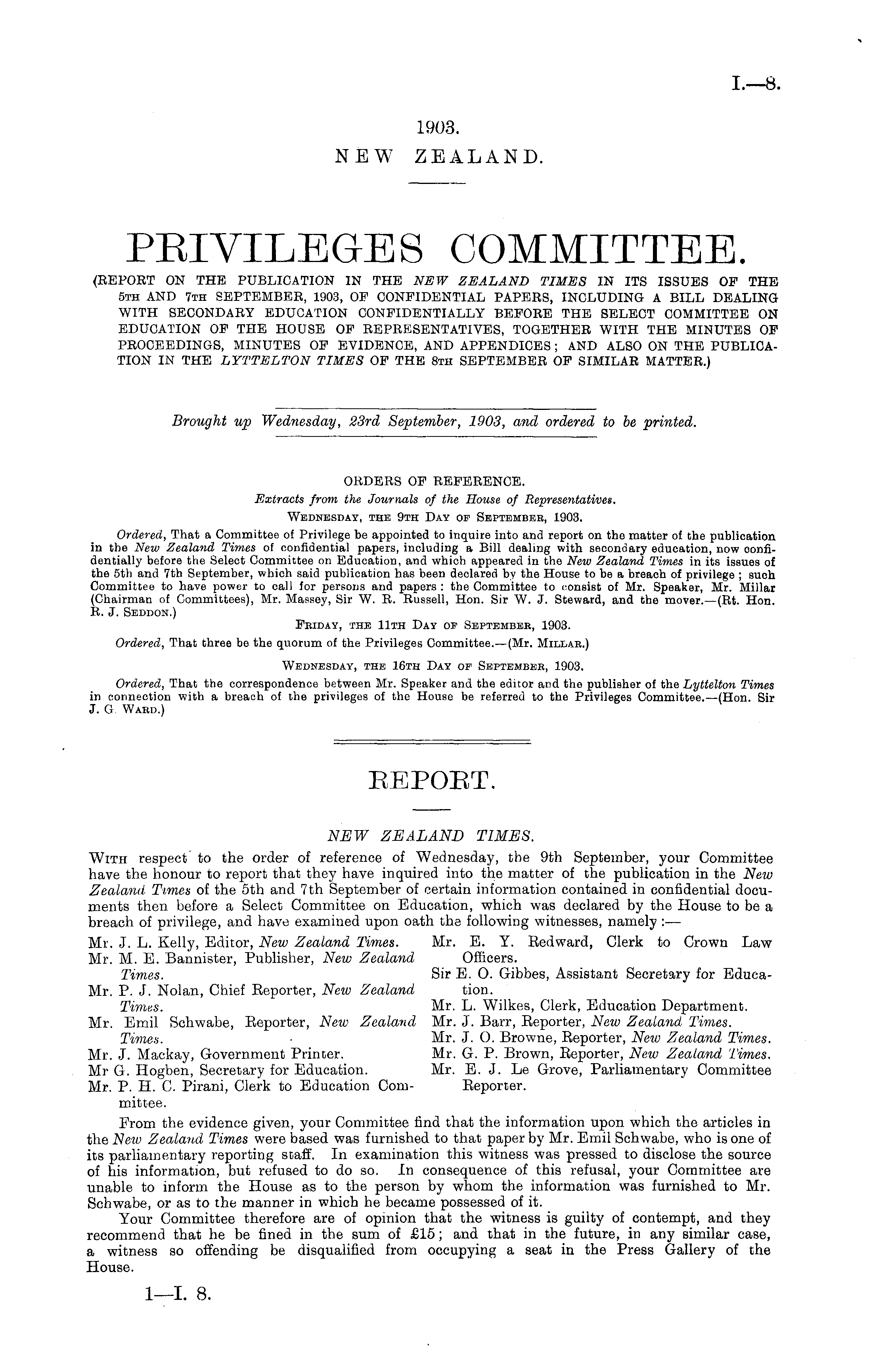 PRIVILEGES COMMITTEE. (REPORT ON THE PUBLICATION IN THE NEW ZEALAND TIMES IN ITS ISSUES OF THE 5th AND 7th SEPTEMBER, 1903, OF CONFIDENTIAL PAPERS, INCLUDING A BILL DEALING WITH SECONDARY EDUCATION CONFIDENTIALLY BEFORE THE SELECT COMMITTEE ON EDUCATION OF THE HOUSE OF REPRESENTATIVES, TOGETHER WITH THE MINUTES OF PROCEEDINGS, MINUTES OF EVIDENCE, AND APPENDICES; AND ALSO ON THE PUBLICATION IN THE LYTTELTON TIMES OF THE 8th SEPTEMBER OF SIMILAR MATTER.)