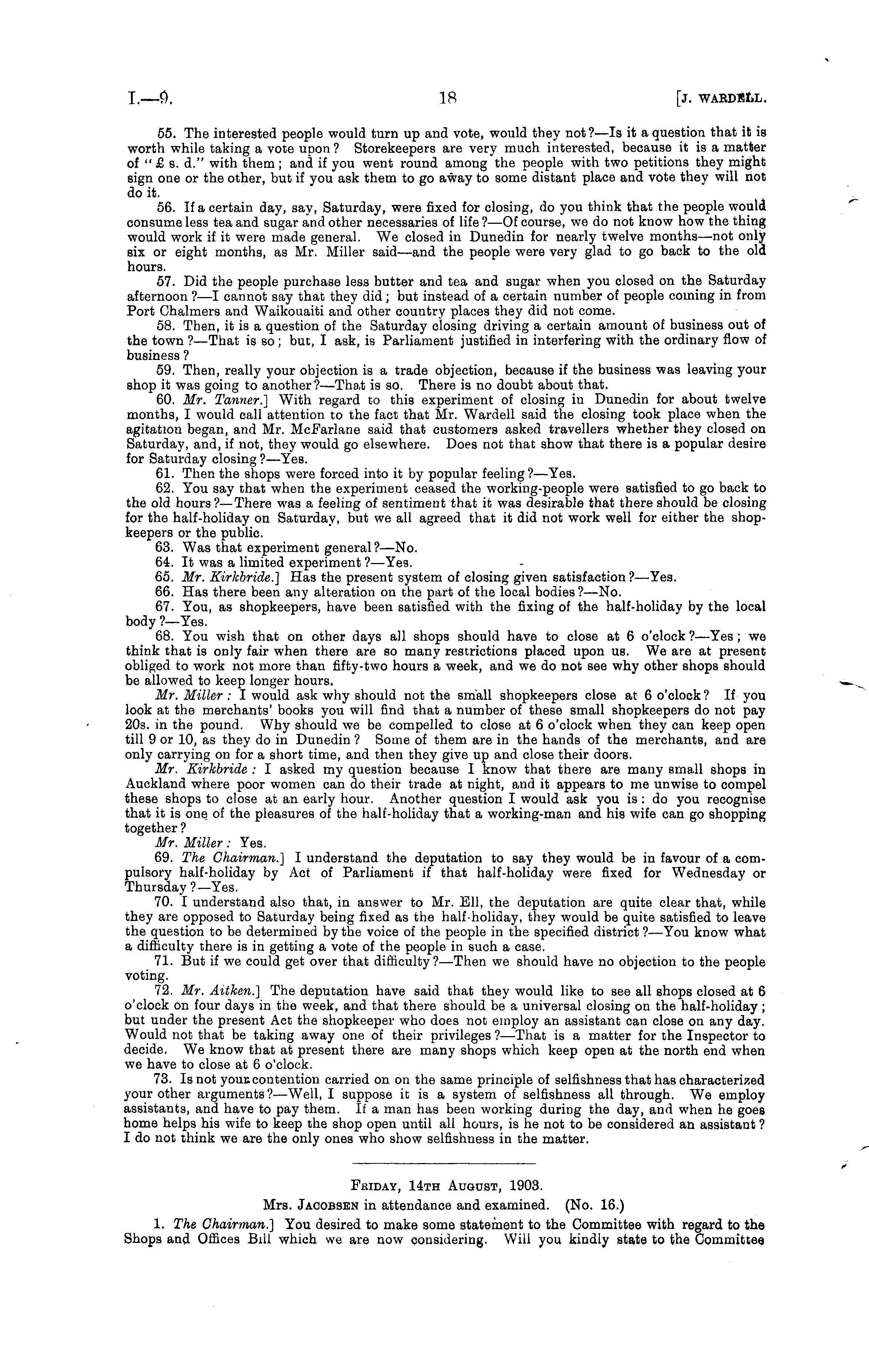 Fbiday, 14th August, 1903. Mrs. Jacobsen in attendance and examined. (No. 16.) 1. The Chairman.] You desired to make some statement to the Committee with regard to the Shops and Offices Bill which we are now considering. Will you kindly state to the Committee