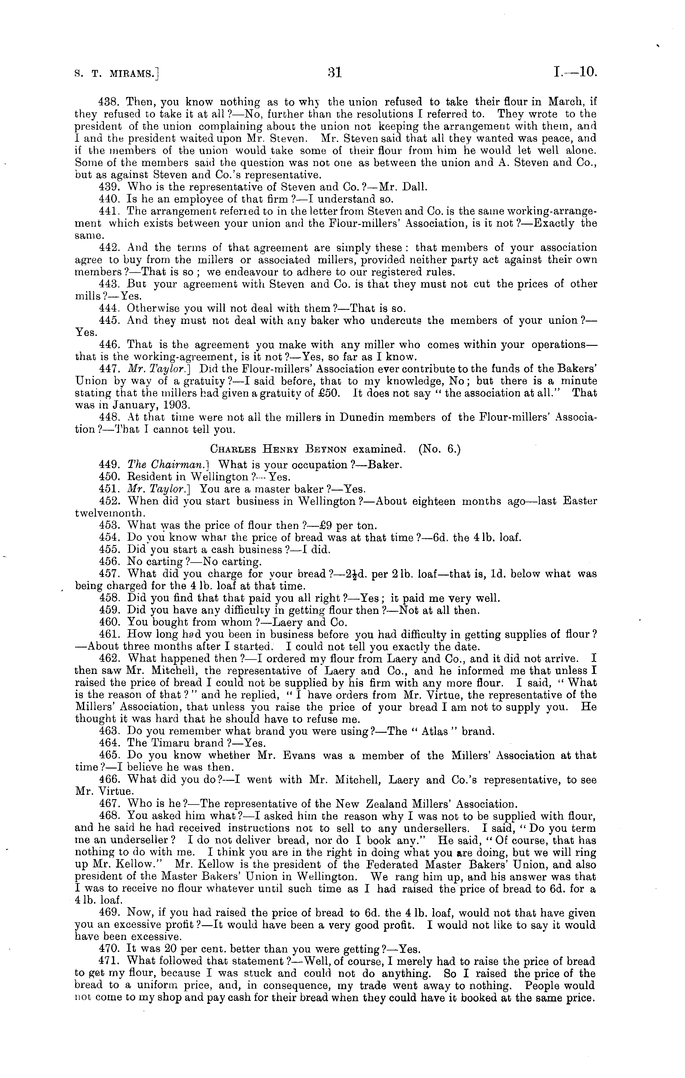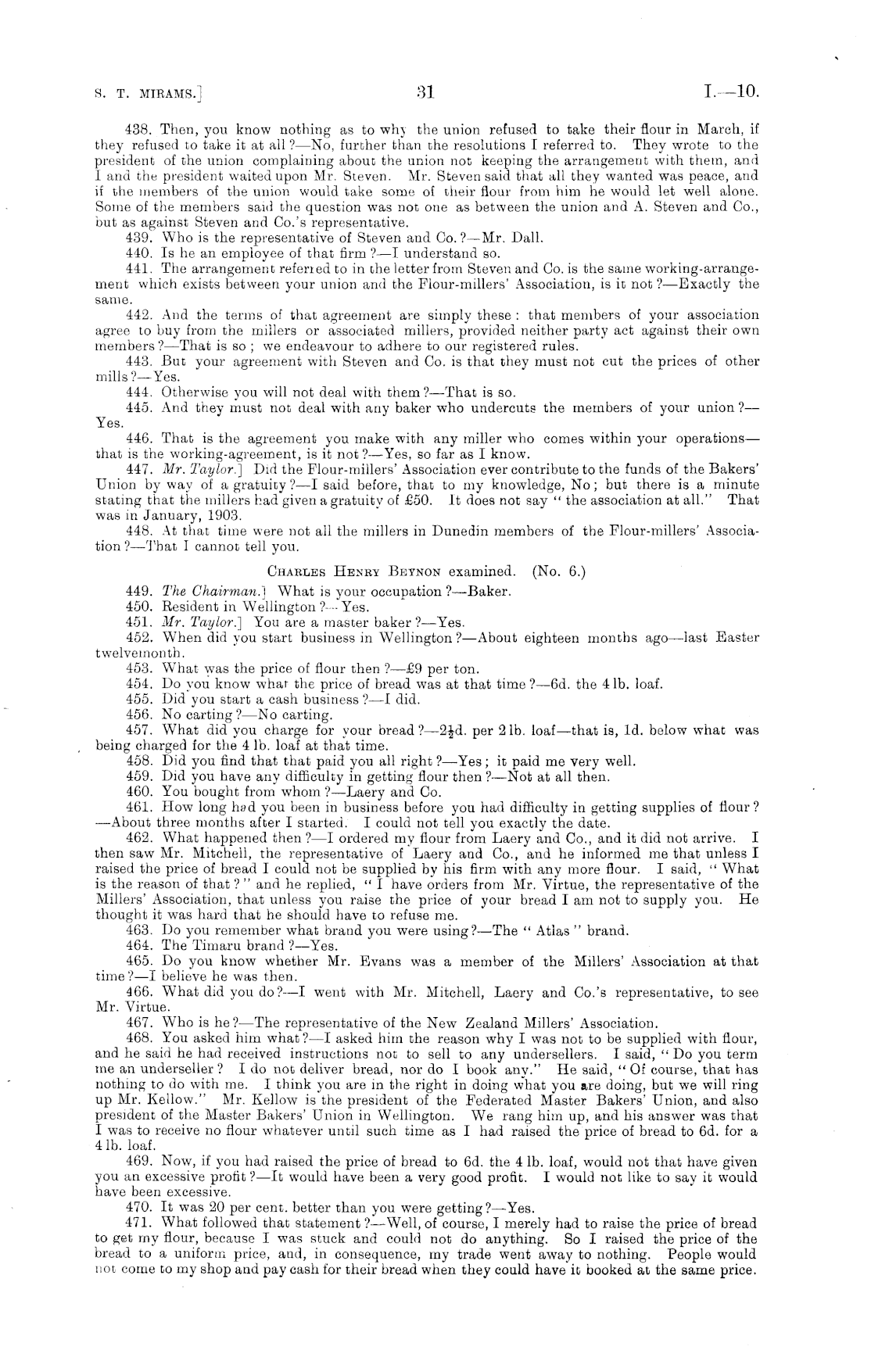 438. Then, you know nothing as to why the union refused to take their flour in March, if they refused to take it at all ?—No, further than the resolutions I referred to. They wrote to the president of the union complaining about the union not keeping the arrangement with them, and I and the president waited upon Mr. Steven. Mr. Steven said that all they wanted was peace, and if the members of the union would take some of their flour from him he would let well alone. Some of the members said the question was not one as between the union and A. Steven and Co., but as against Steven and Co.'s representative. 439. Who is the representative of Steven and Co. ?—Mr. Dall. 440. Is he an employee of that firm ?—I understand so. 441. The arrangement referred to in the letter from Steven and Co. is the same working-arrange-ment which exists between your union and the Flour-millers' Association, is it not ?—Exactly the same. 442. And the terms of that agreement are simply these : that members of your association agree to buy from the millers or associated millers, provided neither party act against their own members ?—That is so ; we endeavour to adhere to our registered rules. 443. But your agreement with Steven and Co. is that they must not cut the prices of other mills ?—Yes. 444. Otherwise you will not deal with them?— That is so. 445. And they must not deal with any baker who undercuts the members of your union ? — Yes. 446. That is the agreement you make with any miller who comes within your operations — that is the working-agreement, is it not?— Yes, so far as I know. 447. Mr. Taylor.] Did the Flour-millers' Association ever contribute to the funds of the Bakers' Union by way of a gratuity ?—I said before, that to my knowledge, No; but there is a minute stating that the millers had given a gratuity of £50. It does not say " the association at all." That was in January, 1903. 448. At that time were not all the millers in Dunedin members of the Flour-millers' Association ? —That I cannot tell you. Charles Henry Beynon examined. (No. 6.) 449. The Chairman.] What is your occupation ?—Baker. 450. Eesident in Wellington ?-- Yes. 451. Mr. Taylor.] You are a master baker ?—Yes. 452. When did you start business in Wellington ? —About eighteen months ago—last Easter twelvemonth. 453. What was the price of flour then ? —£9 per ton. 454. Do you know what the price of bread was at that time ?—6d. the 4 lb. loaf. 455. Did you start a cash business ?—I did. 456. No carting ?—No carting. 457. What did you charge for your bread?—2|d. per 21b. loaf—that is, Id. below what was being charged for the 4 lb. loaf at that time. 458. Did you find that that paid you all right ? —Yes; it paid me very well. 459. Did you have any difficulty in getting flour then ?—Not at all then. 460. You bought from whom ?—Laery and Co. 461. How long had you been in business before you had difficulty in getting supplies of flour? —About three months after I started. I could not tell you exactly the date. 462. What happened then ? —I ordered my flour from Laery and Co., and it did not arrive. I then saw Mr. Mitchell, the representative of Laery and Co., and he informed me that unless I raised the price of bread I could not be supplied by his firm with any more flour. I said, " What is the reason of that ? " and he replied, " I have orders from Mr. Virtue, the representative of the Millers' Association, that unless you raise the price of your bread lam not to supply you. He thought it was hard that he should have to refuse me. 463. Do you remember what brand you were using?— The " Atlas " brand. 464. The Timaru brand ?—Yes. 465. Do you know whether Mr. Evans was a member of the Millers' Association at that time?—l believe he was then. 466. What did you do?—I went with Mr. Mitchell, Laery and Co.'s representative, to see Mr. Virtue. 467. Who is he?— The representative of the New Zealand Millers' Association. 468. You asked him what ?—I asked him the reason why I was not to be supplied with flour, and he said he had received instructions not to sell to any undersellers. I said, "Do you term me an underseller? Ido not deliver bread, nor do I book any." He said, "Of course, that has nothing to do with me. I think you are in the right in doing what you are doing, but we will ring up Mr. Kellow." Mr. Kellow is the president of the Federated Master Bakers' Union, and also president of the Master Bakers' Union in Wellington. We rang him up, and his answer was that I was to receive no flour whatever until such time as I had raised the price of bread to 6d. for a 4 lb. loaf. 469. Now, if you had raised the price of bread to 6d. the 4 lb. loaf, would not that have given you an excessive profit ?—lt would have been a very good profit. I would not like to say it would have been excessive. 470. It was 20 per cent, better than you were getting? —Yes. 471. What followed that statement ?—Well, of course, I merely had to raise the price of bread to get my flour, because I was stuck and could not do anything. So I raised the price of the bread to a uniform price, and, in consequence, my trade went away to nothing. People would not come to my shop and pay cash for their bread when they could have it booked at the same price.