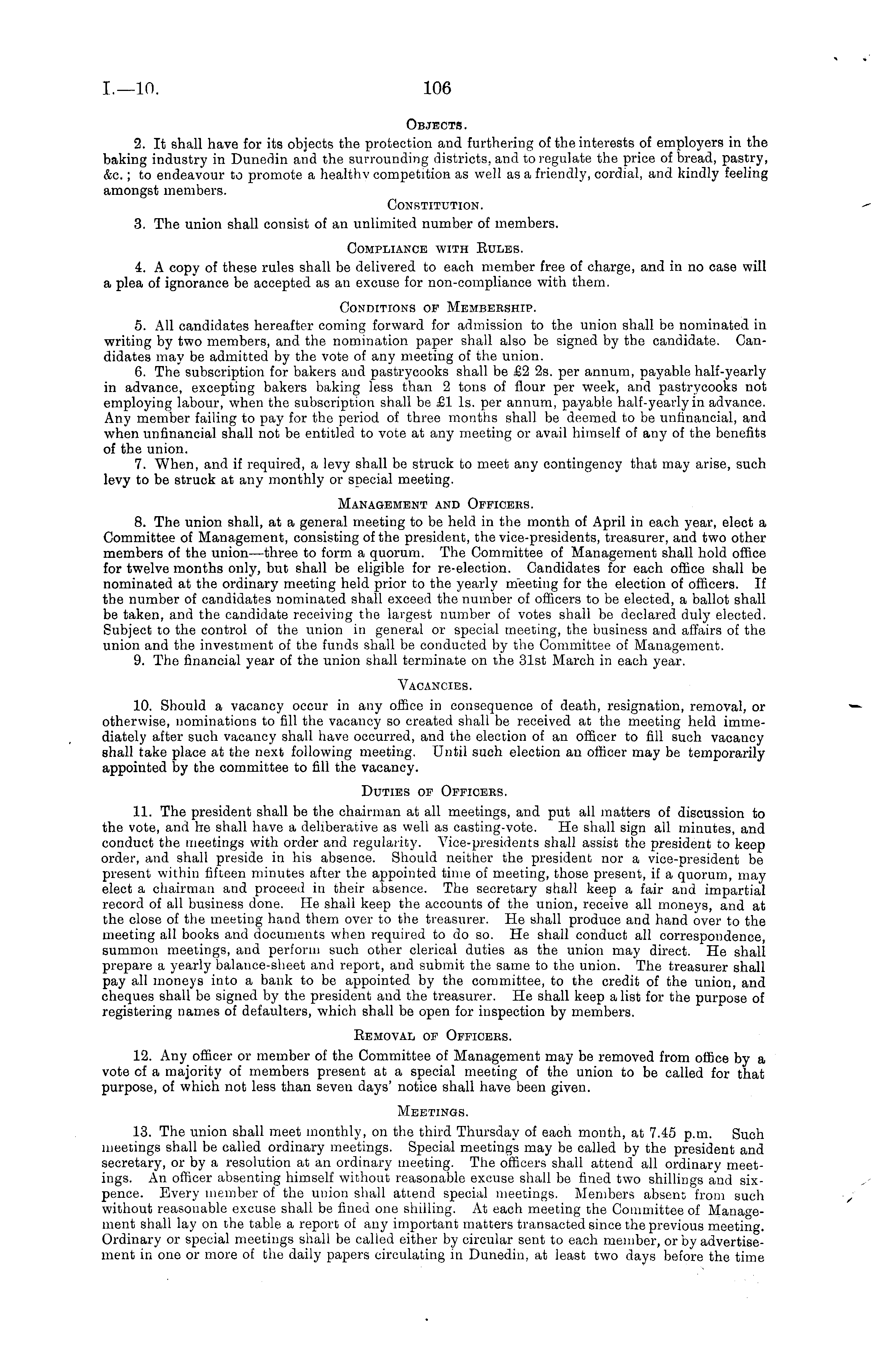 Objects. 2. It shall have for its objects the protection and furthering of the interests of employers in the baking industry in Dunedin and the surrounding districts, and to regulate the price of bread, pastry, &c.; to endeavour to promote a healthy competition as well as a friendly, cordial, and kindly feeling amongst members. Constitution. 3. The union shall consist of an unlimited number of members. Compliance with Eules. 4. A copy of these rules shall be delivered to each member free of charge, and in no case will a plea of ignorance be accepted as an excuse for non-compliance with them. Conditions of Membership. 5. All candidates hereafter coming forward for admission to the union shall be nominated in writing by two members, and the nomination paper shall also be signed by the candidate. Candidates may be admitted by the vote of any meeting of the union. 6. The subscription for bakers aud pastrycooks shall be £2 2s. per annum, payable half-yearly in advance, excepting bakers baking less than 2 tons of flour per week, and pastrycooks not employing labour, when the subscription shall be £1 Is. per annum, payable half-yearly in advance. Any member failing to pay for the period of three months shall be deemed to be unfinancial, and when unfinancial shall not be entitled to vote at any meeting or avail himself of any of the benefits of the union. 7. When, and if required, a levy shall be struck to meet any contingency that may arise, such levy to be struck at any monthly or special meeting. Management and Officers. 8. The union shall, at a general meeting to be held in the month of April in each year, elect a Committee of Management, consisting of the president, the vice-presidents, treasurer, and two other members of the union—three to form a quorum. The Committee of Management shall hold office for twelve months only, but shall be eligible for re-election. Candidates for each office shall be nominated at the ordinary meeting held prior to the yearly meeting for the election of officers. If the number of candidates nominated shall exceed the number of officers to be elected, a ballot shall be taken, and the candidate receiving the largest number of votes shall be declared duly elected. Subject to the control of the union in general or special meeting, the business and affairs of the union and the investment of the funds shall be conducted by the Committee of Management. 9. The financial year of the union shall terminate on tbe 31st March in each year. Vacancies. 10. Should a vacancy occur in any office in consequence of death, resignation, removal, or otherwise, nominations to fill the vacancy so created shall be received at the meeting held immediately after such vacancy shall have occurred, and the election of an officer to fill such vacancy shall take place at the next following meeting. Until such election an officer may be temporarily appointed by the committee to fill the vacancy. Duties of Officers. 11. The president shall be the chairman at all meetings, and put all matters of discussion to the vote, and he shall have a deliberative as well as casting-vote. He shall sign all minutes, and conduct the meetings with order and regularity. Vice-presidents shall assist the president to keep order, and shall preside in his absence. Should neither the president nor a vice-president be present within fifteen minutes after the appointed time of meeting, those present, if a quorum, may elect a chairman and proceed in their absence. The secretary shall keep a fair and impartial record of all business done. He shall keep the accounts of the union, receive all moneys, and at the close of the meeting hand them over to the treasurer. He shall produce and hand over to the meeting all books and documents when required to do so. He shall conduct all correspondence, summon meetings, and perform such other clerical duties as the union may direct. He shall prepare a yearly balance-sheet and report, and submit the same to the union. The treasurer shall pay all moneys into a bank to be appointed by the committee, to the credit of the union, and cheques shall be signed by the president aud the treasurer. He shall keep a list for the purpose of registering names of defaulters, which shall be open for inspection by members. Eemoval of Officers. 12. Any officer or member of the Committee of Management may be removed from office by a vote of a majority of members present at a special meeting of the union to be called for that purpose, of which not less than seven days' notice shall have been given. Meetings. 13. The union shall meet monthly, on the third Thursday of each month, at 7.45 p.m. Such meetings shall be called ordinary meetings. Special meetings may be called by the president and secretary, or by a resolution at an ordinary meeting. The officers shall attend all ordinary meetings. An officer absenting himself without reasonable excuse shall be fined two shillings and sixpence. Every member of the union shall attend special meetings. Members absent from such without reasonable excuse shall be fined one shilling. At each meeting the Committee of Management shall lay on the table a report of any important matters transacted since the previous meeting. Ordinary or special meetings shall be called either by circular sent to each member, or by advertisement in one or more of the daily papers circulating in Dunedin, at least two days before the time