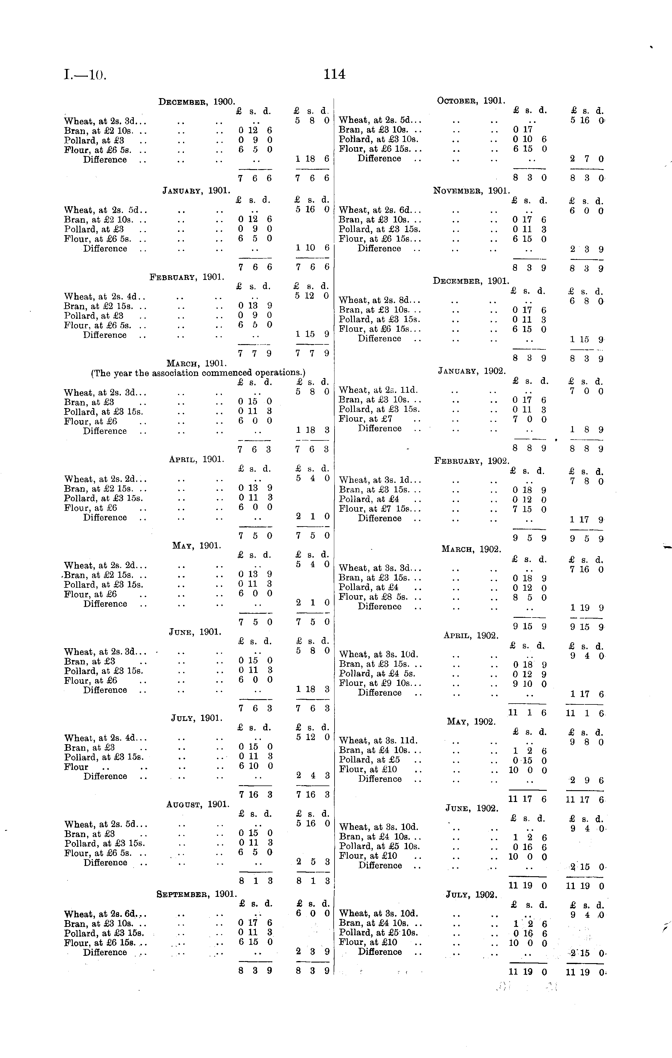 December, 1900. £ s. d. £ s. d. Wheat, at 2s. 3d... .. .. .. 5 8 0 Bran, at £2 10s. .. .. .. 0 12 6 Pollard, at £3 .. .. .. 0 9 0 Flour, at £6 ss. .. .. .. 6 5 0 Difference .. .. .. .. 1 18 6 766 7 6 6 January, 1901. £ s. d. £ s. d. Wheat, at 2s. 5d.. .. .. .. 5 16 0 Bran, at £2 10s. .. .. .. 012 6 Pollard, at £3 .. .. .. 0 9 0 Flour, at £6 ss. .. .. .. 6 5 0 Difference .. .. .. .. 1 10 6 766 7 6 6 February, 1901. £ s. d. £ s. d. Wheat, at 2s. 4d.. .. .. .. 5 12 0 Bran, at £2 15s. .. .. .. 013 9 Pollard, at £3 .. .. .. 0 9 0 Flour, at £6 ss. .. .. .. 6 5 0 Difference .. .. .. .. 115 9 779 7 7 9 March, 1901. (The year the association commenced operations.) £ s. d. £ s. d. Wheat, at 2s. 3d... .. .. .. 5 8 0 Bran, at £3 .. .. .. 015 0 Pollard, at £3 15s. .. .. 0 11 3 Flour, at £6 .. .. ..600 Difference .. .. .. .. 118 3 763 7 6 3 April, 1901. £ s. d. £ s. d. Wheat, at 2s. 2d... .. .. .. 5 4 0 Bran, at £2 15s. .. .. .. 013 9 Pollard, at £3 15s. .. .. 011 3 Flour, at £6 .. .. ..600 Difference .. .. .. .. 2 10 750 7 5 0 May, 1901. £ s. d. £ s. d. Wheat, at 2s. 2d... .. .. .. 5 4 0 .Bran, at £2 15s. .. .. .. 013 9 Pollard, at £3 15s. .. .. 0 11 3 Flour, at £6 .. .. ..600 Difference .. .. .. .. 2 10 750 7 5 0 June, 1901. £ s. d. £ s. d. Wheat, at 2s. 3d... • .. .. .. 5 8 0 Bran, at £3 .. .. .. 015 0 Pollard, at £3 15s. .. .. 0 11 3 Flour, at £6 .. .. ..600 Difference .. .. .. .. 118 3 763 7 6 3 July, 1901. £ s. d. £ s. d. Wheat, at 2s. 4d... .. .. .. 5 12 0 Bran, at £3 .. .. .. 015 0 Pollard, at £3 15s. .. .. 011 3 Flour 6 10 0 Difference .. .. 243 7 16 3 7 16 3 August, 1901. £ s. d. £ s. d. Wheat, at 2s. 5d... .. .. .. 5 16 0 Bran, at £3 .. .. .. 015 0 Pollard, at £3 15s. .. .. 011 3 Flour, at £6 ss. .. ... .. 6 5 0 Difference .. .. .. .. 2 5 3 8 13 8 13 September, 1901. £ s. d. £ s. d. Wheat, at 2s. 6d... .. .. .. 6 0 0 Bran, at £3 10s. .. .. .. 017 6 Pollard, at £3 15s. .. .. 0 11 3 Flour, at £6 15s. .. .. .. 6 15 0 Difference .. .. ... .. 2 3 9 839 8 3 9
