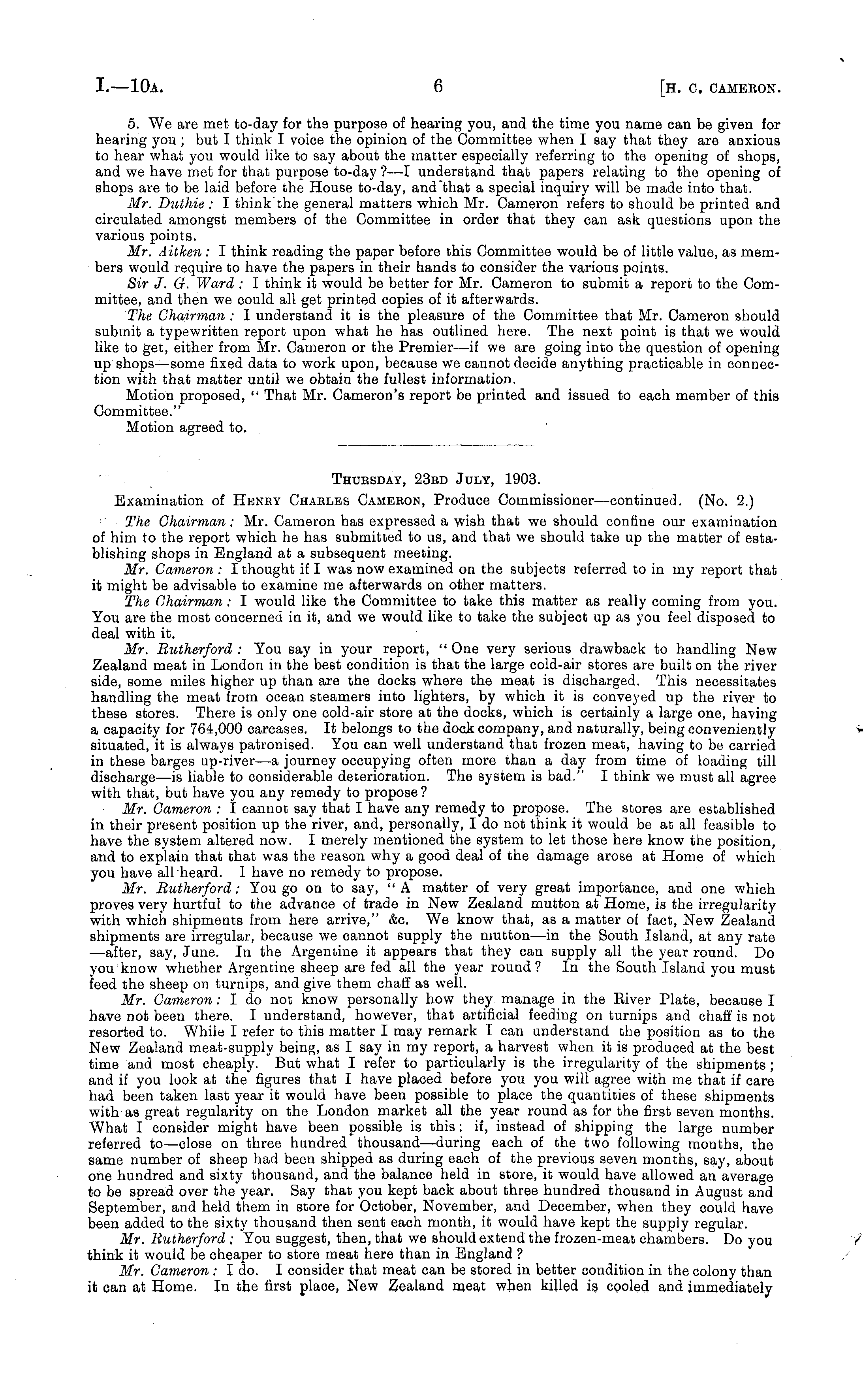 Thursday, 23ed July, 1903. Examination of Heney Chaeles Cameron, Produce Commissioner—continued. (No. 2.) The Chairman: Mr. Cameron has expressed a wish that we should confine our examination of him to the report which he has submitted to us, and that we should take up the matter of establishing shops in England at a subsequent meeting. Mr. Cameron : I thought if I was now examined on the subjects referred to in my report that it might be advisable to examine me afterwards on other matters. The Chairman: I would like the Committee to take this matter as really coming from you. You are the most concerned in it, and we would like to take the subject up as you feel disposed to deal with it. Mr. Rutherford : You say in your report, " One very serious drawback to handling New Zealand meat in London in the best condition is that the large cold-air stores are built on the river side, some miles higher up than are the docks where the meat is discharged. This necessitates handling the meat from ocean steamers into lighters, by which it is conveyed up the river to these stores. There is only one cold-air store at the docks, which is certainly a large one, having a capacity for 764,000 carcases. It belongs to the dock company, and naturally, being conveniently situated, it is always patronised. You can well understand that frozen meat, having to be carried in these barges up-river—a journey occupying often more than a day from time of loading till discharge—is liable to considerable deterioration. The system is bad." I think we must all agree with that, but have you any remedy to propose ? Mr. Cameron : I cannot say that I have any remedy to propose. The stores are established in their present position up the river, and, personally, I do not think it would be at all feasible to have the system altered now. I merely mentioned the system to let those here know the position, and to explain that that was the reason why a good deal of the damage arose at Home of which you have all heard. I have no remedy to propose. Mr. Rutherford: You go on to say, "A matter of very great importance, and one which proves very hurtful to the advance of trade in New Zealand mutton at Home, is the irregularity with which shipments from here arrive," &c. We know that, as a matter of fact, New Zealand shipments are irregular, because we cannot supply the mutton —in the South Island, at any rate —after, say, June. In the Argentine it appears that they can supply all the year round. Do you know whether Argentine sheep are fed all the year round ? In the South Island you must feed the sheep on turnips, and give them chaff as well. Mr. Cameron: I do not know personally how they manage in the Eiver Plate, because I have not been there. I understand, however, that artificial feeding on turnips and chaff is not resorted to. While I refer to this matter I may remark I can understand the position as to the New Zealand meat-supply being, as I say in my report, a harvest when it is produced at the best time and most cheaply. But what I refer to particularly is the irregularity of the shipments ; and if you look at the figures that I have placed before you you will agree with me that if care had been taken last year it would have been possible to place the quantities of these shipments with as great regularity on the London market all the year round as for the first seven months. What I consider might have been possible is this : if, instead of shipping the large number referred to —close on three hundred thousand—during each of the two following months, the same number of sheep had been shipped as during each of the previous seven months, say, about one hundred and sixty thousand, and the balance held in store, it would have allowed an average to be spread over the year. Say that you kept back about three hundred thousand in August and September, and held them in store for October, November, and December, when they could have been added to the sixty thousand then sent each month, it would have kept the supply regular. Mr. Rutherford : You suggest, then, that we should extend the frozen-meat chambers. Do you think it would be cheaper to store meat here than in England ? Mr. Cameron : I do. I consider that meat can be stored in better condition in the colony than it can at Home. In the first place, New Zealand meat when killed is cooled and immediately