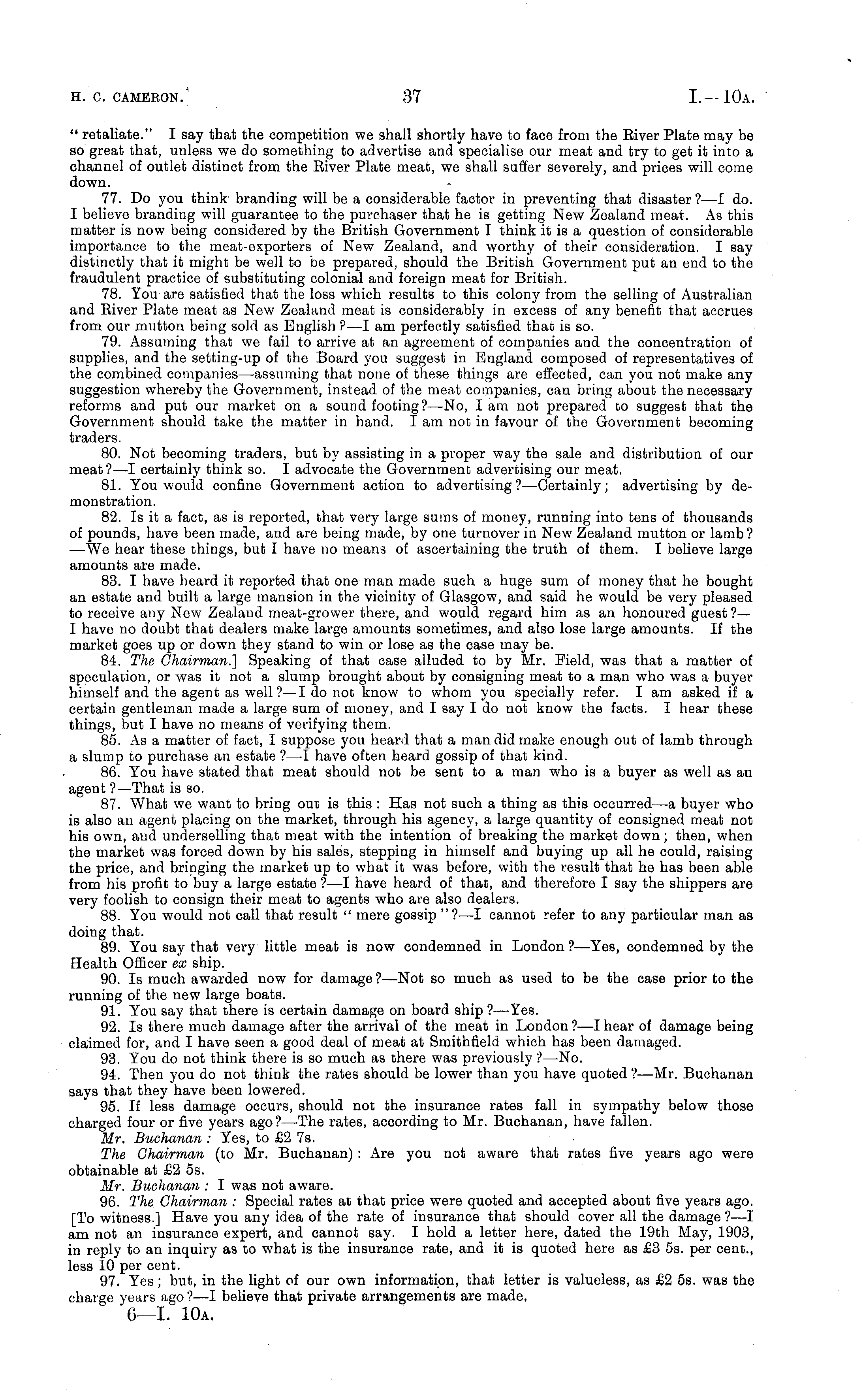 " retaliate." I say that the competition we shall shortly have to face from the Eiver Plate may be so great that, unless we do something to advertise and specialise our meat and try to get it into a channel of outlet distinct from the Eiver Plate meat, we shall suffer severely, and prices will come down. 77. Do you think branding will be a considerable factor in preventing that disaster?—l do. I believe branding will guarantee to the purchaser that he is getting New Zealand meat. As this matter is now being considered by the British Government I think it is a question of considerable importance to the meat-exporters of New Zealand, and worthy of their consideration. I say distinctly that it might be well to be prepared, should the British Government put an end to the fraudulent practice of substituting colonial and foreign meat for British. 78. You are satisfied that the loss which results to this colony from the selling of Australian and Eiver Plate meat as New Zealand meat is considerably in excess of any benefit that accrues from our mutton being sold as English ?—I am perfectly satisfied that is so. 79. Assuming that we fail to arrive at an agreement of companies and the concentration of supplies, and the setting-up of the Board you suggest in England composed of representatives of the combined companies—assuming that none of these things are effected, can you not make any suggestion whereby the Government, instead of the meat companies, can bring about the necessary reforms and put our market on a sound footing?—No, I am not prepared to suggest that the Government should take the matter in hand. lam not in favour of the Government becoming traders. 80. Not becoming traders, but by assisting in a proper way the sale and distribution of our meat? —I certainly think so. I advocate the Government advertising our meat. 81. You would confine Government action to advertising?— Certainly; advertising by demonstration. 82. Is it a fact, as is reported, that very large sums of money, running into tens of thousands of pounds, have been made, and are being made, by one turnover in New Zealand mutton or lamb? —We hear these things, but I have no means of ascertaining the truth of them. I believe large amounts are made. 83. I have heard it reported that one man made such a huge sum of money that he bought an estate and built a large mansion in the vicinity of Glasgow, and said he would be very pleased to receive any New Zealand meat-grower there, and would regard him as an honoured guest ?— I have no doubt that dealers make large amounts sometimes, and also lose large amounts. If the market goes up or down they stand to win or lose as the case may be. 84. The Chairman.] Speaking of that case alluded to by Mr. Field, was that a matter of speculation, or was it not a slump brought about by consigning meat to a man who was a buyer himself and the agent as well?—I do not know to whom you specially refer. lam asked if a certain gentleman made a large sum of money, and I say Ido not know the facts. I hear these things, but I have no means of verifying them. 85. As a matter of fact, I suppose you heard that a man did make enough out of lamb through a slump to purchase an estate ? —I have often heard gossip of that kind. 86. You have stated that meat should not be sent to a man who is a buyer as well as an agent ?—That is so. 87. What we want to bring out is this : Has not such a thing as this occurred—a buyer who is also an agent placing on the market, through his agency, a large quantity of consigned meat not his own, and underselling that meat with the intention of breaking the market down; then, when the market was forced down by his sales, stepping in himself and buying up all he could, raising the price, and bringing the market up to what it was before, with the result that he has been able from his profit to buy a large estate ?—I have heard of that, and therefore I say the shippers are very foolish to consign their meat to agents who are also dealers. 88. You would not call that result " mere gossip "?—I cannot refer to any particular man as doing that. 89. You say that very little meat is now condemned in London ?—Yes, condemned by the Health Officer ex ship. 90. Is much awarded now for damage ?—Not so much as used to be the case prior to the running of the new large boats. 91. You say that there is certain damage on board ship ?—Yes. 92. Is there much damage after the arrival of the meat in London?—l hear of damage being claimed for, and I have seen a good deal of meat at Smithfield which has been damaged. 93. You do not think there is so much as there was previously ? —No. 94. Then you do not think the rates should be lower than you have quoted ?—Mr. Buchanan says that they have been lowered. 95. If less damage occurs, should not the insurance rates fall in sympathy below those charged four or five years ago? —The rates, according to Mr. Buchanan, have fallen. Mr. Buchanan : Yes, to £2 7s. The Chairman (to Mr. Buchanan) : Are you not aware that rates five years ago were obtainable at £2 ss. Mr. Buchanan : I was not aware. 96. The Chairman : Special rates at that price were quoted and accepted about five years ago. [To witness.] Have you any idea of the rate of insurance that should cover all the damage ?—I am not an insurance expert, and cannot say. I hold a letter here, dated the 19th May, 1903, in reply to an inquiry as to what is the insurance rate, and it is quoted here as £3 ss. per cent., less 10 per cent. 97. Yes; but, in the light of our own information, that letter is valueless, as £2 ss. was the charge years ago ?—I believe that private arrangements are made, 6—l. 10a.