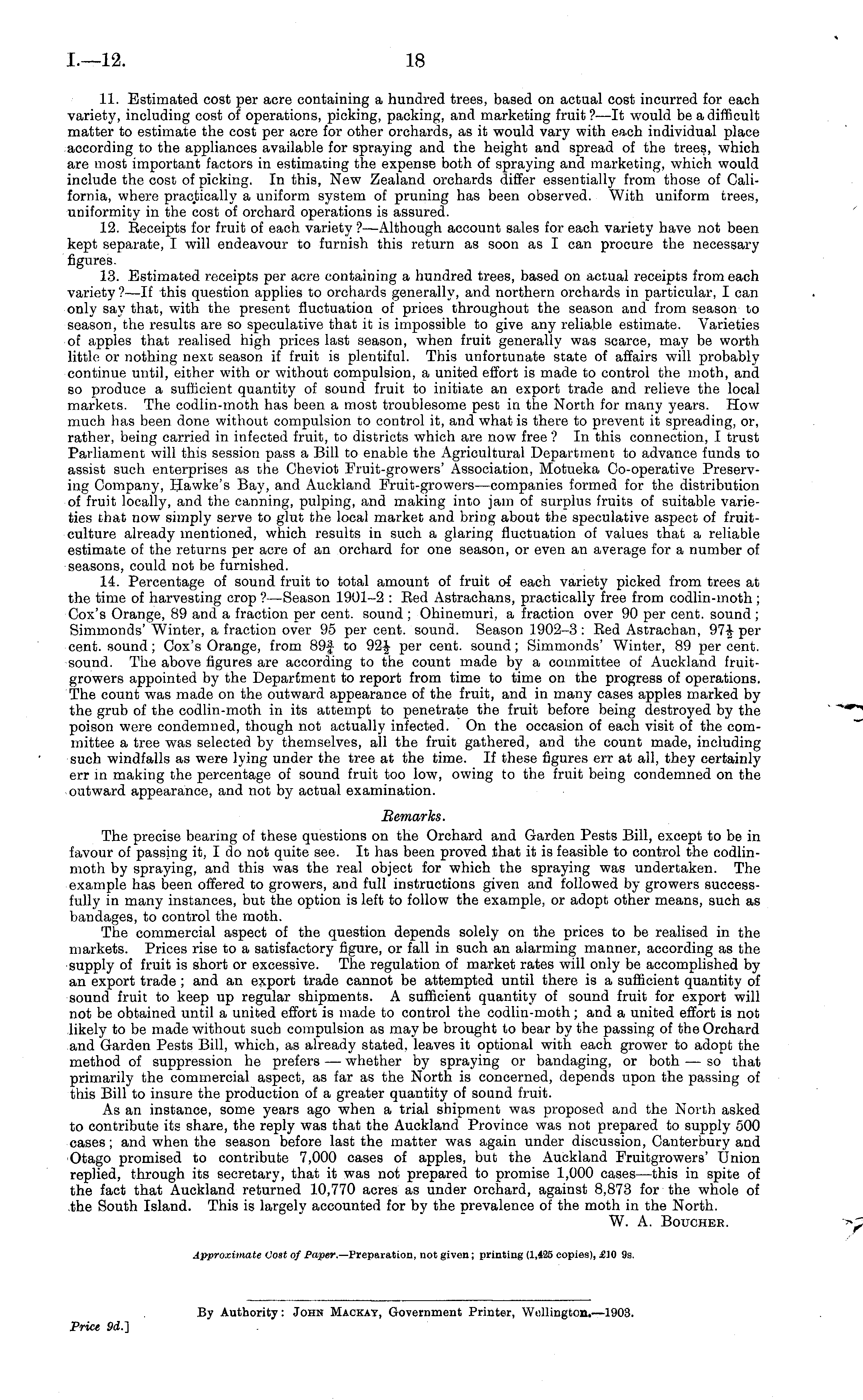 11. Estimated cost per acre containing a hundred trees, based on actual cost incurred for each variety, including cost of operations, picking, packing, and marketing fruit?—lt would be a difficult matter to estimate the cost per acre for other orchards, as it would vary with each individual place according to the appliances available for spraying and the height and spread of the trees, which are most important factors in estimating the expense both of spraying and marketing, which would include the cost of picking. In this, New Zealand orchards differ essentially from those of California, where practically a uniform system of pruning has been observed. With uniform trees, uniformity in the cost of orchard operations is assured. 12. Receipts for fruit of each variety ?—Although account sales for each variety have not been kept separate, I will endeavour to furnish this return as soon as I can procure the necessary figures. 13. Estimated receipts per acre containing a hundred trees, based on actual receipts from each variety ?—lf this question applies to orchards generally, and northern orchards in particular, I can only say that, with the present fluctuation of prices throughout the season and from season to season, the results are so speculative that it is impossible to give any reliable estimate. Varieties of apples that realised high prices last season, when fruit generally was scarce, may be worth little or nothing next season if fruit is plentiful. This unfortunate state of affairs will probably continue until, either with or without compulsion, a united effort is made to control the moth, and so produce a sufficient quantity of sound fruit to initiate an export trade and relieve the local markets. The codlin-moth has been a most troublesome pest in the North for many years. How much has been done without compulsion to control it, and what is there to prevent it spreading, or, rather, being carried in infected fruit, to districts which are now free'? In this connection, I trust Parliament will this session pass a Bill to enable the Agricultural Department to advance funds to assist such enterprises as the Cheviot Fruit-growers' Association, Motueka Co-operative Preserving Company, Hawke's Bay, and Auckland Fruit-growers—companies formed for the distribution of fruit locally, and the canning, pulping, and making into jam of surplus fruits of suitable varieties that now simply serve to glut the local market and bring about the speculative aspect of fruitculture already mentioned, which results in such a glaring fluctuation of values that a reliable estimate of the returns per acre of an orchard for one season, or even an average for a number of seasons, could not be furnished. 14. Percentage of sound fruit to total amount of fruit of each variety picked from trees at the time of harvesting crop ?—Season 1901-2 : Eed Astrachans, practically free from codlin-inoth ; Cox's Orange, 89 and a fraction per cent, sound ; Ohinemuri, a fraction over 90 per cent, sound ; Simmonds' Winter, a fraction over 95 per cent, sound. Season 1902-3 : Red Astrachan, per cent, sound; Cox's Orange, from 89f to per cent, sound; Simmonds' Winter, 89 per cent, sound. The above figures are according to the count made by a committee of Auckland fruitgrowers appointed by the Department to report from time to time on the progress of operations. The count was made on the outward appearance of the fruit, and in many cases apples marked by the grub of the codlin-moth in its attempt to penetrate the fruit before being destroyed by the poison were condemned, though not actually infected. On the occasion of each visit of the committee a tree was selected by themselves, all the fruit gathered, and the count made, including such windfalls as were lying under the tree at the time. If these figures err at all, they certainly err in making the percentage of sound fruit too low, owing to the fruit being condemned on the outward appearance, and not by actual examination. Remarks. The precise bearing of these questions on the Orchard and Garden Pests Bill, except to be in favour of passing it, Ido not quite see. It has been proved that it is feasible to control the codlinmoth by spraying, and this was the real object for which the spraying was undertaken. The example has been offered to growers, and full instructions given and followed by growers successfully in many instances, but the option is left to follow the example, or adopt other means, such as bandages, to control the moth. The commercial aspect of the question depends solely on the prices to be realised in the markets. Prices rise to a satisfactory figure, or fall in such an alarming manner, according as the supply of fruit is short or excessive. The regulation of market rates will only be accomplished by an export trade ; and an export trade cannot be attempted until there is a sufficient quantity of sound fruit to keep up regular shipments. A sufficient quantity of sound fruit for export will not be obtained until a united effort is made to control the codlin-moth; and a united effort is not likely to be made without such compulsion as may be brought to bear by the passing of the Orchard and Garden Pests Bill, which, as already stated, leaves it optional with each grower to adopt the method of suppression he prefers — whether by spraying or bandaging, or both — so that primarily the commercial aspect, as far as the North is concerned, depends upon the passing of this Bill to insure the production of a greater quantity of sound fruit. As an instance, some years ago when a trial shipment was proposed and the North asked to contribute its share, the reply was that the Auckland Province was not prepared to supply 500 cases; and when the season before last the matter was again under discussion, Canterbury and Otago promised to contribute 7,000 cases of apples, but the Auckland Fruitgrowers' Union replied, through its secretary, that it was not prepared to prom