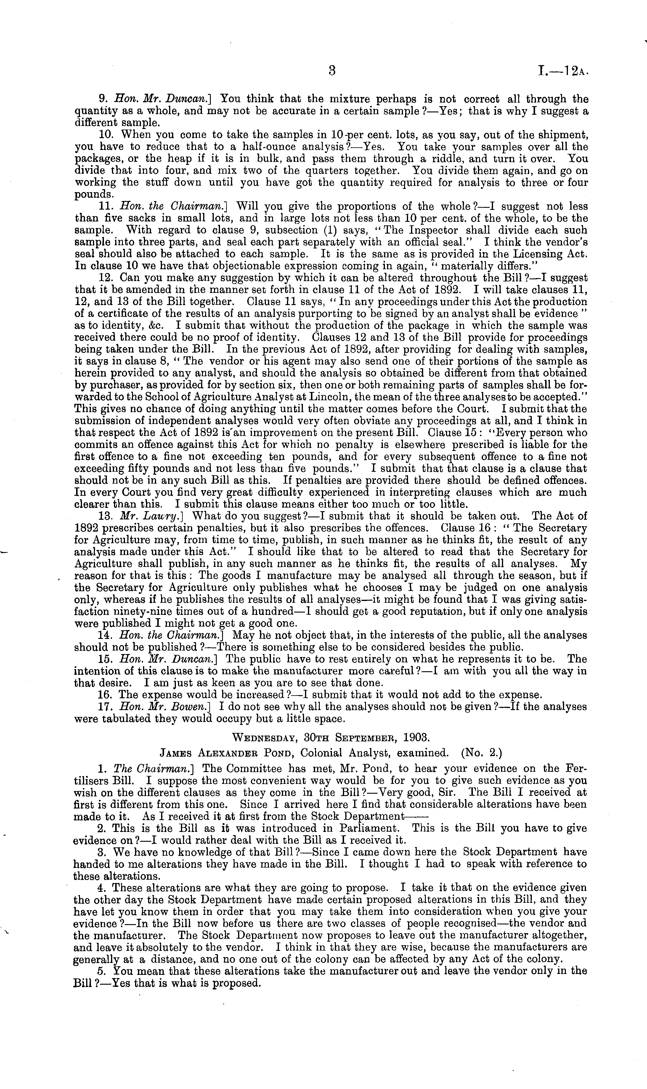 9. Hon. Mr. Duncan.] You think that the mixture perhaps is not correct all through the quantity as a whole, and may not be accurate in a certain sample ? —Yes; that is why I suggest a different sample. 10. When you come to take the samples in 10-per cent, lots, as you say, out of the shipment, you have to reduce that to a half-ounce analysis? —Yes. You take your samples over all the packages, or the heap if it is in bulk, and pass them through a riddle, and turn it over. You divide that into four, and mix two of the quarters together. You divide them again, and go on working the stuff down until you have got the quantity required for analysis to three or four pounds. 11. Hon. the Chairman.] Will you give the proportions of the whole ?—I suggest not less than five sacks in small lots, and in large lots not less than 10 per cent, of the whole, to be the sample. With regard to clause 9, subsection (1) says, " The Inspector shall divide each such sample into three parts, and seal each part separately with an official seal." I think the vendor's seal should also be attached to each sample. It is the same as is provided in the Licensing Act. In clause 10 we have that objectionable expression coming in again, " materially differs." 12. Can you make any suggestion by which it can be altered throughout the Bill ?—I suggest that it be amended in the manner set forth in clause 11 of the Act of 1892. I will take clauses 11, 12, and 13 of the Bill together. Clause 11 says, "In any proceedings under this Act the production of a certificate of the results of an analysis purporting to be signed by an analyst shall be evidence " as to identity, &c. I submit that without the production of the package in which the sample was received there could be no proof of identity. Clauses 12 and 13 of the Bill provide for proceedings being taken under the Bill. In the previous Act of 1892, after providing for dealing with samples, it says in clause 8, " The vendor or his agent may also send one of their portions of the sample as herein provided to any analyst, and should the analysis so obtained be different from that obtained by purchaser, as provided for by section six, then one or both remaining parts of samples shall be forwarded to the School of Agriculture Analyst at Lincoln, the mean of the three analyses to be accepted." This gives no chance of doing anything until the matter comes before the Court. I submit that the submission of independent analyses would very often obviate any proceedings at all, and I think in that respect the Act of 1892 is'an improvement on the present Bill. Ciause 15 : "Every person who commits an offence against this Act for which no penalty is elsewhere prescribed is liable for the first offence to a fine not exceeding ten pounds, and for every subsequent offence to a fine not exceeding fifty pounds and not less than five pounds." I submit that that clause is a clause that should not be in any such Bill as this. If penalties are provided there should be defined offences. In every Court you find very great difficulty experienced in interpreting clauses which are much clearer than this. I submit this clause means either too much or too little. 13. Mr. Laury.] What do you suggest?—l submit that it should be taken out. The Act of 1892 prescribes certain penalties, but it also prescribes the offences. Clause 16 : " The Secretary for Agriculture may, from time to time, publish, in such manner as he thinks fit, the result of any analysis made under this Act." I should like that to be altered to read that the Secretary for Agriculture shall publish, in any such manner as he thinks fit, the results of all analyses. My reason for that is this : The goods I manufacture may be analysed all through the season, but if the Secretary for Agriculture only publishes what he chooses I may be judged on one analysis only, whereas if he publishes the results of all analyses—it might be found that I was giving satisfaction ninety-nine times out of a hundred—l should get a good reputation, but if only one analysis were published I might not get a good one. 14. Hon. the Chairman.] May he not object that, in the interests of the public, all the analyses should not be published ?—There is something else to be considered besides the public. 15. Hon. Mr. Duncan.] The public have to rest entirely on what he represents it to be. The intention of this clause is to make the manufacturer more careful ? —I am with you all the way in that desire. lam just as keen as you are to see that done. 16. The expense would be increased ?—1 submit that it would not add to the expense. 17. Hon. Mr. Bowen.] I do not see why all the analyses should not be given ? —lf the analyses were tabulated they would occupy but a little space. Wednesday, 30th September, 1903. James Alexander Pond, Colonial Analyst, examined. (No. 2.) 1. The Chairman.] The Committee has met, Mr. Pond, to hear your evidence on the Fertilisers Bill. I suppose the most convenient way would be for you to give such evidence as you wish on the different clauses as they come in the Bill ?—Very good, Sir. The Bill I received at first is different from this one. Since I arrived here I find that considerable alterations have been made to it. As I received it at first from the Stock Department 2. This is the Bill as it was introduced in Parliament. This is the Bill you have to give evidence on ?—I would rather deal with the Bill as I received it. 3. We have no knowledge of that Bill?— Since I came down here the Stock Department have handed to me alterations they have made in the Bill. I thought I had to speak with reference to these alterations. 4. These alterations are what they are going to propose. I take it that on the evidence given the other day the Stock Department have made certain proposed alterations in this Bill, and they have let you know them in order that you may take them into consideration when you give your evidence ?—ln the B
