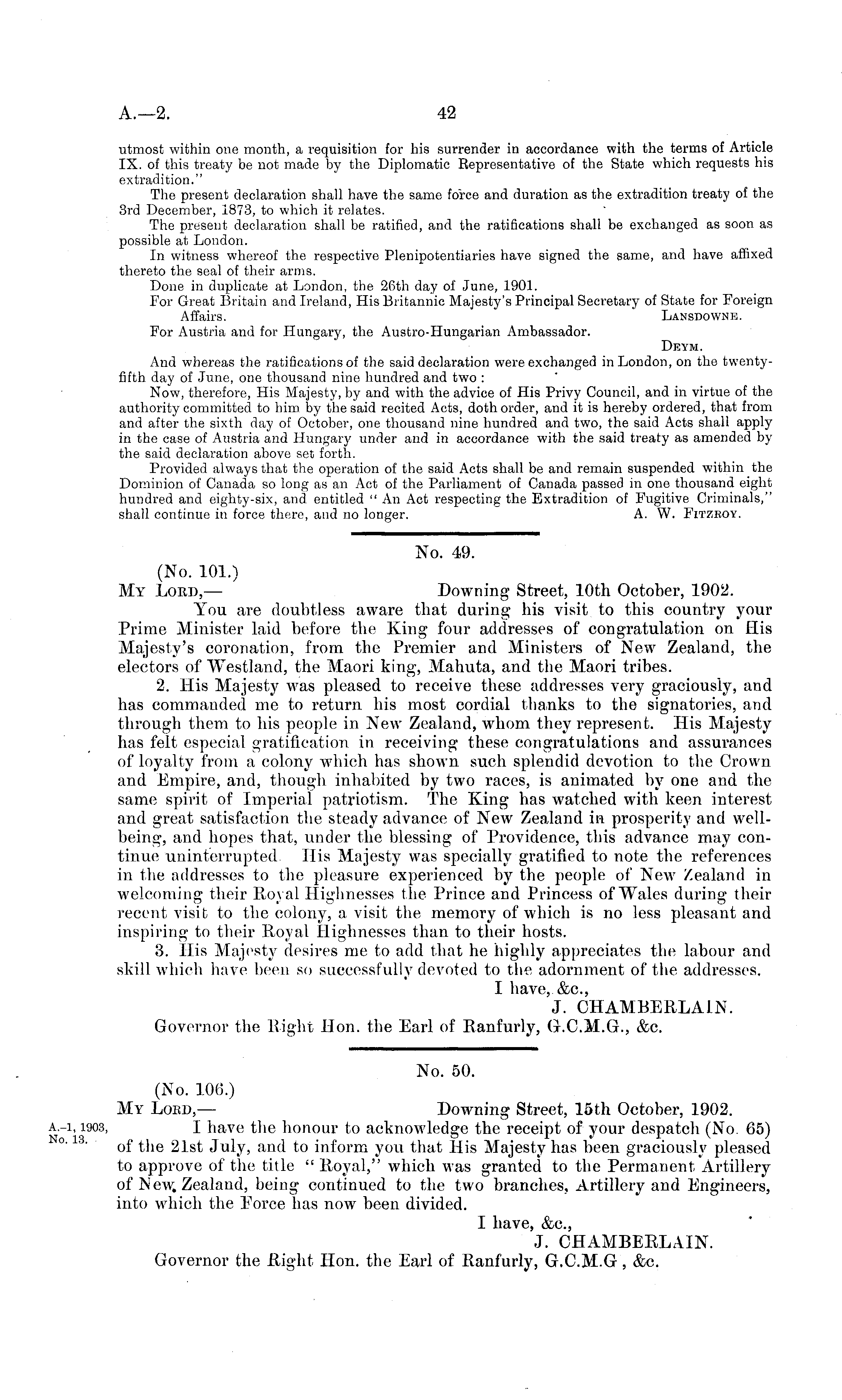No. 49. (No. 101.) My Loud,— Downing Street, 10th October, 1902. You are doubtless aware that during his visit to this country your Prime; Minister laid before the King four addresses of congratulation on His Majesty's coronation, from the Premier and Ministers of New Zealand, the electors of Westland, the Maori king, Mahuta, and the Maori tribes. 2. His Majesty was pleased to receive these addresses very graciously, and has commanded me to return his most cordial thanks to the signatories, and through them to his people in New Zealand, whom they represent. His Majesty has felt especial gratification in receiving these congratulations and assurances of loyalty from a colony which has shown such splendid devotion to the Crown and Empire, and, though inhabited by two races, is animated by one and the same spirit of Imperial patriotism. The King has watched with keen interest and great satisfaction the steady advance of New Zealand in prosperity and wellbeing, and hopes that, under the blessing of Providence, this advance may continue uninterrupted His Majesty was specially gratified to note the references in the addresses to the pleasure experienced by the people of New Zealand in welcoming their Royal Highnesses the Prince and Princess of Wales during their recent visit to the colony, a visit the memory of which is no less pleasant and inspiring to their Royal Highnesses than to their hosts. 3. His Majesty desires me to add that he highly appreciates the labour and skill which have been so successfully devoted to the adornment of the addresses. I have, &c, J. CHAMBERLAIN. Governor the Right Hon. the Earl of Ranfurly, G.C.M.G., &c.