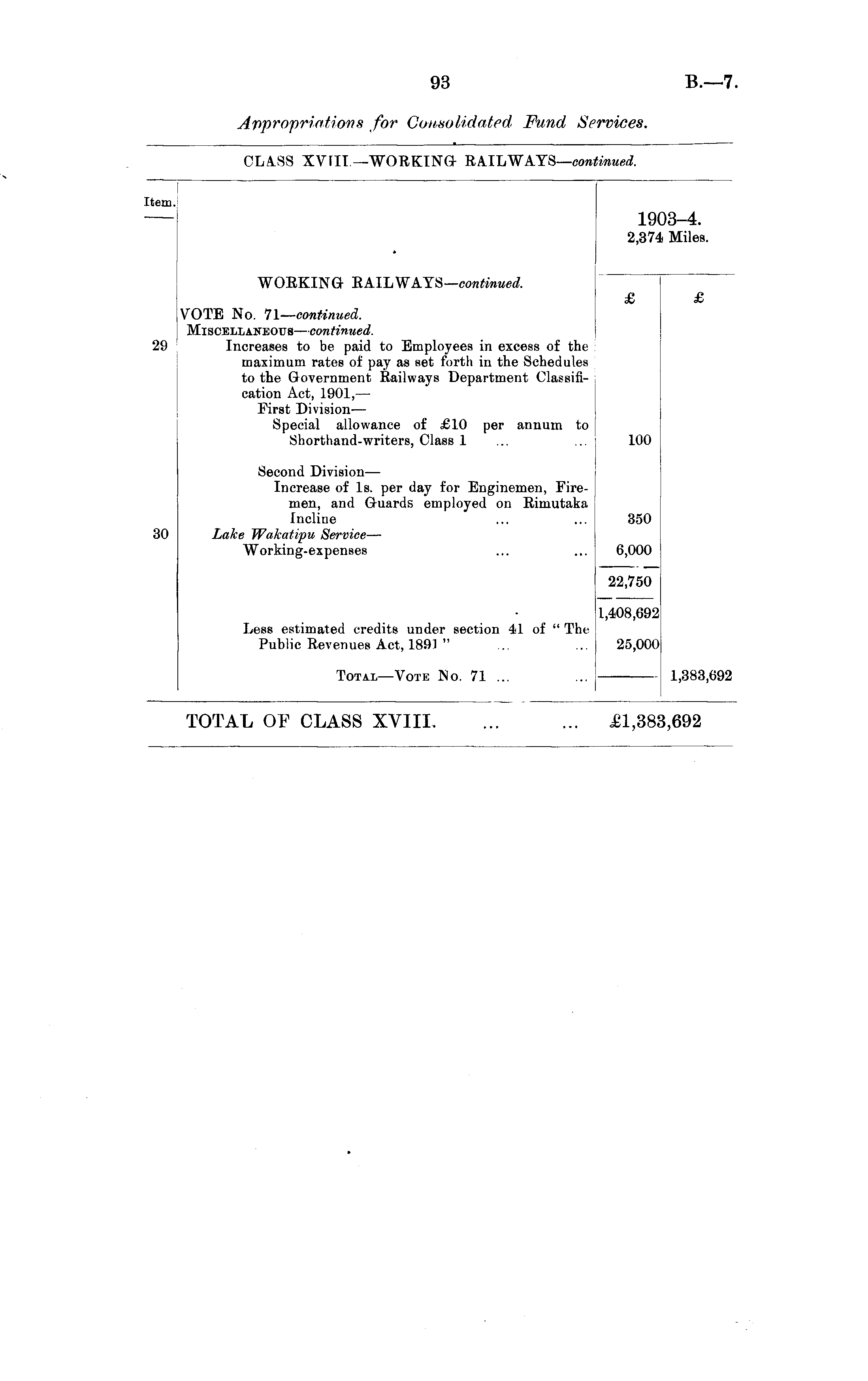 item. 19' 2,37< i3-4. Miles. WORKING RAILWAYS— continued. 2!) VOTE No. 71— continued. Miscellaneous — continued. Increases to be paid to Employees in excess of the maximum rates of pay as set forth in the Schedules to the Government Railways Department Classification Act, 1901,— First Division — Special allowance of £10 per annum to Shorthand-writers, Class 1 100 100 Second Division — Increase of Is. per day for Enginemen, Firemen, and Guards employed on Rimutaka Incline Lake Wakatipu Service — Working-expenses 350 350 6,000 22,750 30 6,000 22,750 1 L,408,692 1,408,692 Less estimated credits under section 41 of " The Public Revenues Act, 1891 " 25,000 25,000 Total —Vote No. 71 ... ... - 1,383,692 TOTAL OP CLASS XVIII. £1,38: ,692