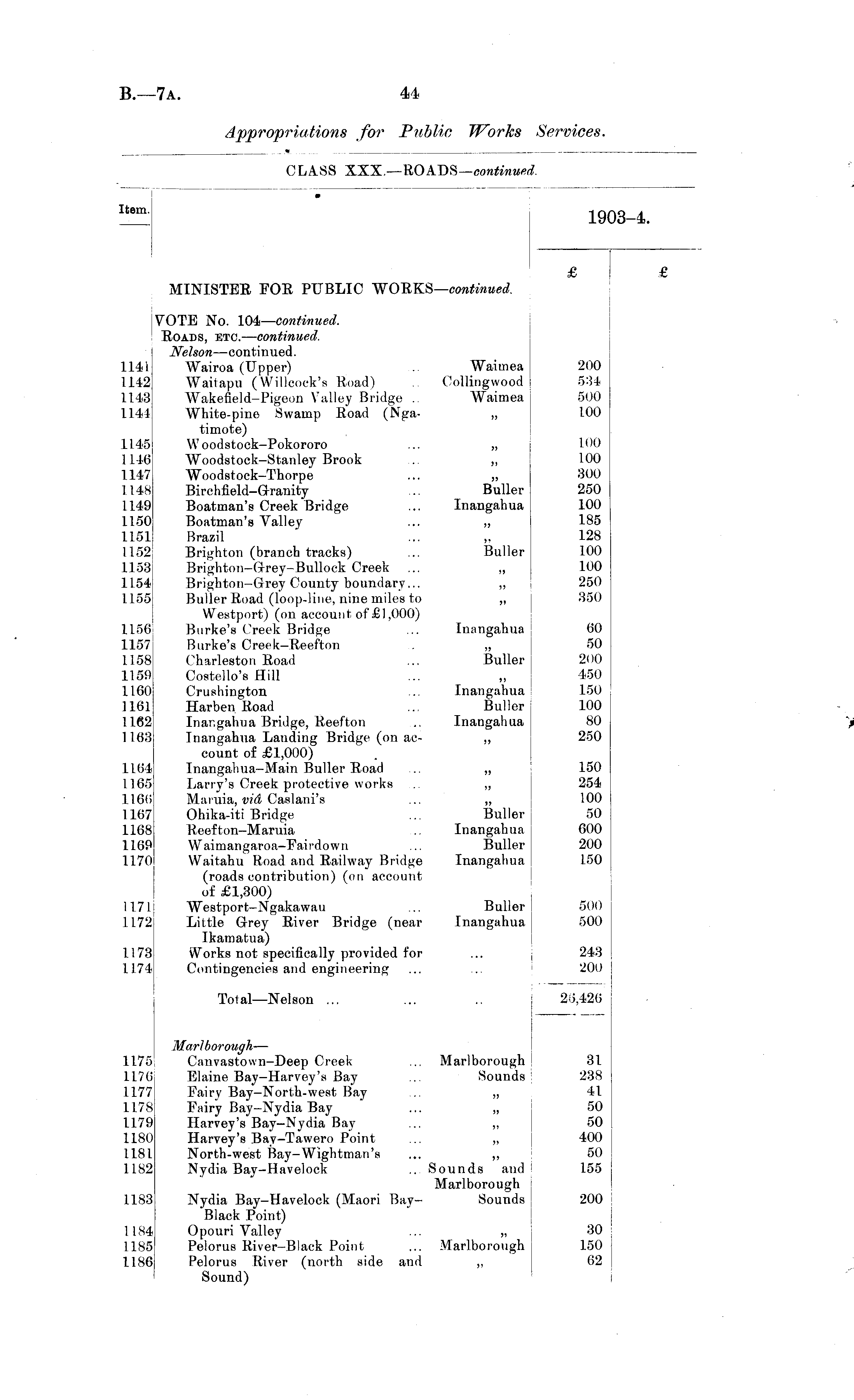 item. • £ 19 i3-4. £ MINISTER FOR PUBLIC WORKS— continued. 1141 1142 1143 1144 1145 1146 1147 1148 1149; 1150J 1151; 1152! 1153 1154! 11551 1156 1157 1158 1159 1160 1161 1162 1163 1141 1142 1143 1144 1145 1146 1147 1148 1149J 1150 1151! 1152 1153J 1154! 11551 1156' 1157 1158 1159 1160 1161 1162 1163 1164 1165 1160 1167 1168 1169 1170 1 1171J 1172 1173 1174 VOTE No. 104— continued. Roads, etc. — continued. Nelson —continued. Wairoa (Upper) ... Waimea Waitapu (Willcock's Road) .. Collingwood Wakefield-Pigeon Valley Bridge .. Waimea White-pine Swamp Road (Nga- „ timote) Woodstock-Pokororo ... „ Woodstock-Stanley Brook ... ,, Woodstock-Thorpe ... „ Birchfield-Granity ... Buller Boatman's Creek Bridge ... Inangahua Boatman's Valley ... „ Brazil ... ,. Brighton (branch tracks) ... Buller Brighton-Grey-Bullock Creek ... „ Brighton-Grey County boundary... ,, Buller Road (loop-line, nine miles to „ Westport) (on account of £1,000) Burke's Creek Bridge ... Inangahua Burke's Creek—Reefton . „ Charleston Road ... Buller Costello's Hill Crushington ... Inangahua Harben Road ... Buller Inangahua Bridge, Reefton ... Inangahua i Inangahua Lauding Bridge (on ac- ,, count of £1,000) 1 Inangabua-Main Buller Road ... „ i Larry's Creek protective works ... ,, 1 Maruia, vid Caslani's ... „ Ohika-iti Bridge ... Buller I Reefton-Maruia ... Inangahua 1 Waimangaroa-Faii'down ... Buller i Waitahu Road and Railway Bridge Inangahua (roads contribution) (on account of £1,300) Westport-Ngakawau ... Buller I Little Grey River Bridge (near Inangahua Ikamatua) I Works not specifically provided for i Contingencies and engineering 200 534 500 100 100 100 300 250 100 185 128 100 100 250 350 60 50 200 450 150 100 80 250 1 1164 1165 1166 1167 1168 1169 1170 s 150 254 100 50 600 200 150 1171 11.72 500 500 1173 1174 243 200 Total —Nelson ... 26,426 26, 1175 1176 1177 1178 1179 1180 1181 1182 1175 1170 1177 1178 1179 1180 1181 1182 1183 1184 1185 1186 Marlborough — >l Canvastown-Deep Creek ... Marlborough I Elaine Bay-Harvey's Bay ... Sounds Fairy Bay-North-west Bay ... „ I Fairy Bay-Nydia Bay ... „ I Harvey's Bay-Nydia Bay ... „ ) Harvey's Bay—Tawero Point ... „ North-west Ray-Wightman's ... ,, ! Nydia Bay-Havelock ... Sounds and Marlborough I Nydia Bay-Havelock (Maori Bay- Sounds Black Point) I Opotiri Valley ... „ i Pelorus River-Black Point ... Marlborough ! Pelorus River (north side and ,, Sound) 31 238 41 50 50 400 50 155 1183 200 1184 1185 1186 30 150 62