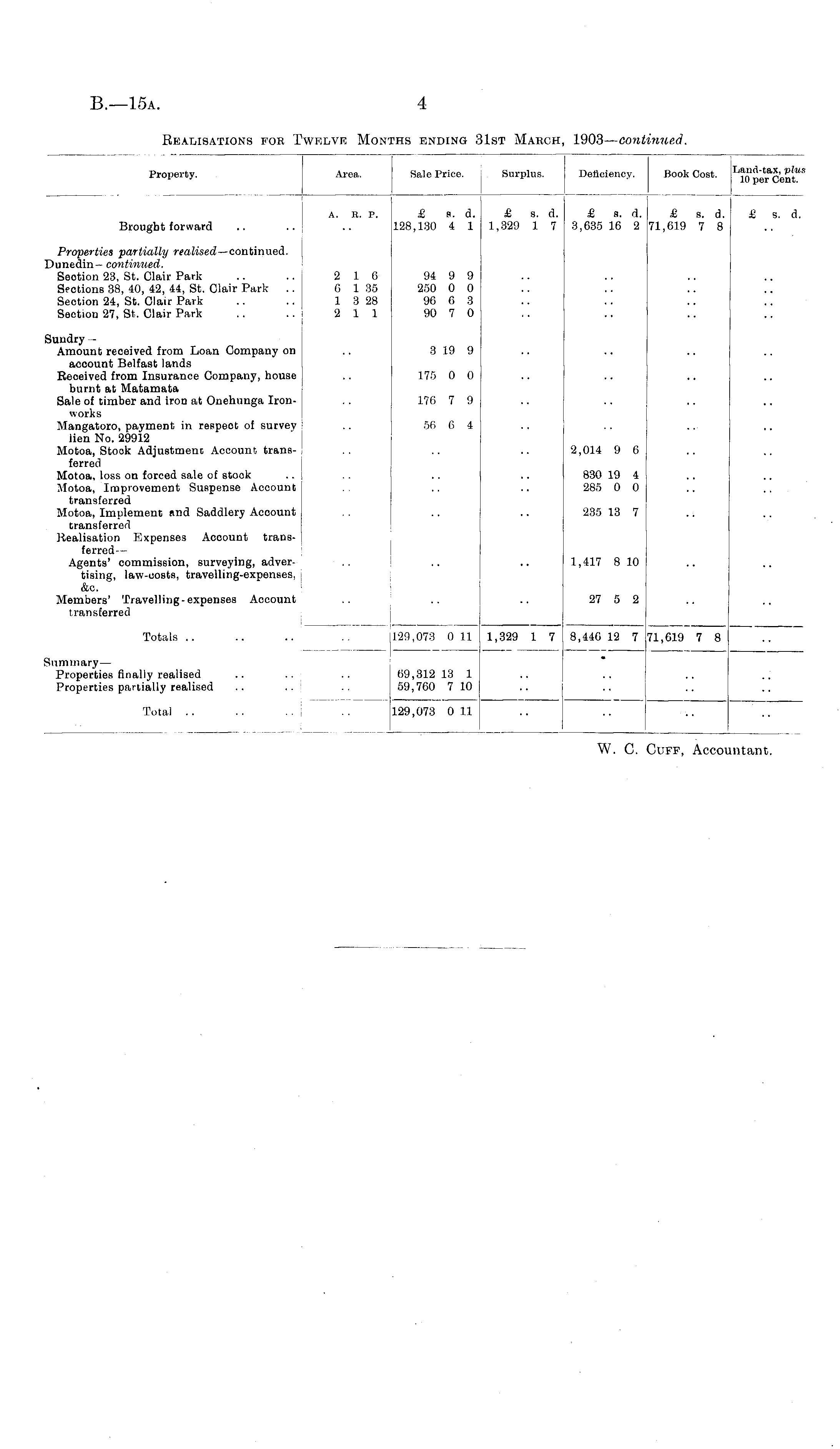 Property. Area. Sale Price. Surplus. Deficiency. Book Cost. iaiid-tax, plus 10 per Cent. Brought forward A. B. P. A. B. P. £ s. d. 128,130 4 1 £ s. d. 1,329 1 7 £ s. d. 3,635 16 2 £ s. d. 71,619 7 8 £ s. d. Properties partially realised— continued. Dunedin— continued. Section 23, St. Clair Park Sections 38, 40, 42, 44, St. Clair Park .. Section 24, St. Olair Park Section 27, St. Clair Park 2 1 6 6 1 35 1 3 28 2 11 2 1 6 6 1 35 1 3 28 2 11 94 9 9 250 0 0 96 6 3 90 7 0 Sundry - Amount received from Loan Company on account Belfast lands Received from Insurance Company, house burnt at Matamata Sale of timber and iron at Onehunga Ironworks Mangatoro, payment in respect of survey lien No. 29912 Motoa, Stock Adjustment Account transferred Motoa, loss on forced sale of stock Motoa, Improvement Suspense Account transferred Motoa, Implement ftnd Saddlery Account transferred Realisation Expenses Account transferred — Agents' commission, surveying, advertising, law-costs, travelling-expenses, &c. Members' Travelling-expenses Account transferred 3 19 9 175 0 0 17G 7 9 56 6 4 2,014 9 6 830 19 4 285 0 0 235 13 7 1,417 8 10 27 5 2 Totals .. 129,073 0 11 1,329 1 7 8,446 12 7 71,019 7 8 Summary— Properties finally realised .. Properties partially realised • 69,312 13 1 59,760 7 10 Total 129,073 0 11