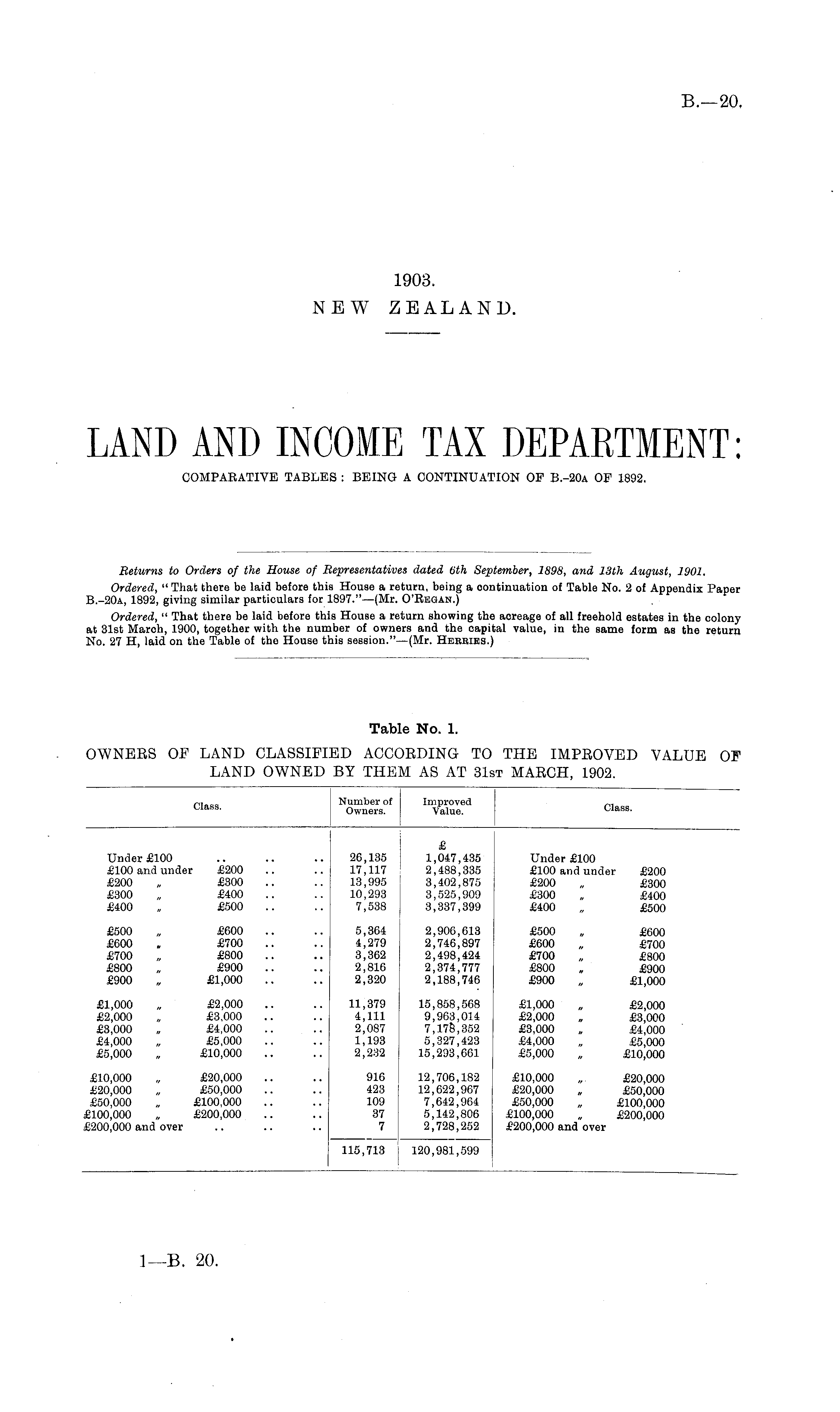 Table No. 1. OWNERS OF LAND CLASSIFIED ACCORDING TO THE IMPROVED VALUE OF LAND OWNED BY THEM AS AT 31st MARCH, 1902.