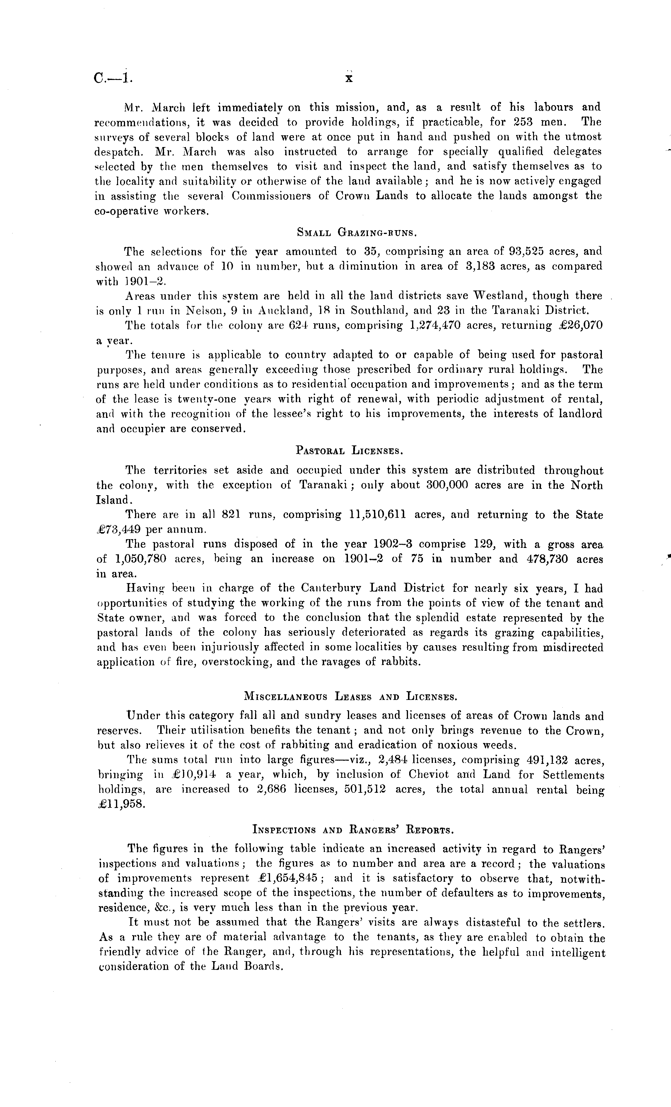 Mr. March left immediately on this mission, and, as a result of his labours and recommendations, it was decided to provide holdings, if practicable, for 253 men. The surveys of several blocks of land were at once put in hand and pushed on with the utmost despatch. Mr. March was also instructed to arrange for specially qualified delegates selected by the men themselves to visit and inspect the land, and satisfy themselves as to the locality and suitability or otherwise of the land available; and he is now actively engaged in assisting the several Commissioners of Crown Lands to allocate the lands amongst the co-operative workers. Small Grazing-runs. The selections for the year amounted to 35, comprising an area of 93,525 acres, and showed an advance of 10 in number, but a diminution in area of 3,183 acres, as compared with 1901-2. Areas under this system are held in all the land districts save Westland, though there is only 1 run in Nelson, 9 in Auckland, 18 in Southland, and 23 in the Taranaki District. The totals for the colony are 624 runs, comprising 1.274,470 acres, returning £26,070 a year. The tenure is applicable to country adapted to or capable of being used for pastoral purposes, and areas generally exceeding those prescribed for ordinary rural holdings. The runs are held under conditions as to residential occupation and improvements ; and as the term of the lease is twenty-one years with right of renewal, with periodic adjustment of rental, and with the recognition of the lessee's right to his improvements, the interests of landlord and occupier are conserved. Pastoral Licenses. The territories set aside and occupied under this system are distributed throughout the colony, with the exception of Taranaki; only about 300,000 acres are in the North Island. There are in all 821 runs, comprising 11,510,611 acres, and returning to the State £73,449 per annum. The pastoral runs disposed of in the year 1902—3 comprise 129, with a gross area of 1,050,780 acres, being an increase on 1901—2 of 75 in number and 478,730 acres in area. Having been in charge of the Canterbury Land District for nearly six years, I had opportunities of studying the working of the runs from the points of view of the tenant and State owner, and was forced to the conclusion that the splendid estate represented by the pastoral lands of the colony has seriously deteriorated as regards its grazing capabilities, and has even been injuriously affected in some localities by causes resulting from misdirected application of fire, overstocking, and the ravages of rabbits. Miscellaneous Leases and Licenses. Under this category fall all and sundry leases and licenses of areas of Crown lands and reserves. Their utilisation benefits the tenant ; and not only brings revenue to the Crown, but also relieves it of the cost of rabbiting and eradication of noxious weeds. The sums total run into large figures—viz., 2,484 licenses, comprising 491,132 acres, bringing in £10,914 a year, which, by inclusion of Cheviot and Land for Settlements holdings, are increased to 2,686 licenses, 501,512 acres, the total annual rental being £11,958. Inspections and Rangers' Reports. The figures in the following table indicate an increased activity in regard to Rangers' inspections and valuations; the figures as to number and area are a record ; the valuations of improvements represent £1,654,845 : and it is satisfactory to observe that, notwithstanding the increased scope of the inspections, the number of defaulters as to improvements, residence, &c, is very much less than in the previous year. It must not be assumed that the Rangers' visits are always distasteful to the settlers. As a rule they are of material advantage to the tenants, as they are enabled to obtain the friendly advice of the Ranger, and, through his representations, the helpful and intelligent consideration of the Land Boards.