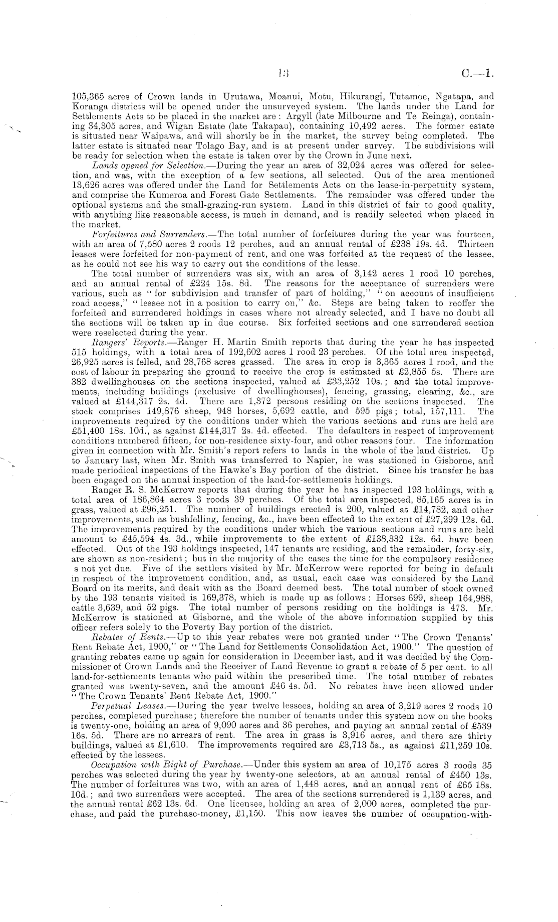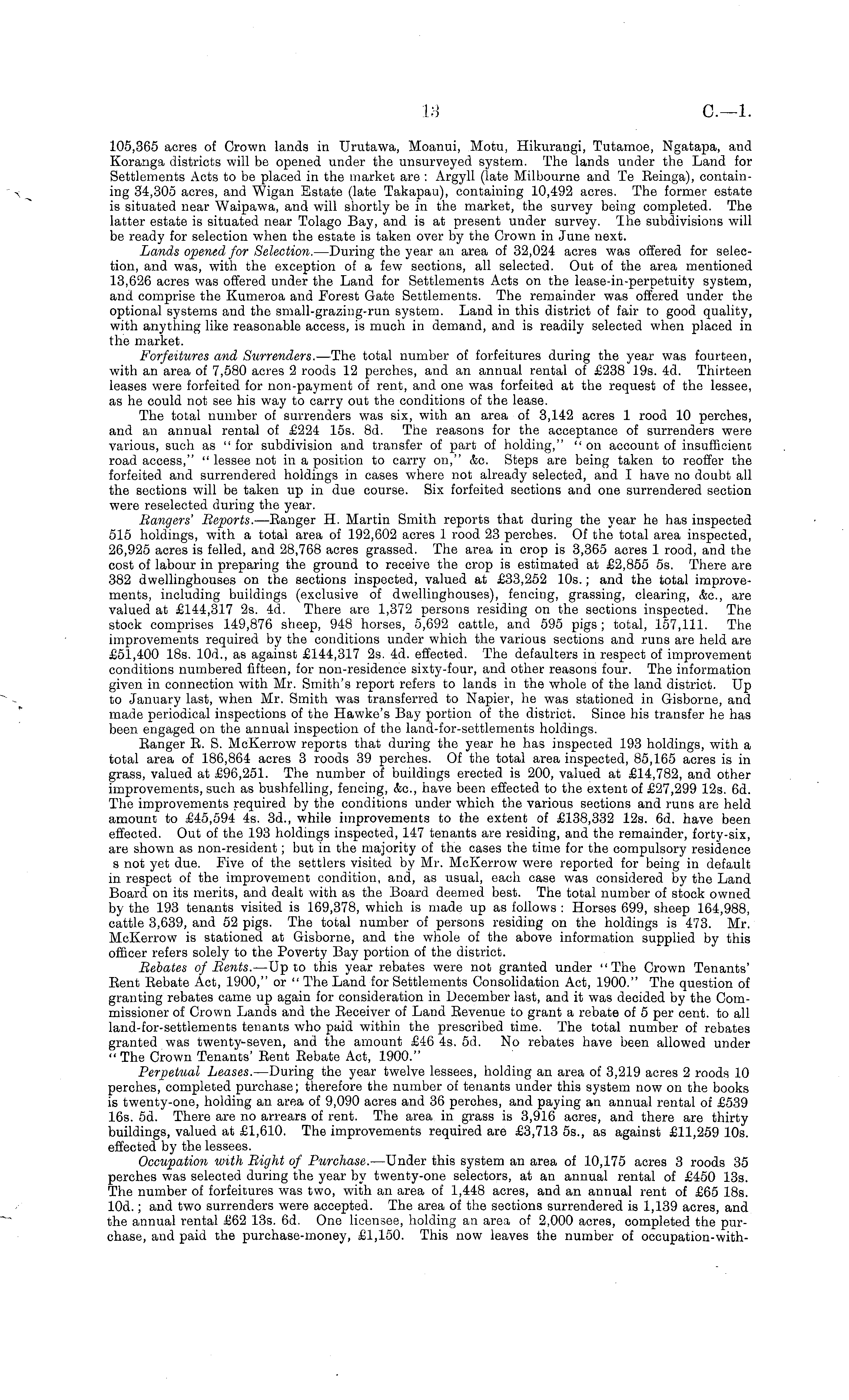 105,365 acres of Crown lands in Urutawa, Moanui, Motu, Hikurangi, Tutamoe, Ngatapa, and Koranga districts will be opened under the unsurveyed system. The lands under the Land for Settlements Acts to be placed in the market are : Argyll (late Milbourne and Te Reinga), containing 34,305 acres, and Wigan Estate (late Takapau), containing 10,492 acres. The former estate is situated near Waipawa, and will shortly be in the market, the survey being completed. The latter estate is situated near Tolago Bay, and is at present under survey. The subdivisions will be ready for selection when the estate is taken over by the Crown in June next. Lands opened for Selection. —During the year an area of 32,024 acres was offered for selection, and was, with the exception of a few sections, all selected. Out of the area mentioned 13,626 acres was offered under the Land for Settlements Acts on the lease-in-perpetuity system, and comprise the Kumeroa and Forest Gate Settlements. The remainder was offered under the optional systems and the small-grazing-run system. Land in this district of fair to good quality, with anything like reasonable access, is much in demand, and is readily selected when placed in the market. Forfeitures and Surrenders. —The total number of forfeitures during the year was fourteen, with an area of 7,580 acres 2 roods 12 perches, and an annual rental of £238 19s. 4d. Thirteen leases were forfeited for non-payment of rent, and one was forfeited at the request of the lessee, as he could not see his way to carry out the conditions of the lease. The total number of surrenders was six, with an area of 3,142 acres 1 rood 10 perches, and an annual rental of £224 15s. Bd. The reasons for the acceptance of surrenders were various, such as "for subdivision and transfer of part of holding," "on account of insufficient road access," " lessee not in a position to carry on," &c. Steps are being taken to reoffer the forfeited and surrendered holdings in cases where not already selected, and I have no doubt all the sections will be taken up in due course. Six forfeited sections and one surrendered section were reselected during the year. Rangers' Reports. —Ranger H. Martin Smith reports that during the year he has inspected 515 holdings, with a total area of 192,602 acres 1 rood 23 perches. Of the total area inspected, 26,925 acres is felled, and 28,768 acres grassed. The area in crop is 3,365 acres 1 rood, and the cost of labour in preparing the ground to receive the crop is estimated at £2,855 ss. There are 382 dwellinghouses on the sections inspected, valued at £33,252 10s.; and the total improvements, including buildings (exclusive of dwellinghouses), fencing, grassing, clearing, &c, are valued at £144,317 2s. 4d. There are 1,372 persons residing on the sections inspected. The stock comprises 149,876 sheep, 948 horses, 5,692 cattle, and 595 pigs ; total, 157,111. The improvements required by the conditions under which the various sections and runs are held are £51,400 18s. 10d., as against £144,317 2s. 4d. effected. The defaulters in respect of improvement conditions numbered fifteen, for non-residence sixty-four, and other reasons four. The information given in connection with Mr. Smith's report refers to lands in the whole of the land district. Up to January last, when Mr. Smith was transferred to Napier, he was stationed in Gisborne, and made periodical inspections of the Hawke's Bay portion of the district. Since his transfer he has been engaged on the annual inspection of the land-for-settlements holdings. Ranger R. S. McKerrow reports that during the year he has inspected 193 holdings, with a total area of 186,864 acres 3 roods 39 perches. Of the total area inspected, 85,165 acres is in grass, valued at £96,251. The number of buildings erected is 200, valued at £14,782, and other improvements, such as bushfelling, fencing, &c, have been effected to the extent of £27,299 12s. 6d. The improvements required by the conditions under which the various sections and runs are held amount to £45,594 4s. 3d., while improvements to the extent of £138,332 12s. 6d. have been effected. Out of the 193 holdings inspected, 147 tenants are residing, and the remainder, forty-six, are shown as non-resident; but in the majority of the cases the time for the compulsory residence s not yet due. Five of the settlers visited by Mr. McKerrow were reported for being in default in respect of the improvement condition, and, as usual, each case was considered by the Land Board on its merits, and dealt with as the Board deemed best. The total number of stock owned by the 193 tenants visited is 169,378, which is made up as follows : Horses 699, sheep 164,988, cattle 3,639, and 52 pigs. The total number of persons residing on the holdings is 473. Mr. McKerrow is stationed at Gisborne, and the whole of the above information supplied by this officer refers solely to the Poverty Bay portion of the district. Rebates of Rents. —Up to this year rebates were not granted under "The Crown Tenants' Rent Rebate Act, 1900," or " The Land for Settlements Consolidation Act, 1900." The question of granting rebates came up again for consideration in December last, and it was decided by the Commissioner of Crown Lands and the Receiver of Land Revenue to grant a rebate of 5 per cent, to all land-for-settlements tenants who paid within the prescribed time. The total number of rebates granted was twenty-seven, and the amount £46 4s. sd. No rebates have been allowed under " The Crown Tenants' Rent Rebate Act, 1900." Perpetual Leases. —During the year twelve lessees, holding an area of 3,219 acres 2 roods 10 perches, completed purchase; therefore the number of tenants under this system now on the books is twenty-one, holding an area of 9,090 acres and 36 perches, and paying an annual rental of £539 16s. sd. There are no arrears of rent. The area in grass is 3,916 acres, and there are thirty buildings, valued at £1,610. The