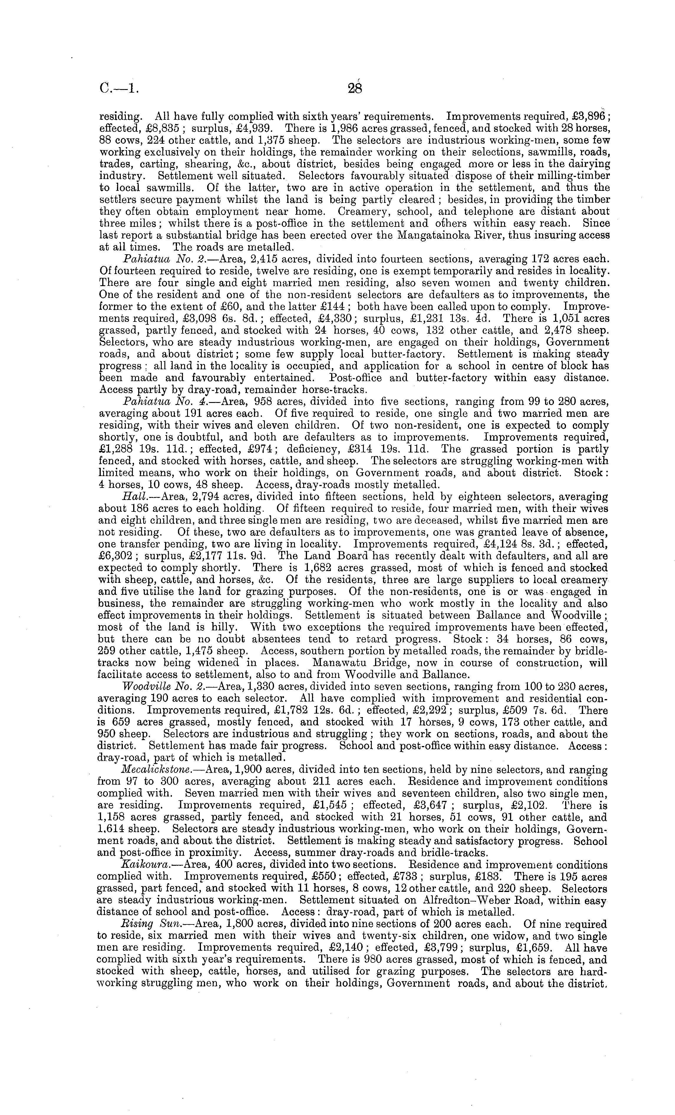 residing. All have fully complied with sixth years' requirements. Improvements required, £3,896 ; effected, £8,835 ; surplus, £4,939. There is 1,986 acres grassed, fenced, and stocked with 28 horses, 88 cows, 224 other cattle, and 1,375 sheep. The selectors are industrious working-men, some few working exclusively on their holdings, the remainder working on their selections, sawmills, roads, trades, carting, shearing, &c, about district, besides being engaged more or less in the dairying industry. Settlement well situated. Selectors favourably situated dispose of their milling-timber to local sawmills. Of the latter, two are in active operation in the settlement, and thus the settlers secure payment whilst the land is being partly cleared ; besides, in providing the timber they often obtain employment near home. Creamery, school, and telephone are distant about three miles; whilst there is a post-office in the settlement and others within easy reach. Since last report a substantial bridge has been erected over the Mangatainoka River, thus insuring access at all times. The roads are metalled. Pahiatua No. 2. —Area, 2,415 acres, divided into fourteen sections, averaging 172 acres each. Of fourteen required to reside, twelve are residing, one is exempt temporarily and resides in locality. There are four single and eight married men residing, also seven women and twenty children. One of the resident and one of the non-resident selectors are defaulters as to improvements, the former to the extent of £60, and the latter £144 ; both have been called upon to comply. Improvements required, £3,098 6s. Bd.; effected, £4,330; surplus, £1,231 13s. 4d. There is 1,051 acres grassed, partly fenced, and stocked with 24 horses, 40 cows, 132 other cattle, and 2,478 sheep. Selectors, who are steady industrious working-men, are engaged on their holdings, Government roads, and about district; some few supply local butter-factory. Settlement is making steady progress ; all land in the locality is occupied, and application for a school in centre of block has been made and favourably entertained. Post-office and butter-factory within easy distance. Access partly by dray-road, remainder horse-tracks. Pahiatua No. 4. —Area, 958 acres, divided into five sections, ranging from 99 to 280 acres, averaging about 191 acres each. Of five required to reside, one single and two married men are residing, with their wives and eleven children. Of two non-resident, one is expected to comply shortly, one is doubtful, and both are defaulters as to improvements. Improvements required, £1,288 19s. lid.; effected, £974; deficiency, £314 19s. lid. The grassed portion is partly fenced, and stocked with horses, cattle, and sheep. The selectors are struggling working-men with limited means, who work on their holdings, on Government roads, and about district. Stock : 4 horses, 10 cows, 48 sheep. Access, dray-roads mostly metalled. Hall. —Area, 2,794 acres, divided into fifteen sections, held by eighteen selectors, averaging about 186 acres to each holding. Of fifteen required to reside, four married men, with their wives and eight children, and three single men are residing, two are deceased, whilst five married men are not residing. Of these, two are defaulters as to improvements, one was granted leave of absence, one transfer pending, two are living in locality. Improvements required, £4,124 Bs. 3d.; effected, £6,302 ; surplus, £2,177 lis. 9d. The Land Board has recently dealt with defaulters, and all are expected to comply shortly. There is 1,682 acres grassed, most of which is fenced and stocked with sheep, cattle, and horses, &c. Of the residents, three are large suppliers to local creamery and five utilise the land for grazing purposes. Of the non-residents, one is or was engaged in business, the remainder are struggling working-men who work mostly in the locality and also effect improvements in their holdings. Settlement is situated between Ballance and Woodville ; most of the land is hilly. With two exceptions the required improvements have been effected, but there can be no doubt absentees tend to retard progress. Stock: 34 horses, 86 cows, 259 other cattle, 1,475 sheep. Access, southern portion by metalled roads, the remainder by bridletracks now being widened in places. Manawatu Bridge, now in course of construction, will facilitate access to settlement, also to and from Woodville and Ballance. Woodville No. 2. —Area, 1,330 acres, divided into seven sections, ranging from 100 to 230 acres, averaging 190 acres to each selector. All have complied with improvement and residential conditions. Improvements required, £1,782 12s. 6d. ; effected, £2,292 ; surplus, £509 7s. 6d. There is 659 acres grassed, mostly fenced, and stocked with 17 horses, 9 cows, 173 other cattle, and 950 sheep. Selectors are industrious and struggling ; they work on sections, roads, and about the district. Settlement has made fair progress. School and post-office within easy distance. Access : dray-road, part of which is metalled. Mecalickstone. —Area, 1,900 acres, divided into ten sections, held by nine selectors, and ranging from 97 to 300 acres, averaging about 211 acres each. Residence and improvement conditions complied with. Seven married men with their wives and seventeen children, also two single men, are residing. Improvements required, £1,545 ; effected, £3,647 ; surplus, £2,102. There is 1,158 acres grassed, partly fenced, and stocked with 21 horses, 51 cows, 91 other cattle, and 1,614 sheep. Selectors are steady industrious working-men, who work on their holdings, Government roads, and about, the district. Settlement is making steady and satisfactory progress. School and post-office in proximity. Access, summer dray-roads and bridle-tracks. Kaikoura. —Area, 400 acres, divided into two sections. Residence and improvement conditions complied with. Improvements required, £550; effected, £733 ; surplus, £183. There 