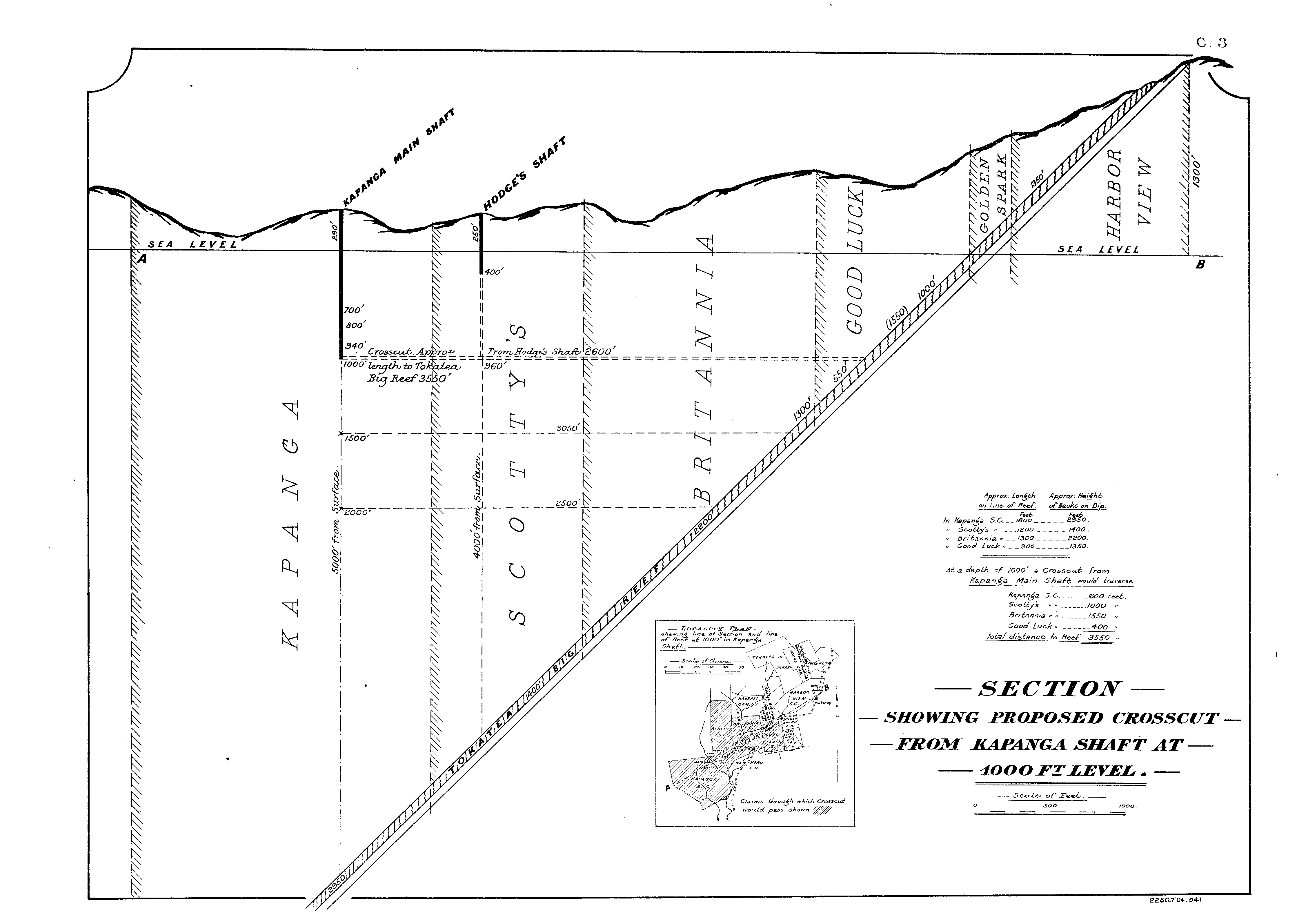 SECTION SHOWING PROPOSED CROSSCUT FROM KAPANGA SHAFT AT 1000FT LEVEL.