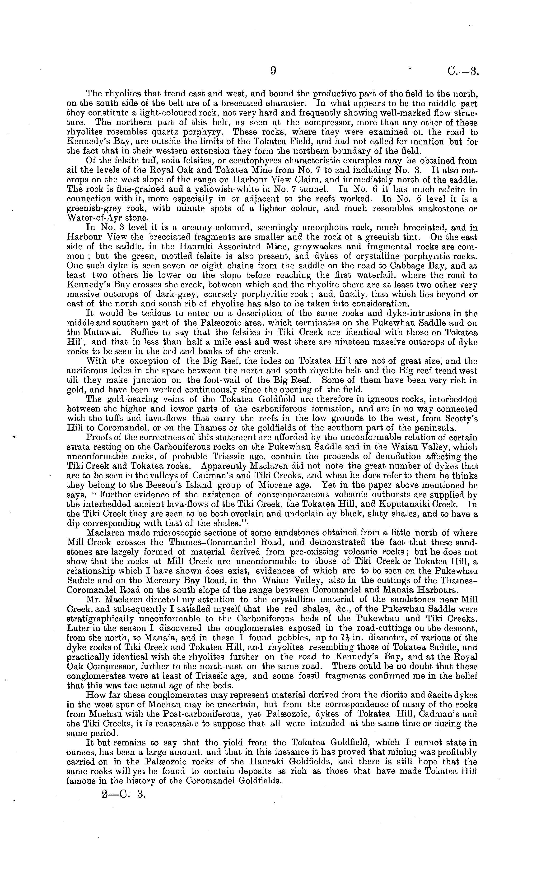 The rhyolites that trend east and west, and bound the productive part of the field to the north, on the south side of the belt are of a breeeiated character. In what appears to be the middle part they constitute a light-coloured rock, not very hard and frequently showing well-marked flow structure. The northern part of this belt, as seen at the compressor, more than any other of these rhyolites resembles quartz porphyry. These rocks, where they were examined on the road to Kennedy's Bay, are outside the limits of the Tokatea Field, and had not called for mention but for the fact that in their western extension they form the northern boundary of the field. Of the felsite tuff, soda felsites, or ceratophyres characteristic examples may be obtained from all the levels of the Eoyal Oak and Tokatea Mine from No. 7to and including No. 3. It also outcrops on the west slope of the range on Harbour View Claim, and immediately north of the saddle. The rock is fine-grained and a yellowish-white in No. 7 tunnel. In No. 6it has much ealcite in connection with it, more especially in or adjacent to the reefs worked. In No. 5 level it is a greenish-grey rock, with minute spots of a lighter colour, and much resembles snakestone or Water-of-Ayr stone. In No. 3 level it is a creamy-coloured, seemingly amorphous rock, much breeeiated, and in Harbour View the breeeiated fragments are smaller and the rock of a greenish tint. On the east side of the saddle, in the Hauraki Associated Mine, greywackes and fragmental rocks are common ; but the green, mottled felsite is also present, and dykes of crystalline porphyritic rocks. One such dyke is seen seven or eight chains from the saddle on the road to Cabbage Bay, and at least two others lie lower on the slope before reaching the first waterfall, where the road to Kennedy's Bay crosses the creek, between which and the rhyolite there are at least two other very massive outcrops of dark-grey, coarsely porphyritic rock ; and, finally, that which lies beyond or east of the north and south rib of rhyolite has also to be taken into consideration. It would be tedious to enter on a description of the same rocks and dyke-intrusions in the middle and southern part of the Palaeozoic area, which terminates on the Pukewhau Saddle and on the Matawai. Suffice to say that the felsites in Tiki Creek are identical with those on Tokatea Hill, and that in less than half a mile east and west there are nineteen massive outcrops of dyke rocks to be seen in the bed and banks of the creek. With the exception of the Big Eeef, the lodes on Tokatea Hill are not of great size, and the auriferous lodes in the space between the north and south rhyolite belt and the Big reef trend west till they make junction on the foot-wall of the Big Eeef. Some of them have been very rich in gold, and have been worked continuously since the opening of the field. The gold-bearing veins of the Tokatea Goldfield are therefore in igneous rocks, interbedded between the higher and lower parts of the carboniferous formation, and are in no way connected with the tuffs and lava-flows that carry the reefs in the low grounds to the west, from Scotty's Hill to Coromandel, or on the Thames or the goldfields of the southern part of the peninsula. Proofs of the correctness of this statement are afforded by the unconforrnable relation of certain strata resting on the Carboniferous rocks on the Pukewhau Saddle and in the Waiau Valley, which unconformable rocks, of probable Triassic age, contain the proceeds of denudation affecting the Tiki Creek and Tokatea rocks. Apparently Maclaren did not note the great number of dykes that are to be seen in the valleys of Cadman's and Tiki Creeks, and when he does refer to them he thinks they belong to the Beeson's Island group of Miocene age. Yet in the paper above mentioned he says, " Further evidence of the existence of contemporaneous volcanic outbursts are supplied by the interbedded ancient lava-flows of the Tiki Creek, the Tokatea Hill, and Koputanaiki Creek. In the Tiki Creek they are seen to be both overlain and underlain by black, slaty shales, and to have a, dip corresponding with that of the shales." Maclaren made microscopic sections of some sandstones obtained from a little north of where Mill Creek crosses the Thames-Coromandel Eoad, and demonstrated the fact that these sandstones are largely formed of material derived from pre-existing volcanic rocks ; but he does not show that the rocks at Mill Creek are unconformable to those of Tiki Creek or Tokatea Hill, a relationship which I have shown does exist, evidences of which are to be seen on the Pukewhau Saddle and on the Mercury Bay Eoad, in the Waiau Valley, also in the cuttings of the ThamesCoromandel Eoad on the south slope of the range between Coromandel and Manaia Harbours. Mr. Maclaren directed my attention to the crystalline material of the sandstones near Mill Creek, and subsequently I satisfied myself that the red shales, &c, of the Pukewhau Saddle were stratigraphically unconformable to the Carboniferous beds of the Pukewhau and Tiki Creeks. Later in the season I discovered the conglomerates exposed in the road-cuttings on the descent, from the north, to Manaia, and in these I found pebbles, up to 1|- in. diameter, of various of the dyke rocks of Tiki Creek and Tokatea Hill, and rhyolites resembling those of Tokatea Saddle, and practically identical with the rhyolites further on the road to Kennedy's Bay, and at the Eoyal Oak Compressor, further to the north-east on the same road. There could be no doubt that these conglomerates were at least of Triassic age, and some fossil fragments confirmed me in the belief that this was the actual age of the beds. How far these conglomerates may represent material derived from the diorite and dacite dykes in the west spur of Moehau may be uncertain, but from the correspondence of many of the rocks from Moehau with the Post-carboniferous, yet Palaeozoic, dykes of Tokatea Hill, 