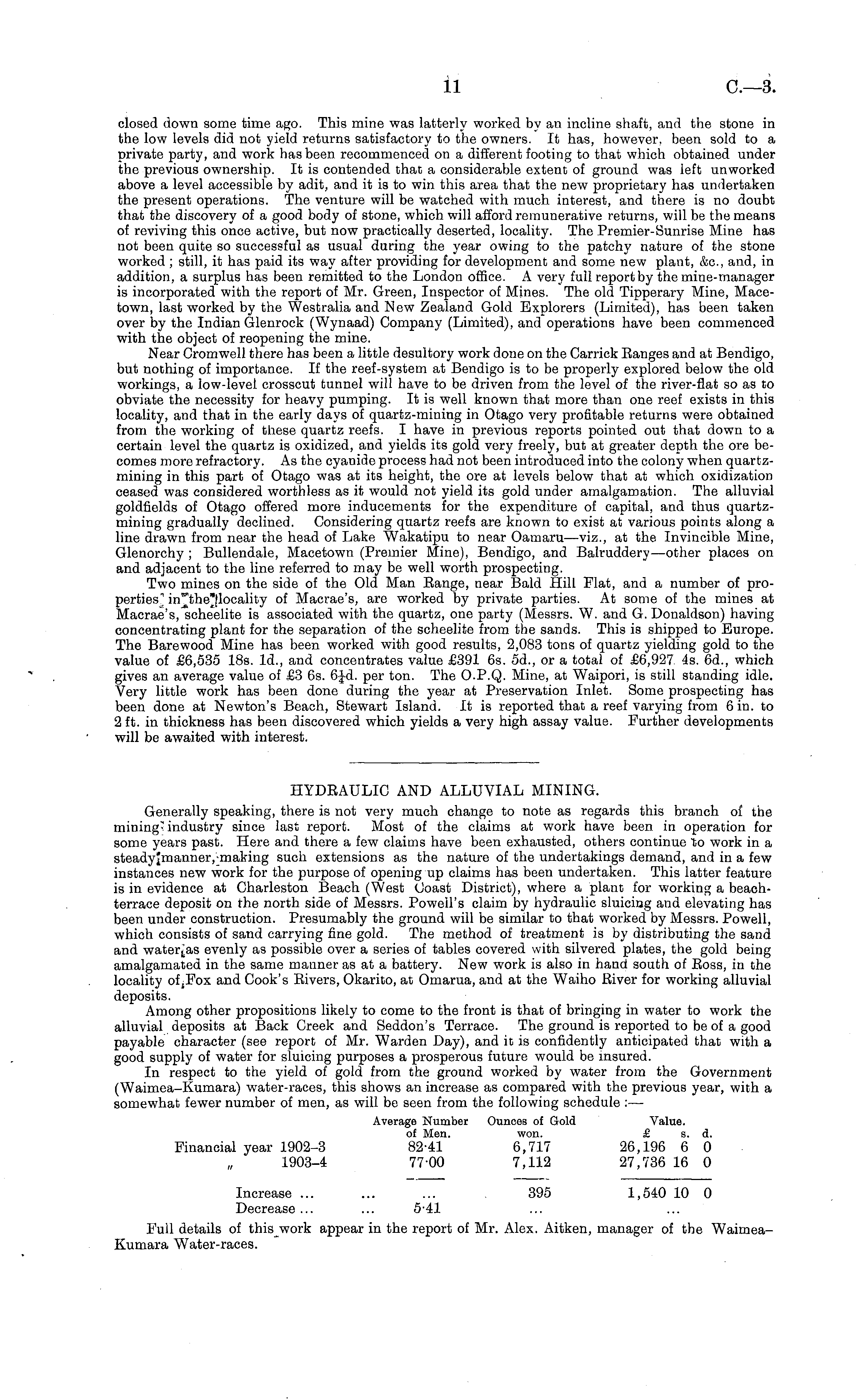 HYDEAULIC AND ALLUVIAL MINING. Generally speaking, there is not very much change to note as regards this branch of the mining- industry since last report. Most of the claims at work have been in operation for some years past. Here and there a few claims have been exhausted, others continue to work in a steady^manner, -making such extensions as the nature of the undertakings demand, and in a few instances new work for the purpose of opening up claims has been undertaken. This latter feature is in evidence at Charleston Beach (West (Joast District), where a plant for working a beachterrace deposit on the north side of Messrs. Powell's claim by hydraulic sluicing and elevating has been under construction. Presumably the ground will be similar to that worked by Messrs. Powell, which consists of sand carrying fine gold. The method of treatment is by distributing the sand and evenly as possible over a series of tables covered with silvered plates, the gold being amalgamated in the same manner as at a battery. New work is also in hand south of Ross, in the locality olFox and Cook's Rivers, Okarito, at Omarua, and at the Waiho River for working alluvial deposits. Among other propositions likely to come to the front is that of bringing in water to work the alluvial deposits at Back Creek and Seddon's Terrace. The ground is reported to be of a good payable character (see report of Mr. Warden Day), and it is confidently anticipated that with a good supply of water for sluicing purposes a prosperous future would be insured. In respect to the yield of gold from the ground worked by water from the Government (Waimea-Kumara) water-races, this shows an increase as compared with the previous year, with a somewhat fewer number of men, as will be seen from the following schedule :— Average Number Ounces of Gold Value. of Men. won. £ s. d. Financial year 1902-3 82-41 6,717 26,196 6 0 1903-4 77-00 7,112 27,736 16 0 Increase ... ... ... 395 1,540 10 0 Decrease ... ... 5-41 Full details of this work appear in the report of Mr. Alex. Aitken, manager of the WaimeaKumara Water-races.