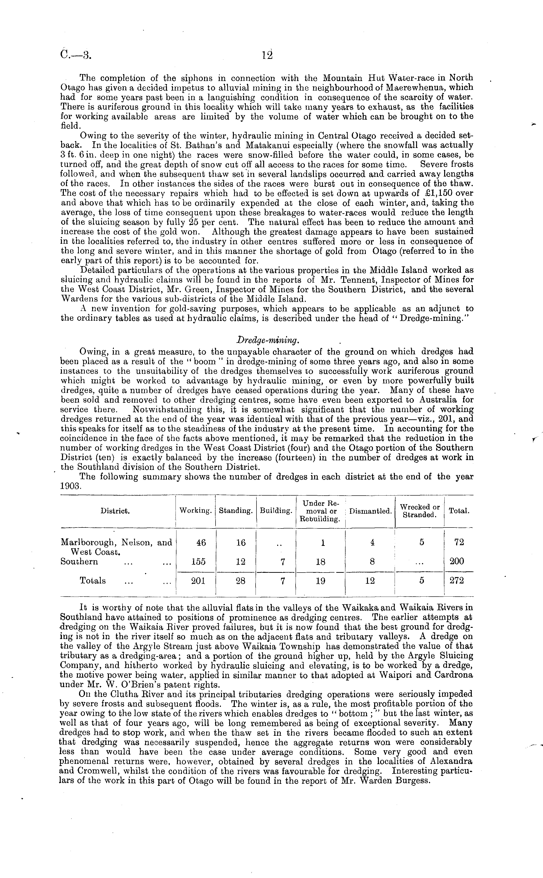 The completion of the siphons in connection with the Mountain Hut Water-race in North Otago has given a decided impetus to alluvial mining in the neighbourhood of Maerewhenua, which had for some years past been in a languishing condition in consequence of the scarcity of water. There is auriferous ground in this locality which will take many years to exhaust, as the facilities for working available areas are limited by the volume of water which can be brought on to the field. Owing to the severity of the winter, hydraulic mining in Central Otago received a decided setback. In the localities of St. Bathan's and Matakanui especially (where the snowfall was actually 3 ft. 6 in. deep in one night) the races were snow-filled before the water could, in some cases, be turned off, and the great depth of snow cut oft' all access to the races for some time. Severe frosts followed, and when the subsequent thaw set in several landslips occurred and carried away lengths of the races. In other instances the sides of the races were burst out in consequence of the thaw. The cost of the necessary repairs which had to be effected is set down at upwards of £1,150 over and above that which has to be ordinarily expended at the close of each winter, and, taking the average, the loss of time consequent upon these breakages to water-races would reduce the length of the sluicing season by fully 25 per cent. The natural effect has been to reduce the amount and increase the cost of the gold won. Although the greatest damage appears to have been sustained in the localities referred to, the industry in other centres suffered more or less in consequence of the long and severe winter, and in this manner the shortage of gold from Otago (referred to in the early part of this report) is to be accounted for. Detailed particulars of the operations at the various properties in the Middle Island worked as sluicing and hydraulic claims will be found in the reports of Mr. Tennent, Inspector of Mines for the West Coast District, Mr. Green, Inspector of Mines for the Southern District, and the several Wardens for the various sub-districts of the Middle Island. A new invention for gold-saving purposes, which appears to be applicable as an adjunct to the ordinary tables as used at hydraulic claims, is described under the head of " Dredge-mining." Dredge-mining. Owing, in a great measure, to the unpayable character of the ground on which dredges had been placed as a result of the " boom " in dredge-mining of some three years ago, and also in some instances to the uusuitability of the dredges themselves to successfully work auriferous ground which might be worked to advantage by hydraulic mining, or even by more powerfully built dredges, quite a number of dredges have ceased operations during the year. Many of these have been sold and removed to other dredging centres, some have even been exported to Australia for service there. Notwithstanding this, it is somewhat significant that the number of working dredges returned at the end of the year was identical with that of the previous year—viz., 201, and this speaks for itself as to the steadiness of the industry at the present time. In accounting for the coincidence in the face of the facts above mentioned, it may be remarked that the reduction in the number of working dredges in the West Coast District (four) and the Otago portion of the Southern District (ten) is exactly balanced by the increase (fourteen) in the number of dredges at work in the Southland division of the Southern District. The following summary shows the number of dredges in each district at the end of the year 1903.