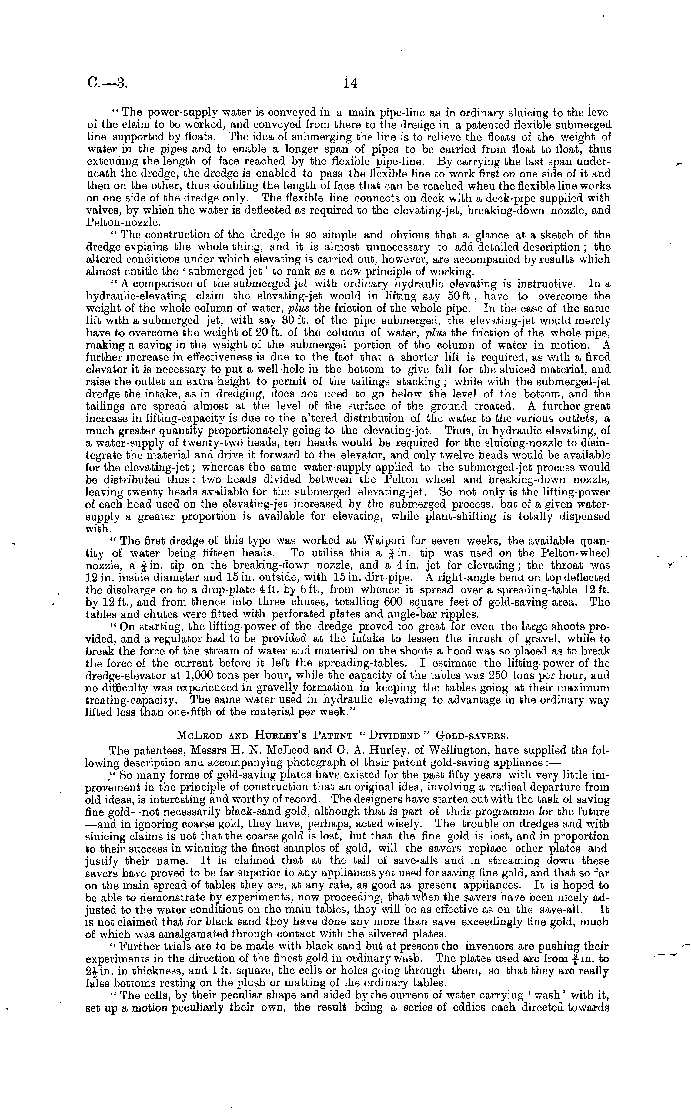 " The power-supply water is conveyed in a main pipe-line as in ordinary sluicing to the leve of the claim to be worked, and conveyed from there to the dredge in a patented flexible submerged line supported by floats. The idea of submerging the line is to relieve the floats of the weight of water in the pipes and to enable a longer span of pipes to be carried from float to float, thus extending the length of face reached by the flexible pipe-line. By carrying the last span underneath the dredge, the dredge is enabled to pass the flexible line to work first on one side of it and then on the other, thus doubling the length of face that can be reached when the flexible line works on one side of the dredge only. The flexible line connects on deck with a deck-pipe supplied with valves, by which the water is deflected as required to the elevating-jet, breaking-down nozzle, and Pelton-nozzle. " The construction of the dredge is so simple and obvious that a glance at a sketch of the dredge explains the whole thing, and it is almost unnecessary to add detailed description ; the altered conditions under which elevating is carried out, however, are accompanied by results which almost entitle the ' submerged jet' to rank as a new principle of working. " A comparison of the submerged jet with ordinary hydraulic elevating is instructive. In a hydraulic-elevating claim the elevating-jet would in lifting say 50 ft., have to overcome the weight of the whole column of water, plus the friction of the whole pipe. In the case of the same lift with a submerged jet, with say 30 ft. of the pipe submerged, the elevating-jet would merely have to overcome the weight of 20 ft. of the column of water, phis the friction of the whole pipe, making a saving in the weight of the submerged portion of the column of water in motion. A further increase in effectiveness is due to the fact that a shorter lift is required, as with a fixed elevator it is necessary to put a well-hole in the bottom to give fall for the sluiced material, and raise the outlet an extra height to permit of the tailings stacking ; while with the submerged-jet dredge the intake, as in dredging, does not need to go below the level of the bottom, and the tailings are spread almost at the level of the surface of the ground treated. A further great increase in lifting-capacity is due to the altered distribution of the water to the various outlets, a much greater quantity proportionately going to the elevating-jet. Thus, in hydraulic elevating, of a water-supply of twenty-two heads, ten heads would be required for the sluicing-nozzle to disintegrate the material and drive it forward to the elevator, and only twelve heads would be available for the elevating-jet; whereas the same water-supply applied to the submerged-jet process would be distributed thus: two heads divided between the Pelton wheel and breaking-down nozzle, leaving twenty heads available for the submerged elevating-jet. So not only is the lifting-power of each head used on the elevating-jet increased by the submerged process, but of a given watersupply a greater proportion is available for elevating, while plant-shifting is totally dispensed with. " The first dredge of this type was worked at Waipori for seven weeks, the available quantity of water being fifteen heads. To utilise this a fin. tip was used on the Pelton-wheel nozzle, a fin. tip on the breaking-down nozzle, and a 4 in. jet for elevating; the throat was 12 in. inside diameter and 15 in. outside, with 15 in. dirt-pipe. A right-angle bend on top deflected the discharge on to a drop-plate 4 ft. by 6 ft., from whence it spread over a spreading-table 12 ft. by 12 ft., and from thence into three chutes, totalling 600 square feet of gold-saving area. The tables and chutes were fitted with perforated plates and angle-bar ripples. " On starting, the lifting-power of the dredge proved too great for even the large shoots provided, and a regulator had to be provided at the intake to lessen the inrush of gravel, while to break the force of the stream of water and material on the shoots a hood was so placed as to break the force of the current before it left the spreading-tables. I estimate the lifting-power of the dredge-elevator at 1,000 tons per hour, while the capacity of the tables was 250 tons per hour, and no difficulty was experienced in gravelly formation in keeping the tables going at their maximum treating-capacity. The same water used in hydraulic elevating to advantage in the ordinary way lifted less than one-fifth of the material per week." McLeod and Hubley's Patent " Dividend " Gold-savers. The patentees, Messrs H.N. McLeod and G. A. Hurley, of Wellington, have supplied the following description and accompanying photograph of their patent gold-saving appliance:— ." So many forms of gold-saving plates have existed for the past fifty years with very little improvement in the principle of construction that an original idea, involving a radical departure from old ideas, is interesting and worthy of record. The designers have started out with the task of saving fine gold—not necessarily black-sand gold, although that is part of their programme for the future ■ —and in ignoring coarse gold, they have, perhaps, acted wisely. The trouble on dredges and with sluicing claims is not that the coarse gold is lost, but that the fine gold is lost, and in proportion to their success in winning the finest samples of gold, will the savers replace other plates and justify their name. It is claimed that at the tail of save-alls and in streaming down these savers have proved to be far superior to any appliances yet used for saving fine gold, and that so far on the main spread of tables they are, at any rate, as good as present appliances. It is hoped to be able to demonstrate by experiments, now proceeding, that when the savers have been nicely adjusted to the water conditions on the main tables, they will be as effective as on the save-all. 
