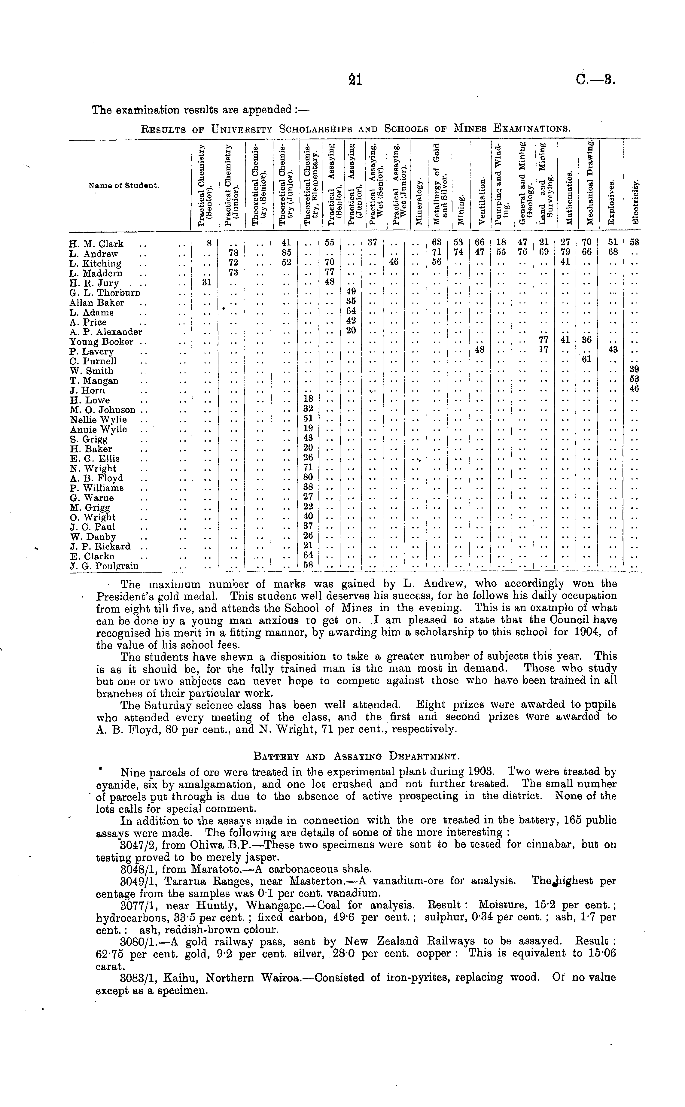 The maximum number of marks was gained by L. Andrew, who accordingly won the • President's gold medal. This student well deserves his success, for he follows his daily occupation from eight till five, and attends the School of Mines in the evening. This is an example of what can be done by a young man anxious to get on. .1 am pleased to state that the Council have recognised his merit in a fitting manner, by awarding him a scholarship to this school for 1904, of the value of his school fees. The students have shewn a disposition to take a greater number of subjects this year. This is as it should be, for the fully trained man is the man most in demand. Those who study but one or two subjects can never hope to compete against those who have been trained in all branches of their particular work. The Saturday science class has been well attended. Eight prizes were awarded to pupils who attended every meeting of the class, and the first and second prizes were awarded to A. B. Floyd, 80 per cent., and N. Wright, 71 per cent., respectively. Battery and Assaying Depaetjvient. Nine parcels of ore were treated in the experimental plant during 1903. Two were treated by cyanide, six by amalgamation, and one lot crushed and not further treated. The small number of parcels put through is due to the absence of active prospecting in the district. None of the lots calls for special comment. In addition to the assays made in connection with the ore treated in the battery, 165 public assays were made. The following are details of some of the more interesting : 3047/2, from Ohiwa B.P.—These two specimens were sent to be tested for cinnabar, but on testing proved to be merely jasper. 3048/1, from Maratoto.—A carbonaceous shale. 3049/1, Tararua Kanges, near Masterton. —A vanadium-ore for analysis. Thejiighest per centage from the samples was O'l per cent, vanadium. 3077/1, near Huntly, Whangape. —Coal for analysis. Eesult : Moisture, 152 per cent.; hydrocarbons, 335 per cent. ; fixed carbon, 496 per cent.; sulphur, 0-34 per cent. ; ash, 17 per cent.: ash, reddish-brown colour. 3080/1. —A gold railway pass, sent by New Zealand Eailways to be assayed. Eesult : 6275 per cent, gold, 9-2 per cent, silver, 280 per cent, copper : This is equivalent to 15-06 carat. 3083/1, Kaihu, Northern Wairoa.—Consisted of iron-pyrites, replacing wood. Of no value except as a specimen.