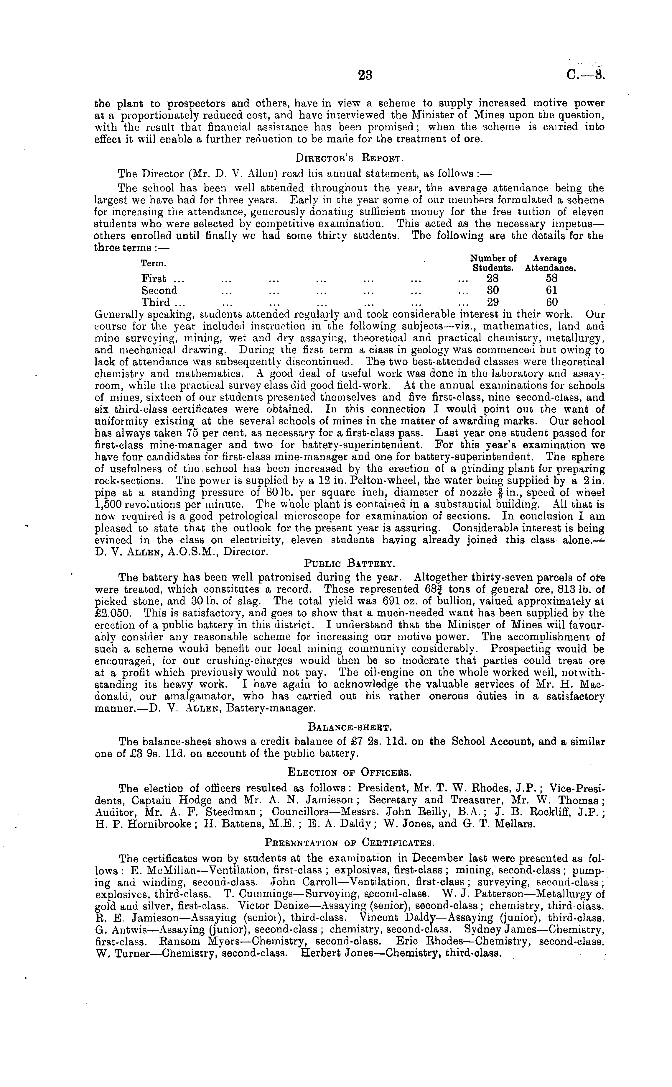 the plant to prospectors and others, have in view a scheme to supply increased motive power at a proportionately reduced cost, and have interviewed the Minister of Mines upon the question, with the result that financial assistance has been promised; when the scheme is carried into effect it will enable a further reduction to be made for the treatment of ore. Dibectob's Eepoet. The Director (Mr. D. V. Allen) read his annual statement, as follows : — The school has been well attended throughout the year, the average attendance being the largest we have had for three years. Early in the year some of our members formulated a scheme for increasing the attendance, generously donating sufficient money for the free tuition of eleven students who were selected by competitive examination. This acted as the necessary impetus— others enrolled until finally we had some thirty students. The following are the details for the three terms :— T . Number of Average Students. Attendance. First ... ... ... ... ... ... ... 28 58 Second ... ... ... ... ... ... 30 61 Third ... ... ... ... ... ... ... 29 60 Generally speaking, students attended regularly and took considerable interest in their work. Our course for the year included instruction in the following subjects—viz., mathematics, land and mine surveying, mining, wet and dry assaying, theoretical and practical chemistry, metallurgy, and mechanical drawing. During the first term a class in geology was commenced but owing to lack of attendance was subsequently discontinued. The two best-attended classes were theoretical chemistry and mathematics. A good deal of useful work was done in the laboratory and assayroom, while the practical survey class did good field-work. At the annual examinations for schools of mines, sixteen of our students presented themselves and five first-class, nine second-class, and six third-class certificates were obtained. In this connection I would point out the want of uniformity existing at the several schools of mines in the matter of awarding marks. Our school has always taken 75 per cent, as necessary for a first-class pass. Last year one student passed for first-class mine-manager and two for battery-superintendent. For this year's examination we have four candidates for first-class mine-manager and one for battery-superintendent. The sphere of usefulness of the.school has been increased by the erection of a grinding plant for preparing rock-sections. The power is supplied by al2 in. Pelton-wheel, the water being supplied by a 2 in. pipe at a standing pressure of 801b. per square inch, diameter of nozzle fin., speed of wheel 1,500 revolutions per minute. The whole plant is contained in a substantial building. All that is now required is a good petrological microscope for examination of sections. In conclusion I am pleased to state that the outlook for the present year is assuring. Considerable interest is being evinced in the class on electricity, eleven students having already joined this class alone.— D. V. Allen, A.0.5.M., Director. Public Batteey. The battery has been well patronised during the year. Altogether thirty-seven parcels of ore were treated, which constitutes a record. These represented 68f tons of general ore, 813 lb. of picked stone, and 30 lb. of slag. The total yield was 691 oz. of bullion, valued approximately at £2,050. This is satisfactory, and goes to show that a much-needed want has been supplied by the erection of a public battery in this district. I understand that the Minister of Mines will favourably consider any reasonable scheme for increasing our motive power. The accomplishment of such a scheme would benefit our local mining community considerably. Prospecting would be encouraged, for our crushing-charges would then be so moderate that parties could treat ore at a profit which previously would not Day. The oil-engine on the whole worked well, notwithstanding its heavy work. I have again to acknowledge the valuable services of Mr. H. Macdonald, our amalgamator, who has carried out his rather onerous duties in a satisfactory manner.—D. V. Allen, Battery-manager. Balance-sheet. The balance-sheet shows a credit balance of £7 2s. lid. on the School Account, and a similar one of £3 9s. lid. on account of the public battery. Election of Officeks. The election of officers resulted as follows: President, Mr. T. W. Ehodes, J. P.; Vice-Presi-dents, Captain Hodge and Mr. A. N. Jamieson ; Secretary and Treasurer, Mr. W. Thomas ; Auditor, Mr. A. F. Steedman ; Councillors—Messrs. John Reilly, 8.A.; J. B. Rockliff, J.P. ; H. P. Hornibrooke; 11. Battens, M.E. ; E. A. Daldy; W. Jones, and G. T. Mellars. Peesentation of Ceetificates. The certificates won by students at the examination in December last were presented as follows :E. McMillan—Ventilation, first-class ; explosives, first-class ; mining, second-class; pumping and winding, second-class. John Carroll—Ventilation, first-class ; surveying, second-class ; explosives, third-class. T. Cummings—Surveying, second-class. W. J. Patterson—Metallurgy of gold and silver, first-class. Victor Denize —Assaying (senior), second-class; chemistry, third-class. E. E. Jamieson—Assaying (senior), third-class. Vincent Daldy —Assaying (junior), third-class. G. Antwis —Assaying (junior), second-class ; chemistry, second-class. Sydney James—Chemistry, first-class. Eansom Myers—Chemistry, second-class. Eric Rhodes—Chemistry, second-class. W. Turner—Chemistry, second-class. Herbert Jones—Chemistry, third-class.