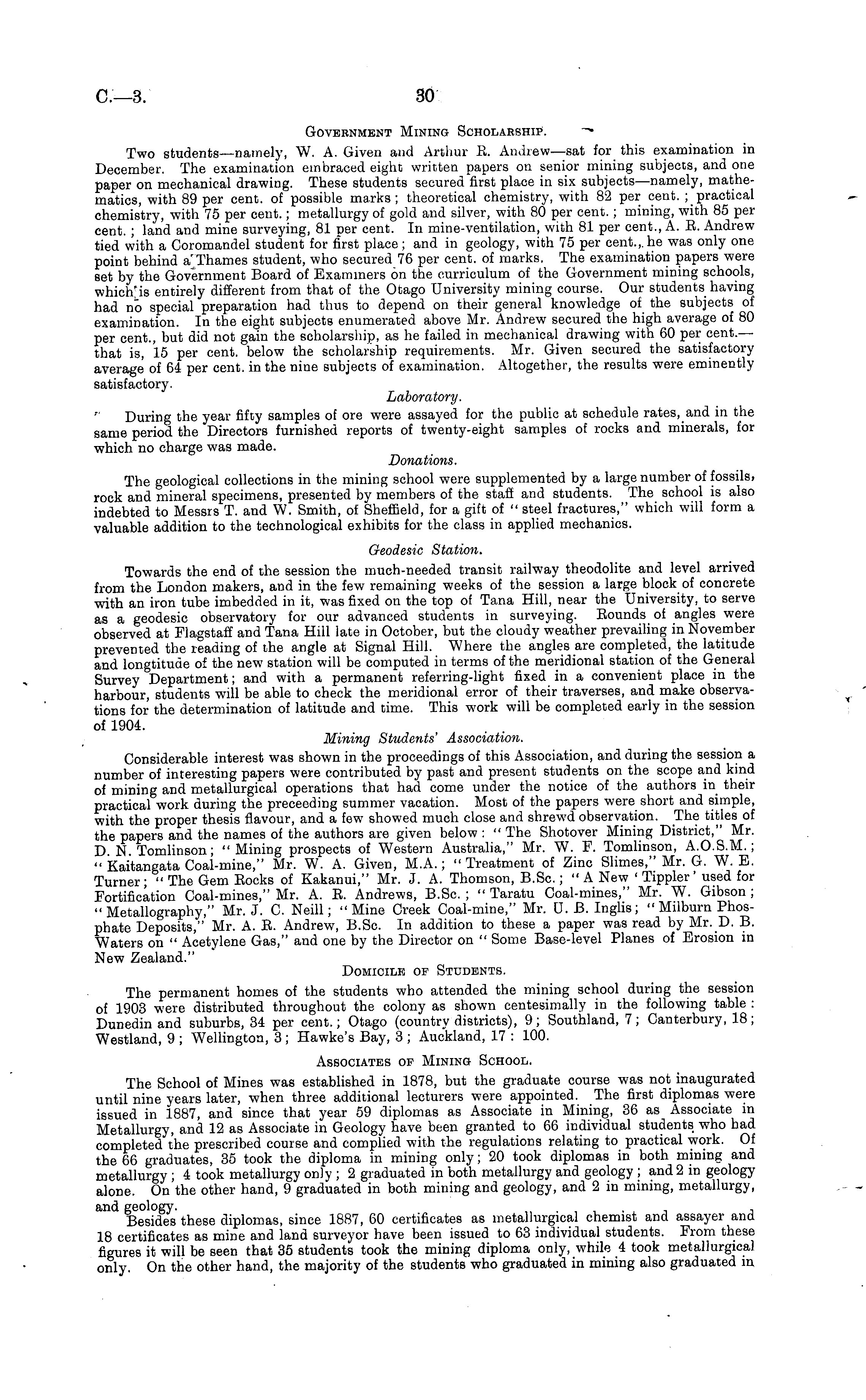 Government Mining Scholarship. "* Two students—namely, W. A. Given and Arthur E. Andrew—sat for this examination in December. The examination embraced eight written papers on senior mining subjects, and one paper on mechanical drawing. These students secured first place in six subjects—namely, mathematics, with 89 per cent, of possible marks; theoretical chemistry, with 82 per cent. ;_ practical chemistry, with 75 per cent.; metallurgy of gold and silver, with 80 per cent. ; mining, with 85 per cent. ; land and mine surveying, 81 per cent. In mine-ventilation, with 81 per cent., A. E. Andrew tied with a Coromandel student for first place; and in geology, with 75 per cent.,, he was only one point behind a'Thames student, who secured 76 per cent, of marks. The examination papers were set by the Government Board of Examiners on the curriculum of the Government mining schools, which"is entirely different from that of the Otago University mining course. Our students having had no special preparation had thus to depend on their general knowledge of the subjects of examination. In the eight subjects enumerated above Mr. Andrew secured the high average of 80 per cent., but did not gain the scholarship, as he failed in mechanical drawing with 60 per cent.— that is, 15 per cent, below the scholarship requirements. Mr. Given secured the satisfactory average of 64 per cent, in the nine subjects of examination. Altogether, the results were eminently satisfactory. Laboratory. During the year fifty samples of ore were assayed for the public at schedule rates, and in the same period the Directors furnished reports of twenty-eight samples of rocks and minerals, for which no charge was made. Donations. The geological collections in the mining school were supplemented by a large number of fossils. rock and mineral specimens, presented by members of the staff and students. The school is also indebted to Messrs T. and W. Smith, of Sheffield, for a gift of " steel fractures," which will form a valuable addition to the technological exhibits for the class in applied mechanics. Geodesic Station. Towards the end of the session the much-needed transit railway theodolite and level arrived from the London makers, and in the few remaining weeks of the session a large block of concrete with an iron tube imbedded in it, was fixed on the top of Tana Hill, near the University, to serve as a geodesic observatory for our advanced students in surveying. Bounds of angles were observed at Flagstaff and Tana Hill late in October, but the cloudy weather prevailing in November prevented the reading of the angle at Signal Hill. Where the angles are completed, the latitude and longtitude of the new station will be computed in terms of the meridional station of the General Survey Department; and with a permanent referring-light fixed in a convenient place in the harbour, students will be able to check the meridional error of their traverses, and make observations for the determination of latitude and time. This work will be completed early in the session of 1904. Mining Students' Association. Considerable interest was shown in the proceedings of this Association, and during the session a number of interesting papers were contributed by past and present students on the scope and kind of mining and metallurgical operations that had come under the notice of the authors in their practical work during the preceeding summer vacation. Most of the papers were short and simple, with the proper thesis flavour, and a few showed much close and shrewd observation. The titles of the papers and the names of the authors are given below : " The Shotover Mining District," Mr. D N. Tomlinson; "Mining prospects of Western Australia," Mr. W. F. Tomlinson, A.0.5.M.; " Kaitangata Coal-mine," Mr. W. A. Given, M.A.; " Treatment of Zinc Slimes," Mr. G. W. E. Turner; " The Gem Eocks of Kakanui," Mr. J. A. Thomson, B.Sc.; " A New ' Tippler' used for Fortification Coal-mines," Mr. A. E. Andrews, B.Sc. ; " Taratu Coal-mines," Mr. W. Gibson ; "Metallography," Mr. J. C. Neill; "Mine Creek Coal-mine," Mr. U. B. Inglis; " Milburn Phosphate Deposits," Mr. A. E. Andrew, B.Sc. In addition to these a paper was read by Mr. D. B. Waters on " Acetylene Gas," and one by the Director on " Some Base-level Planes of Erosion in New Zealand." Domicile op Students. The permanent homes of the students who attended the mining school during the session of 1903 were distributed throughout the colony as shown centesimally in the following table : Dunedin and suburbs, 34 per cent.; Otago (country districts), 9; Southland, 7; Canterbury, 18; Westland, 9 ; Wellington, 3; Hawke's Bay, 3 ; Auckland, 17 : 100. Associates op Mining School. The School of Mines was established in 1878, but the graduate course was not inaugurated until nine years later, when three additional lecturers were appointed. The first diplomas were issued in 1887, and since that year 59 diplomas as Associate in Mining, 36 as Associate in Metallurgy, and 12 as Associate in Geology have been granted to 66 individual students who had completed the prescribed course and complied with the regulations relating to practical work. Of the 66 graduates, 35 took the diploma in mining only; 20 took diplomas in both mining and metallurgy ; 4 took metallurgy only ; 2 graduated in both metallurgy and geology ; and 2 in geology alone. On the other hand, 9 graduated in both mining and geology, and 2in mining, metallurgy, find. £T6oloffv. Besides these diplomas, since 1887, 60 certificates as metallurgical chemist and assayer and 18 certificates as mine and land surveyor have been issued to 63 individual students. From these figures it will be seen that 35 students took the mining diploma only, while 4 took metallurgical only. On the other hand, the majority of the students who graduated in mining also graduated in