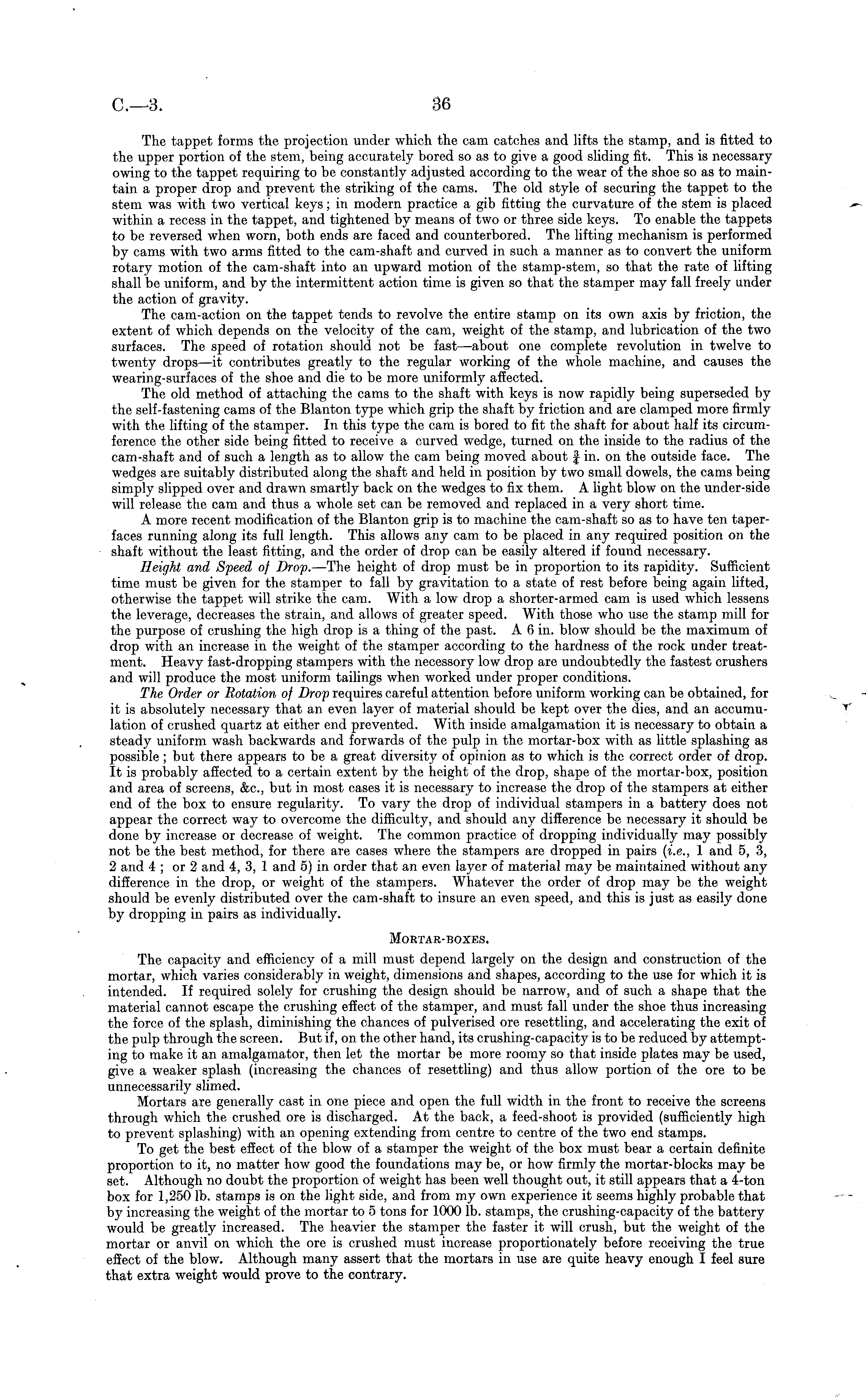The tappet forms the projection under which the cam catches and lifts the stamp, and is fitted to the upper portion of the stem, being accurately bored so as to give a good sliding fit. This is necessary owing to the tappet requiring to be constantly adjusted according to the wear of the shoe so as to maintain a proper drop and prevent the striking of the cams. The old style of securing the tappet to the stem was with two vertical keys; in modern practice a gib fitting the curvature of the stem is placed within a recess in the tappet, and tightened by means of two or three side keys. To enable the tappets to be reversed when worn, both ends are faced and counterbored. The lifting mechanism is performed by cams with two arms fitted to the cam-shaft and curved in such a manner as to convert the uniform rotary motion of the cam-shaft into an upward motion of the stamp-stem, so that the rate of lifting shall be uniform, and by the intermittent action time is given so that the stamper may fall freely under the action of gravity. The cam-action on the tappet tends to revolve the entire stamp on its own axis by friction, the extent of which depends on the velocity of the cam, weight of the stamp, and lubrication of the two surfaces. The speed of rotation should not be fast —about one complete revolution in twelve to twenty drops —it contributes greatly to the regular working of the whole machine, and causes the wearing-surfaces of the shoe and die to be more uniformly affected. The old method of attaching the cams to the shaft with keys is now rapidly being superseded by the self-fastening cams of the Blanton type which grip the shaft by friction and are clamped more firmly with the lifting of the stamper. In this type the cam is bored to fit the shaft for about half its circumference the other side being fitted to receive a curved wedge, turned on the inside to the radius of the cam-shaft and of such a length as to allow the cam being moved about f in. on the outside face. The wedges are suitably distributed along the shaft and held in position by two small dowels, the cams being simply slipped over and drawn smartly back on the wedges to fix them. A light blow on the under-side will release the cam and thus a whole set can be removed and replaced in a very short time. A more recent modification of the Blanton grip is to machine the cam-shaft so as to have ten taperfaces running along its full length. This allows any cam to be placed in any required position on the shaft without the least fitting, and the order of drop can be easily altered if found necessary. Height and Speed of Drop. —The height of drop must be in proportion to its rapidity. Sufficient time must be given for the stamper to fall by gravitation to a state of rest before being again lifted, otherwise the tappet will strike the cam. With a low drop a shorter-armed cam is used which lessens the leverage, decreases the strain, and allows of greater speed. With those who use the stamp mill for the purpose of crushing the high drop is a thing of the past. A 6 in. blow should be the maximum of drop with an increase in the weight of the stamper according to the hardness of the rock under treatment. Heavy fast-dropping stampers with the necessory low drop are undoubtedly the fastest crushers and will produce the most uniform tailings when worked under proper conditions. The Order or Rotation of Drop requires careful attention before uniform working can be obtained, for it is absolutely necessary that an even layer of material should be kept over the dies, and an accumulation of crushed quartz at either end prevented. With inside amalgamation it is necessary to obtain a steady uniform wash backwards and forwards of the pulp in the mortar-box with as little splashing as possible ; but there appears to be a great diversity of opinion as to which is the correct order of drop. It is probably affected to a certain extent by the height of the drop, shape of the mortar-box, position and area of screens, &c, but in most cases it is necessary to increase the drop of the stampers at either end of the box to ensure regularity. To vary the drop of individual stampers in a battery does not appear the correct way to overcome the difficulty, and should any difference be necessary it should be done by increase or decrease of weight. The common practice of dropping individually may possibly not be the best method, for there are cases where the stampers are dropped in pairs (i.e., 1 and 5, 3, 2 and 4 ; or 2 and 4, 3, 1 and 5) in order that an even layer of material may be maintained without any difference in the drop, or weight of the stampers. Whatever the order of drop may be the weight should be evenly distributed over the cam-shaft to insure an even speed, and this is just as easily done by dropping in pairs as individually. Mortar-boxes. The capacity and efficiency of a mill must depend largely on the design and construction of the mortar, which varies considerably in weight, dimensions and shapes, according to the use for which it is intended. If required solely for crushing the design should be narrow, and of such a shape that the material cannot escape the crushing effect of the stamper, and must fall under the shoe thus increasing the force of the splash, diminishing the chances of pulverised ore resettling, and accelerating the exit of the pulp through the screen. But if, on the other hand, its crushing-capacity is to be reduced by attempting to make it an amalgamator, then let the mortar be more roomy so that inside plates may be used, give a weaker splash (increasing the chances of resettling) and thus allow portion of the ore to be unnecessarily slimed. Mortars are generally cast in one piece and open the full width in the front to receive the screens through which the crushed ore is discharged. At the back, a feed-shoot is provided (sufficiently high to prevent splashing) with an opening extending from centre to centre of the two end 