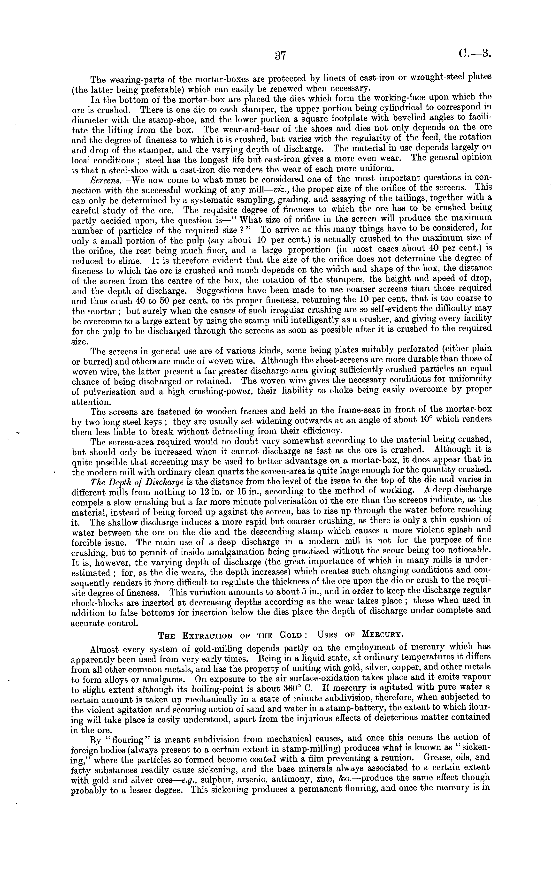 The wearing-parts of the mortar-boxes are protected by liners of cast-iron or wrought-steel plates (the latter being preferable) which can easily be renewed when necessary. In the bottom of the mortar-box are placed the dies which form the working-face upon which the ore is crushed. There is one die to each stamper, the upper portion being cylindrical to correspond m diameter with the stamp-shoe, and the lower portion a square footplate with bevelled angles to facilitate the lifting from the box. The wear-and-tear of the shoes and dies not only depends on the ore and the degree of fineness to which it is crushed, but varies with the regularity of the feed, the rotation and drop of the stamper, and the varying depth of discharge. The material in use depends largely on local conditions ; steel has the longest life but cast-iron gives a more even wear. The general opinion is that a steel-shoe with a cast-iron die renders the wear of each more uniform. Screens.—We now come to what must be considered one of the most important questions in connection with the successful working of any mill—wz., the proper size of the orifice of the screens. This can only be determined by a systematic sampling, grading, and assaying of the tailings, together with a careful study of the ore. The requisite degree of fineness to which the ore has to be crushed being partly decided upon, the question is—" What size of orifice in the screen will produce the maximum number of particles of the required size ? " To arrive at this many things have to be considered, for only a small portion of the pulp (say about 10 per cent.) is actually crushed to the maximum size of the orifice, the rest being much finer, and a large proportion (in most cases about 40 per cent.) is reduced to slime. It is therefore evident that the size of the orifice does not determine the degree of fineness to which the ore is crushed and much depends on the width and shape of the box, the distance of the screen from the centre of the box, the rotation of the stampers, the height and speed of drop, and the depth of discharge. Suggestions have been made to use coarser screens than those required and thus crush 40 to 50 per cent, to its proper fineness, returning the 10 per cent, that is too coarse to the mortar ; but surely when the causes of such irregular crushing are so self-evident the difficulty may be overcome to a large extent by using the stamp mill intelligently as a crusher, and giving every facility for the pulp to be discharged through the screens as soon as possible after it is crushed to the required The screens in general use are of various kinds, some being plates suitably perforated (either plain or burred) and others are made of woven wire. Although the sheet-screens are more durable than those of woven wire, the latter present a far greater discharge-area giving sufficiently crushed particles an equal chance of being discharged or retained. The woven wire gives the necessary conditions for uniformity of pulverisation and a high crushing-power, their liability to choke being easily overcome by proper attention. The screens are fastened to wooden frames and held in the frame-seat in front of the mortar-box by two long steel keys ; they are usually set widening outwards at an angle of about 10° which renders them less liable to break without detracting from their efficiency. The screen-area required would no doubt vary somewhat according to the material being crushed, but should only be increased when it cannot discharge as fast as the ore is crushed. Although it is quite possible that screening may be used to better advantage on a mortar-box, it does appear that in the modern mill with ordinary clean quartz the screen-area is quite large enough for the quantity crushed. The Depth of Discharge is the distance from the level of the issue to the top of the die and vanes in different mills from nothing to 12 in. or 15 in., according to the method of working. A deep discharge compels a slow crushing but a far more minute pulverisation of the ore than the screens indicate, as the material, instead of being forced up against the screen, has to rise up through the water before reaching it. The shallow discharge induces a more rapid but coarser crushing, as there is only a thin cushion of water between the ore on the die and the descending stamp which causes a more violent splash and forcible issue. The main use of a deep discharge in a modern mill is not for the purpose of fine crushing, but to permit of inside amalgamation being practised without the scour being too noticeable. It is, however, the varying depth of discharge (the great importance of which in many mills is underestimated ; for, as the die wears, the depth increases) which creates such changing conditions and consequently renders it more difficult to regulate the thickness of the ore upon the die or crush to the requisite degree of fineness. This variation amounts to about 5 in., and in order to keep the discharge regular chock-blocks are inserted at decreasing depths according as the wear takes place ; these when used in addition to false bottoms for insertion below the dies place the depth of discharge under complete and accurate control. The Extraction of the Gold : Uses of Mercury. Almost every system of gold-milling depends partly on the employment of mercury which has apparently been used from very early times. Being in a liquid state, at ordinary temperatures it differs from all other common metals, and has the property of uniting with gold, silver, copper, and other metals to form alloys or amalgams. On exposure to the air surface-oxidation takes place and it emits vapour to slight extent although its boiling-point is about 360° C. If mercury is agitated with pure water a certain amount is taken up mechanically in a state of minute subdivision, therefore, when subjected to the violent agitation and scouring action of sand and water in a stamp-battery, the exten