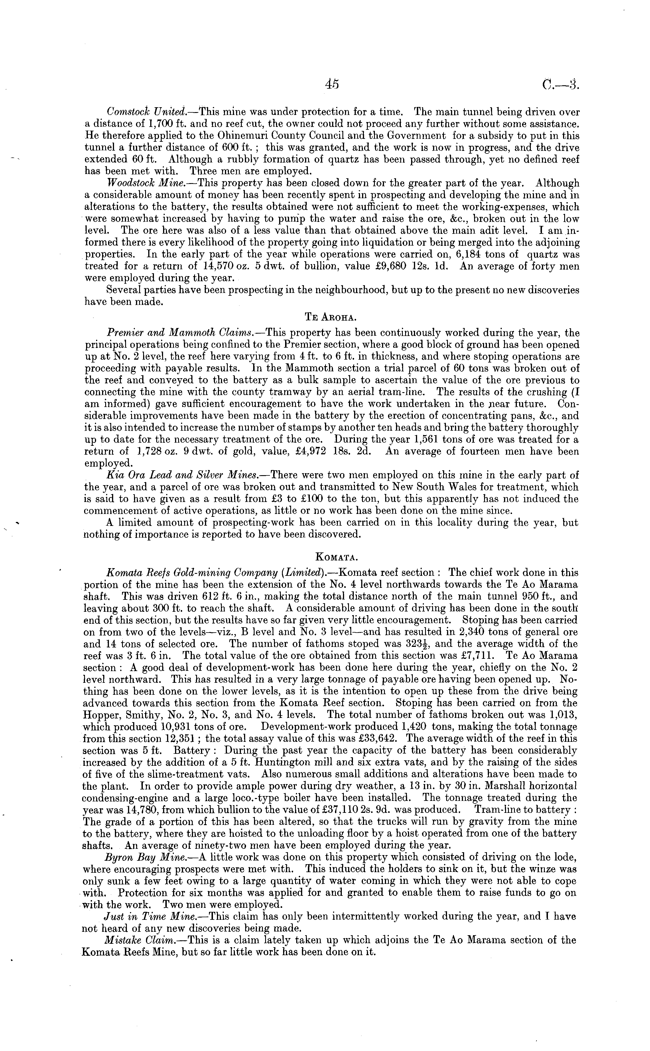 Comstock United. —This mine was under protection for a time. The main tunnel being driven over a distance of 1,700 ft. and no reef cut, the owner could not proceed any further without some assistance. He therefore applied to the Ohinemuri County Council and the Government for a subsidy to put in this tunnel a further distance of 600 ft. ; this was granted, and the work is now in progress, and the drive extended 60 ft. Although a rubbly formation of quartz has been passed through, yet no denned reef has been met with. Three men are employed. Woodstock Mine. —This property has been closed down for the greater part of the year. Although a considerable amount of money has been recently spent in prospecting and developing the mine and in alterations to the battery, the results obtained were not sufficient to meet the working-expenses, which were somewhat increased by having to pump the water and raise the ore, &c, broken out in the low level. The ore here was also of a less value than that obtained above the main adit level. lam informed there is every likelihood of the property going into liquidation or being merged into the adjoining properties. In the early part of the year while operations were carried on, 6,184 tons of quartz was treated for a return of 14,570 oz. 5 dwt. of bullion, value £9,680 12s. Id. An average of forty men were employed during the year. Several parties have been prospecting in the neighbourhood, but up to the present no new discoveries have been made. Te Aeoha. Premier and Mammoth Claims. —This property has been continuously worked during the year, the principal operations being confined to the Premier section, where a good block of ground has been opened up at No. 2 level, the reef here varying from 4 ft. to 6 ft. in thickness, and where stoping operations are proceeding with payable results. In the Mammoth section a trial parcel of 60 tons was broken out of the reef and conveyed to the battery as a bulk sample to ascertain the value of the ore previous to connecting the mine with the county tramway by an aerial tram-line. The results of the crushing (I am informed) gave sufficient encouragement to have the work undertaken in the .near future. Considerable improvements have been made in the battery by the erection of concentrating pans, &c, and it is also intended to increase the number of stamps by another ten heads and bring the battery thoroughly up to date for the necessary treatment of the ore. During the year 1,561 tons of ore was treated for a return of 1,728 oz. 9 dwt. of gold, value, £4,972 18s. 2d. An average of fourteen men have been employed. Kia Ora Lead and Silver Mines. —There were two men employed on this mine in the early part of the year, and a parcel of ore was broken out and transmitted to New South Wales for treatment, which is said to have given as a result from £3 to £100 to the ton, but this apparently has not induced the commencement of active operations, as little or no work has been done on the mine since. A limited amount of prospecting-work has been carried on in this locality during the year, but nothing of importance is reported to have been discovered. Komata. Komata Reefs Gold-mining Company (Limited). —Komata reef section : The chief work done in this portion of the mine has been the extension of the No. 4 level northwards towards the Te Ao Marama shaft. This was driven 612 ft. 6 in., making the total distance north of the main tunnel 950 ft., and leaving about 300 ft. to reach the shaft. A considerable amount of driving has been done in the south end of this section, but the results have so far given very little encouragement. Stoping has been carried on from two of the levels —viz., B level and No. 3 level—and has resulted in 2,340 tons of general ore and 14 tons of selected ore. The number of fathoms stoped was 323J, and the average width of the reef was 3 ft. 6 in. The total value of the ore obtained from this section was £7,711. Te Ao Marama section : A good deal of development-work has been done here during the year, chiefly on the No. 2 level northward. This has resulted in a very large tonnage of payable ore having been opened up. Nothing has been done on the lower levels, as it is the intention to open up these from the drive being advanced towards this section from the Komata Reef section. Stoping has been carried on from the Hopper, Smithy, No. 2, No. 3, and No. 4 levels. The total number of fathoms broken out was 1,013, which produced 10,931 tons of ore. Development-work produced 1,420 tons, making the total tonnage from this section 12,351 ; the total assay value of this was £33,642. The average width of the reef in this section was 5 ft. Battery : During the past year the capacity of the battery has been considerably increased by the addition of a 5 ft. Huntington mill and six extra vats, and by the raising of the sides of five of the slime-treatment vats. Also numerous small additions and alterations have been made to the plant. In order to provide ample power during dry weather, al3 in. by 30 in. Marshall horizontal condensing-engine and a large loco.-type boiler have been installed. The tonnage treated during the year was 14,780, from which bullion to the value of £37,110 2s. 9d. was produced. Tram-line to battery : The grade of a portion of this has been altered, so that the trucks will run by gravity from the mine to the battery, where they are hoisted to the unloading floor by a hoist operated from one of the battery shafts. An average of ninety-two men have been employed during the year. Byron Bay Mine. —A little work was done on this property which consisted of driving on the lode, where encouraging prospects were met with. This induced the holders to sink on it, but the winze was only sunk a few feet owing to a large quantity of water coming in which they were not able to cope with. Protection for six months was applied for and granted to enable them to raise funds to go on with the wor